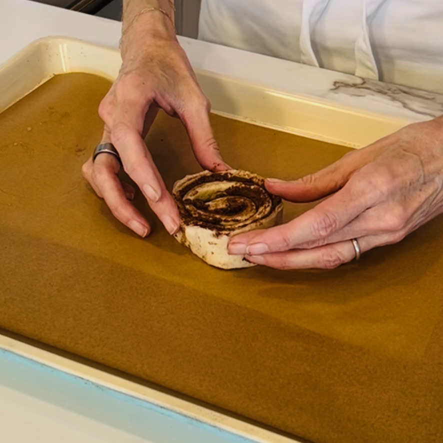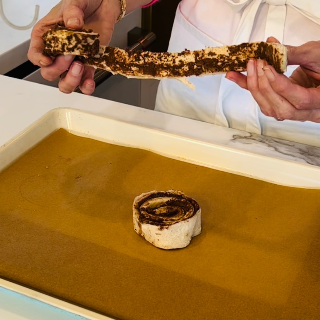 Preheat oven to 350F. On a parchment lined pan, place 1 roll in the middle. Take the remaining 4 and unroll. One at a time, wrap each roll around the center, creating one large roll.