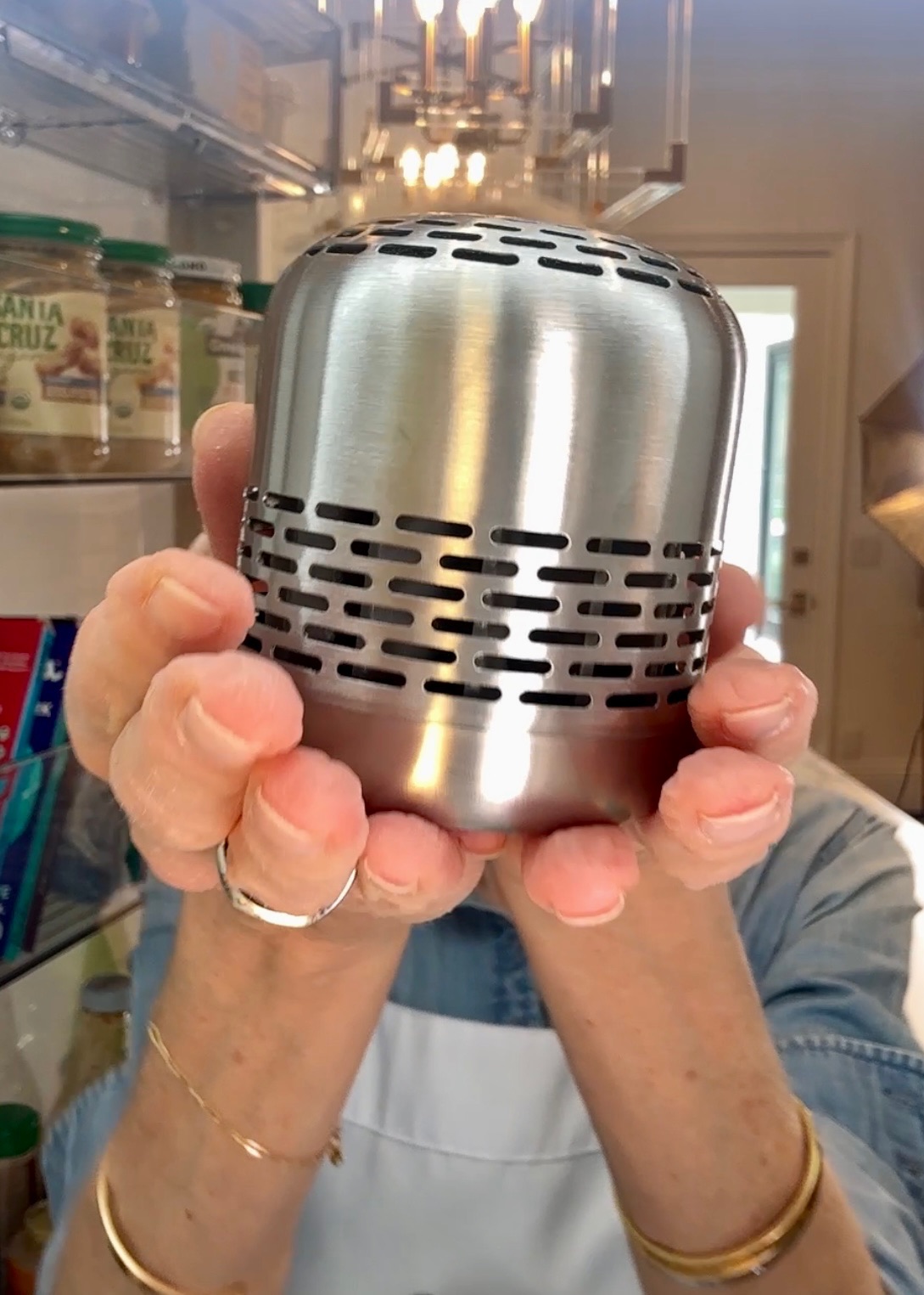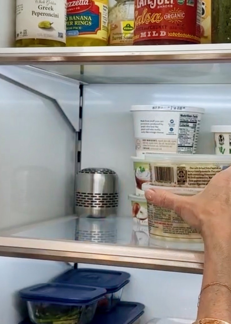 Now, onto the fridge! Baking soda is great for eliminating odors, but here’s the thing… we have to change it out every few months for the rest of our lives. I’ve got the solution! I grabbed my handy refrigerator deodorizer. If you swap your baking soda out for this guy, it lasts 10 years! Mark you calendars a decade from now. Your welcome ?