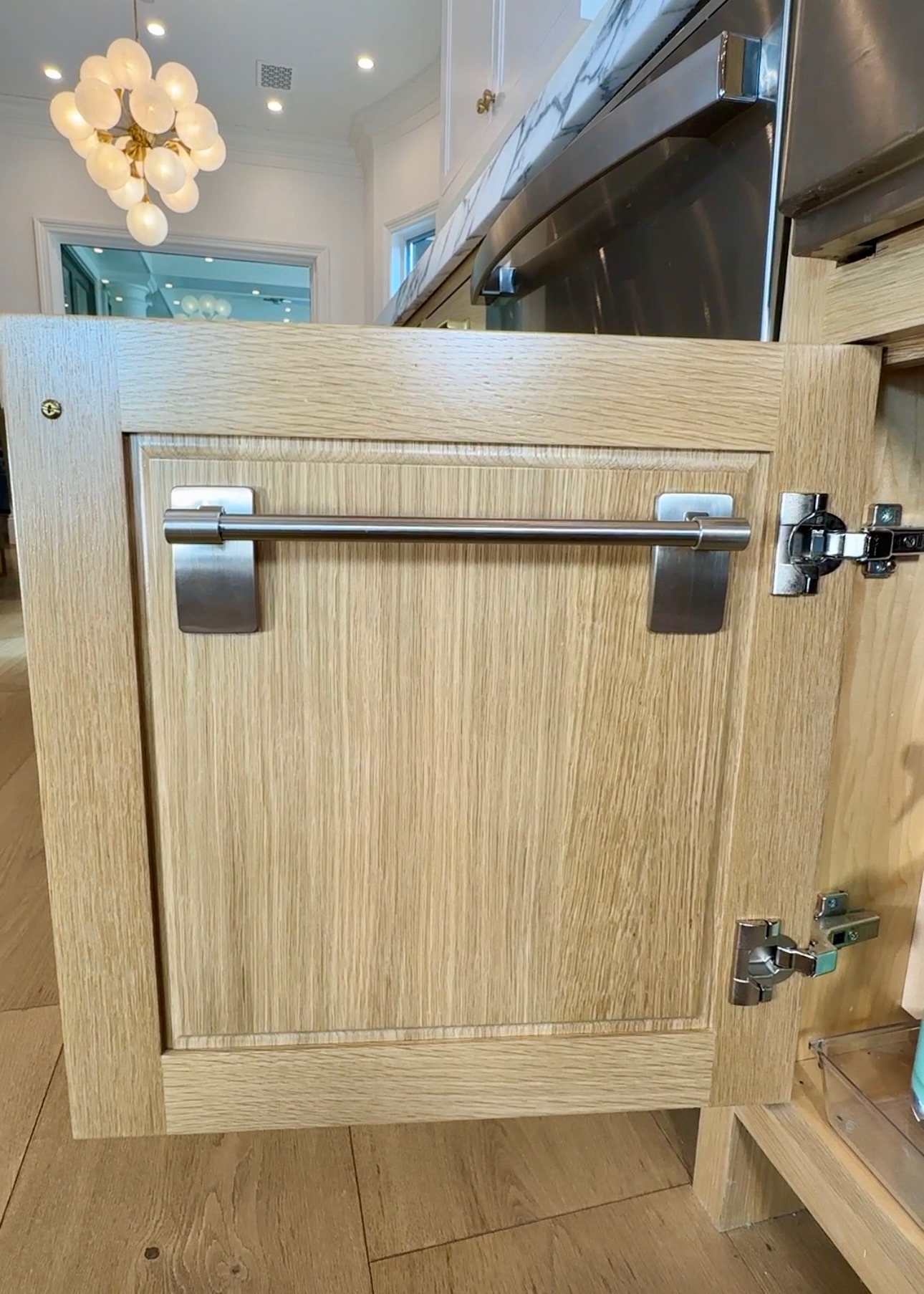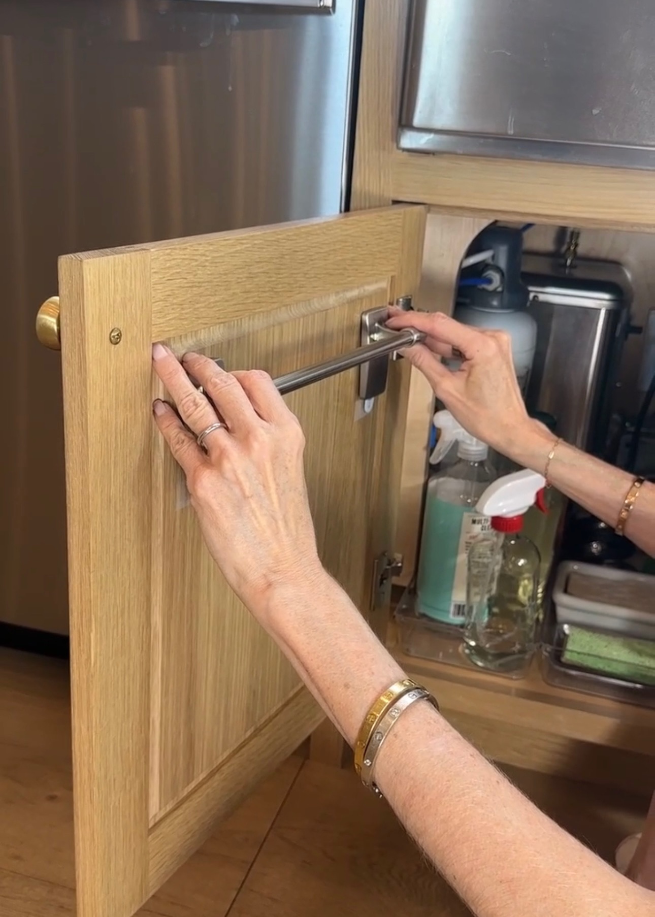 Under the kitchen sink, I’ve always wanted a towel holder! But, my Husband Scooter doesn’t love the idea of drilling holes into your cabinets. Instead, I found a bar that doesn’t require any tools! This damage free towel bar doesn’t look like a temporary bar, which makes me and Scoot happy!