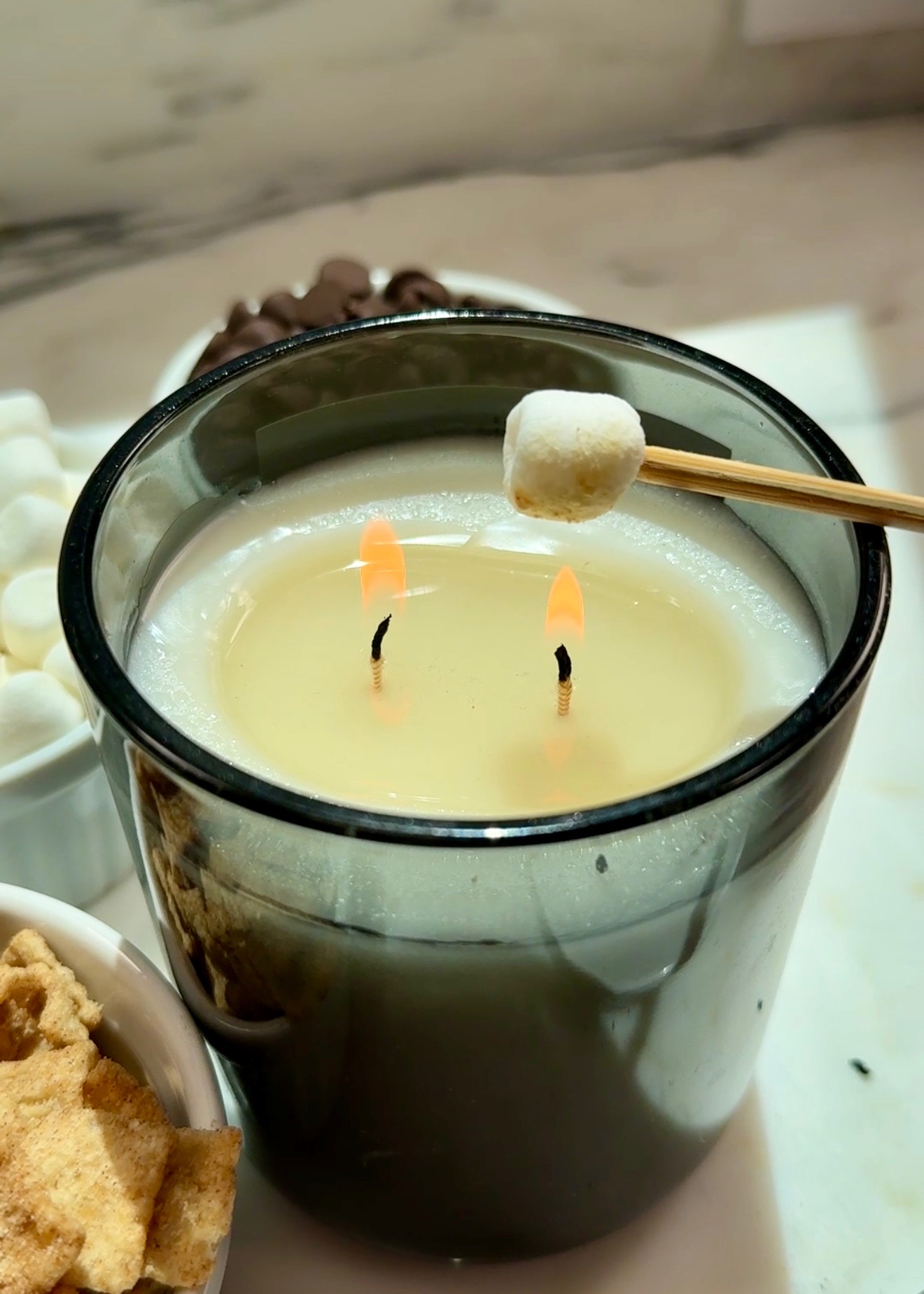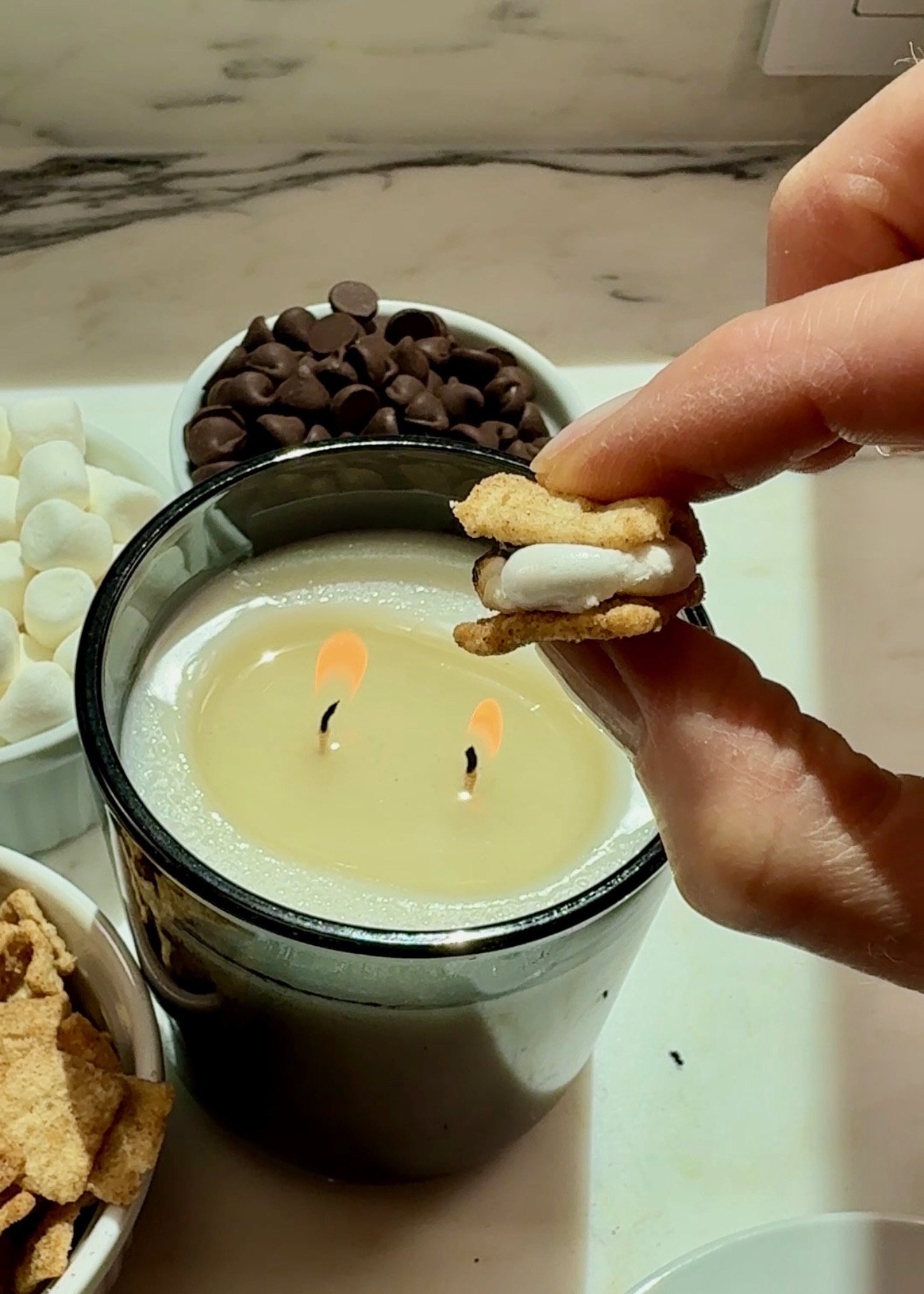 This s’more hack is great because it’s basically a mini s’more for one! You don’t even need a fire-pit for this one, just a lit non-toxic candle. All I did was toast the mini marshmallow over the candle, and add chocolate and cinnamon toast crunch pieces to finish. This made me wonder if cinnamon toast crunch cereal was actually invented for this hack!