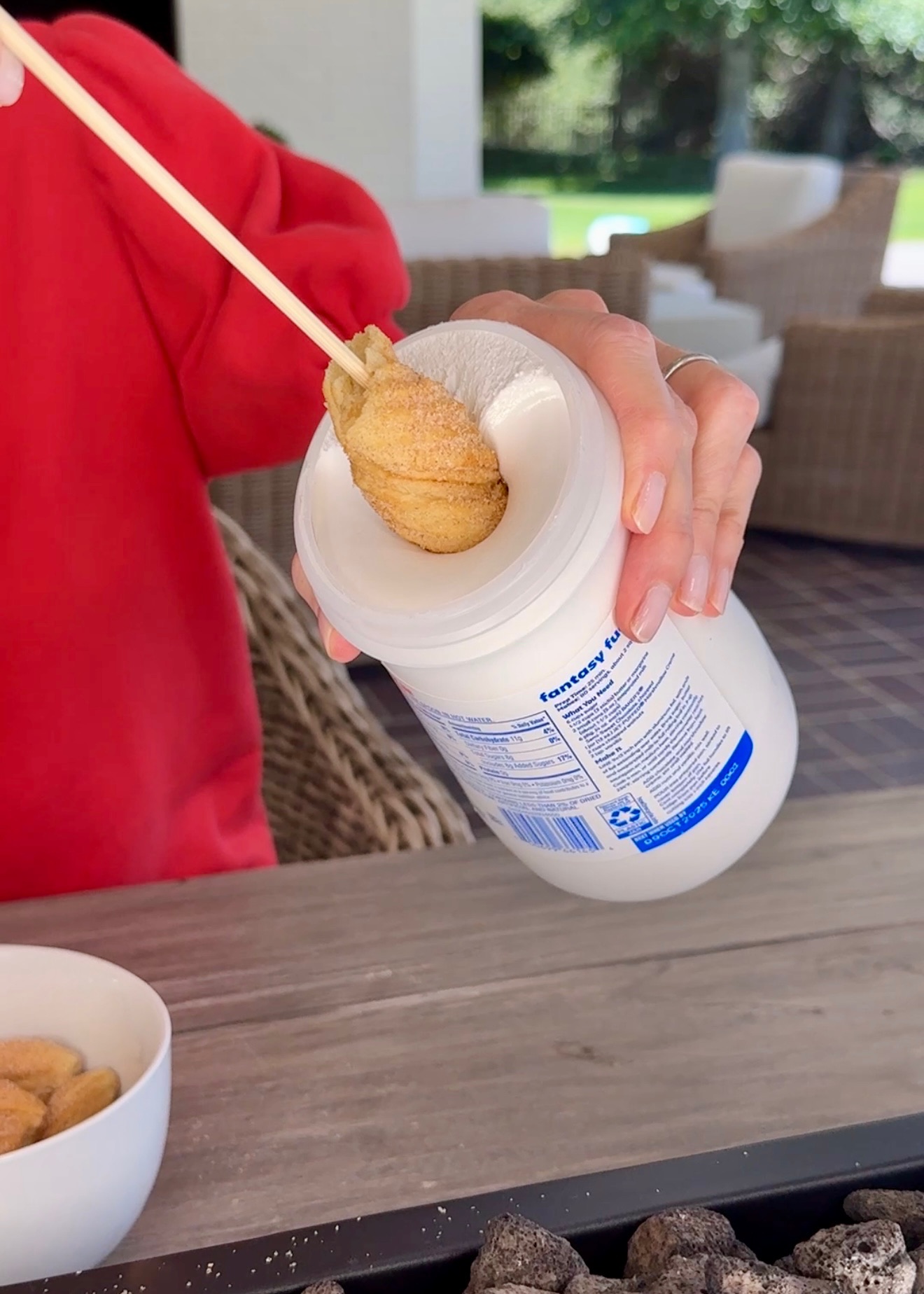 Start by tossing a chocolate bar in the sun for an easy hack to melt your chocolate. Next, it’s time to make the delicious s’more and churro combo. Simply add a churro piece to a stick, dip it in marshmallow fluff, and toast! I completely the s’murro by drizzling the melted chocolate on top and sprinkled on some graham cracker crumbs to finish. To avoid messes, add the toppings onto the s’murro over your fire!