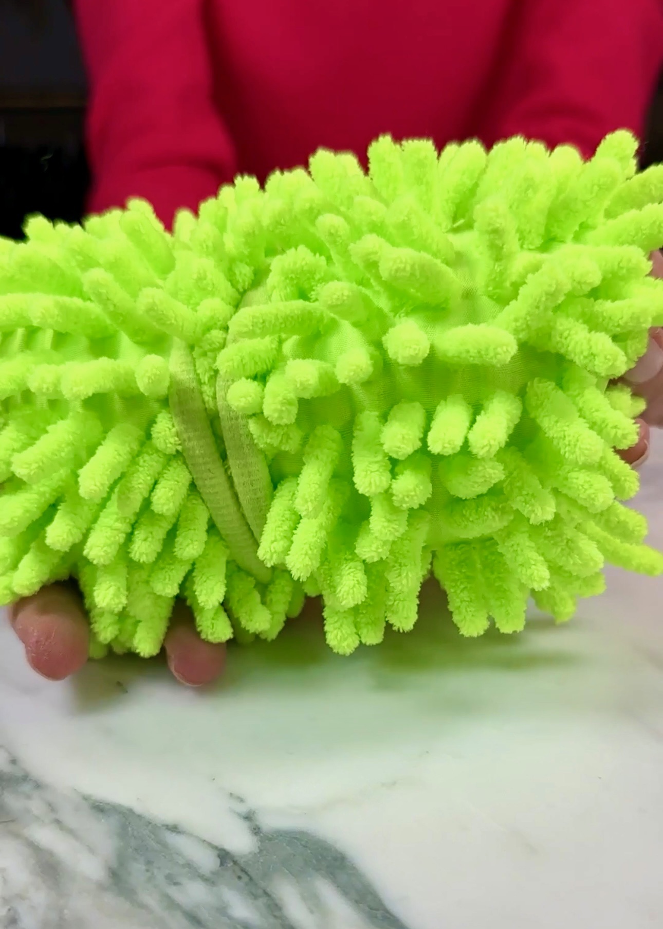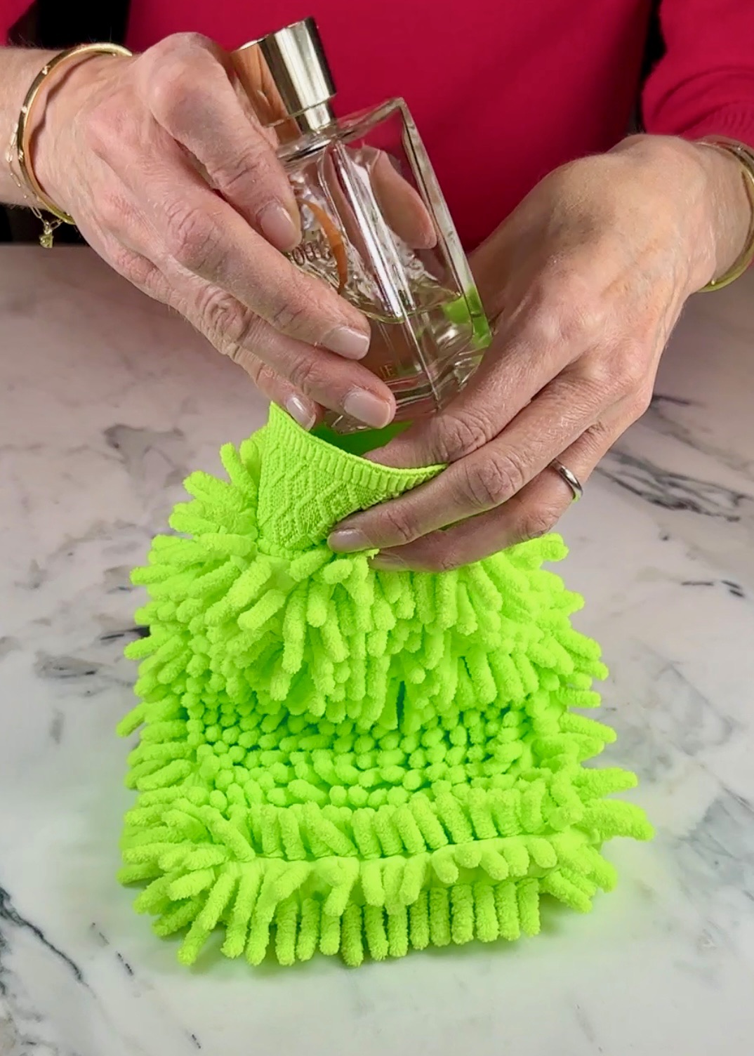 Hack #2: head over to the car section and grab a couple of microfiber mitts. It’s the perfect way to pack things like perfume bottles and delicate items. Just roll it up and secure with a hair tie.