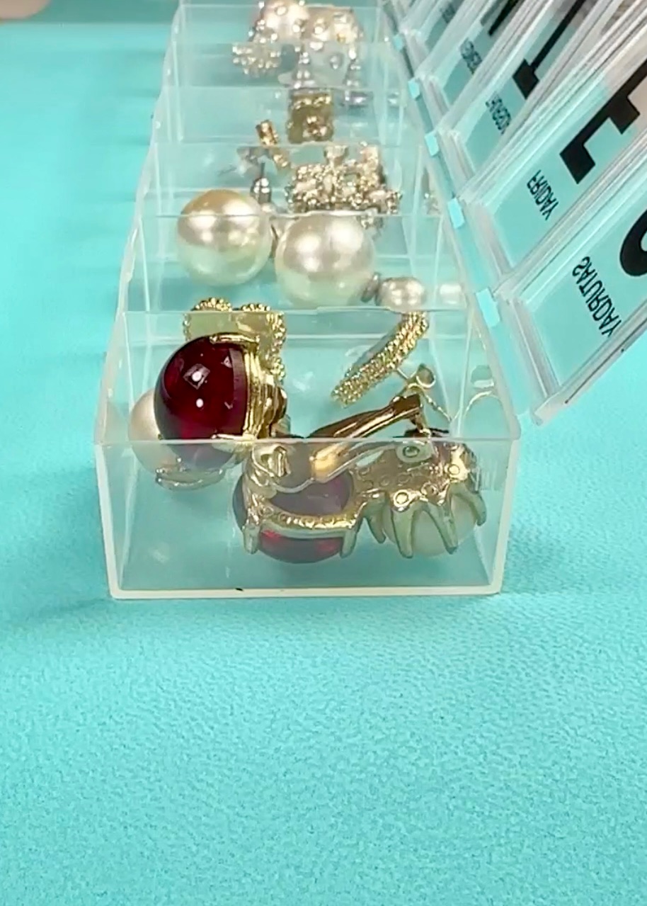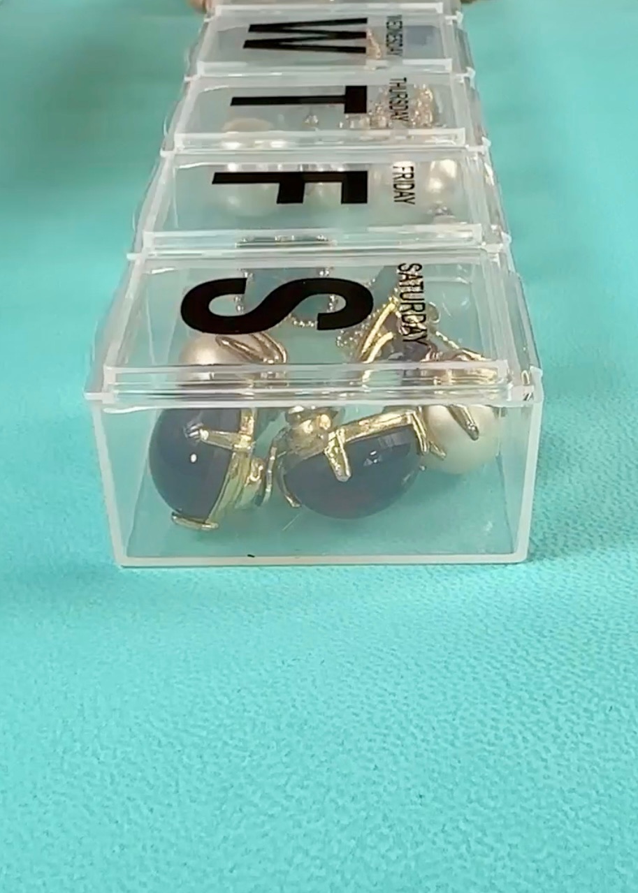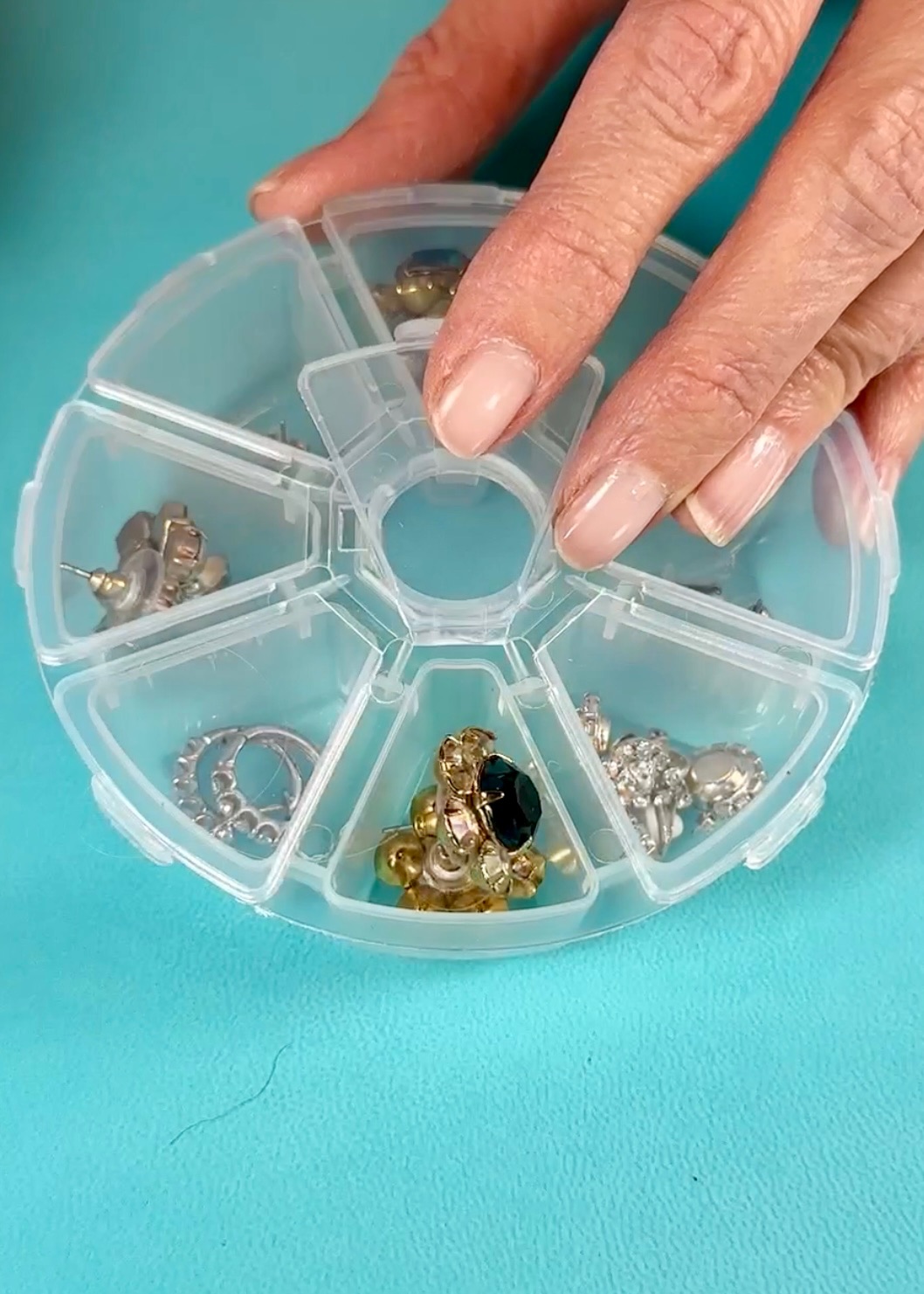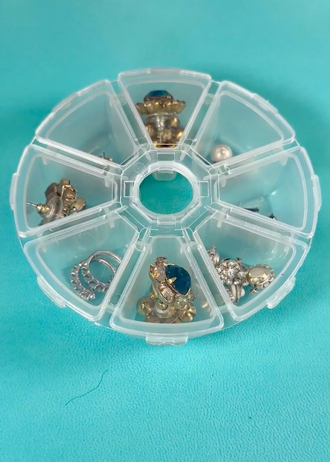 Hack #5: head over to the craft section and grab these plastic boxes. The pill box is great for your larger earrings and the craft one for the smaller.
