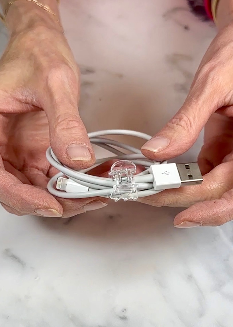 Hack #6: grab a binder pouch from the office section along with a hair clip to keep all your electronics nice and organized!