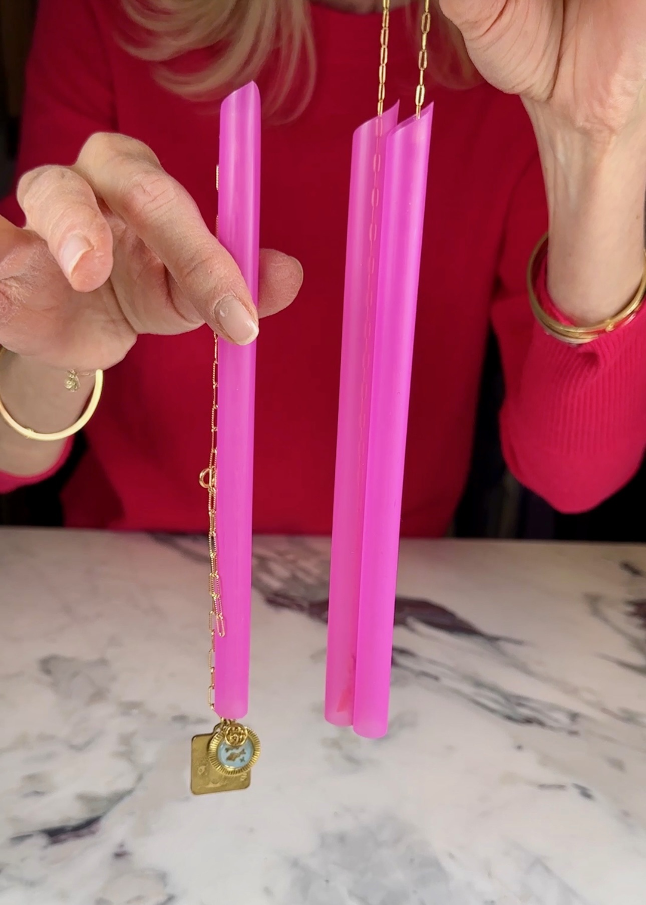Hack #1: we’re using straws to pack necklaces! You’ll need one for short necklaces and two for long. I grabbed the extra wide kind!