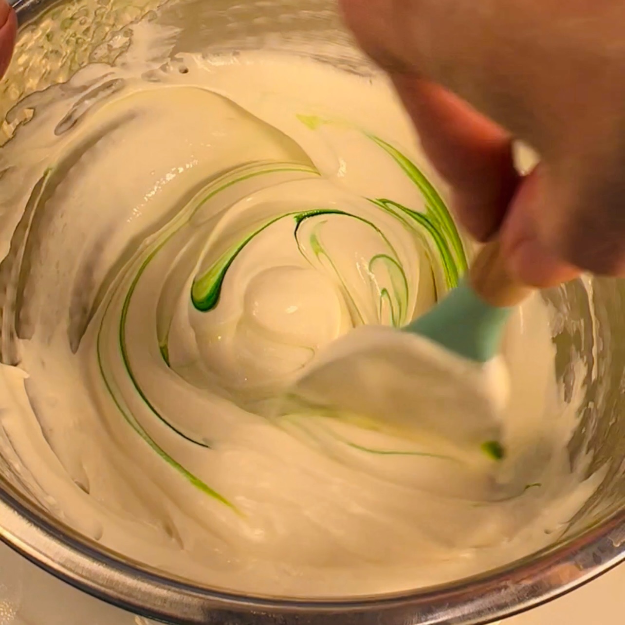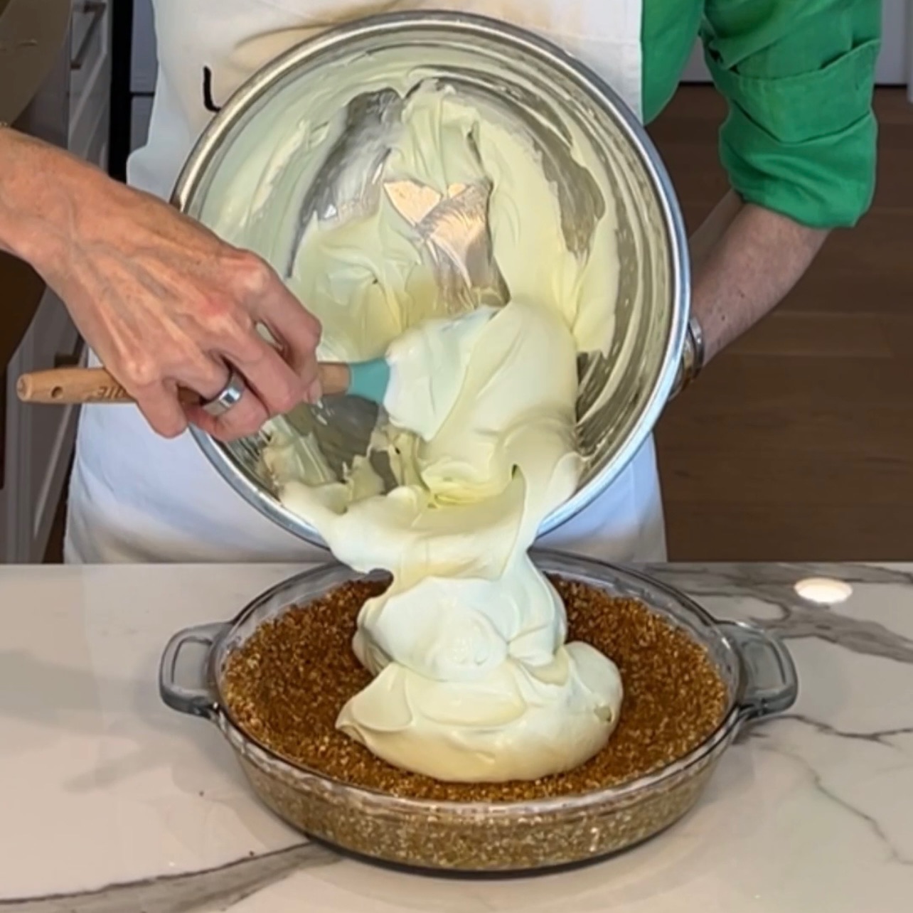 Fold in whipped cream and food coloring. Then, pour into crust and freeze at least 4 hours.