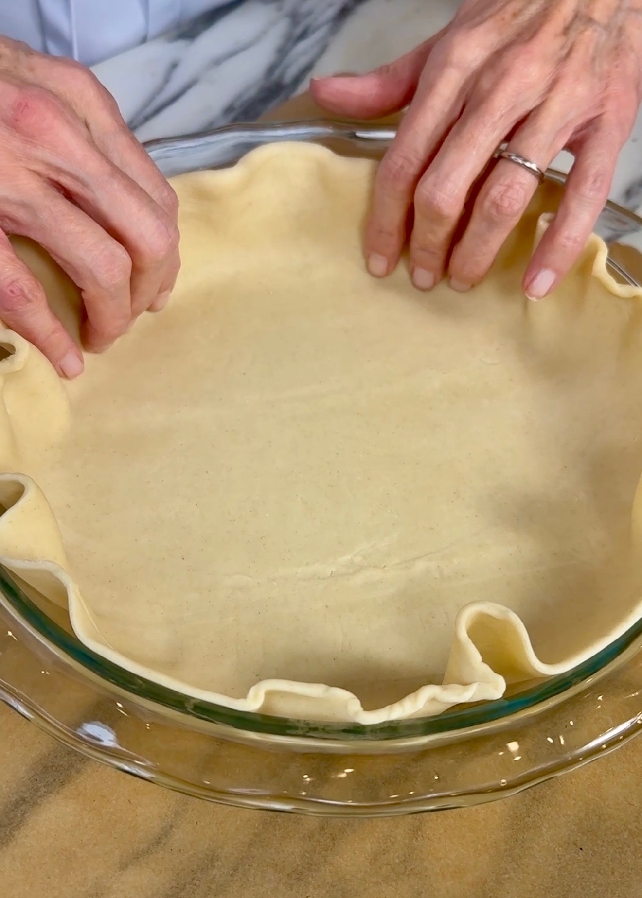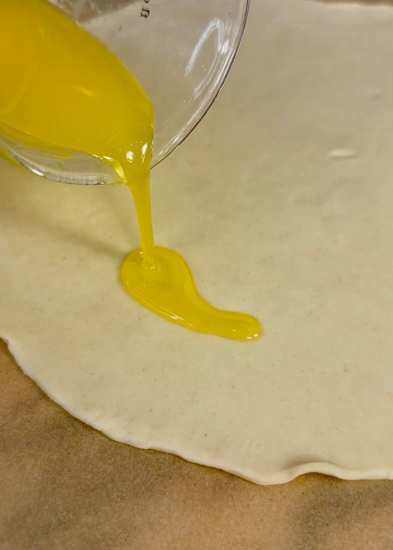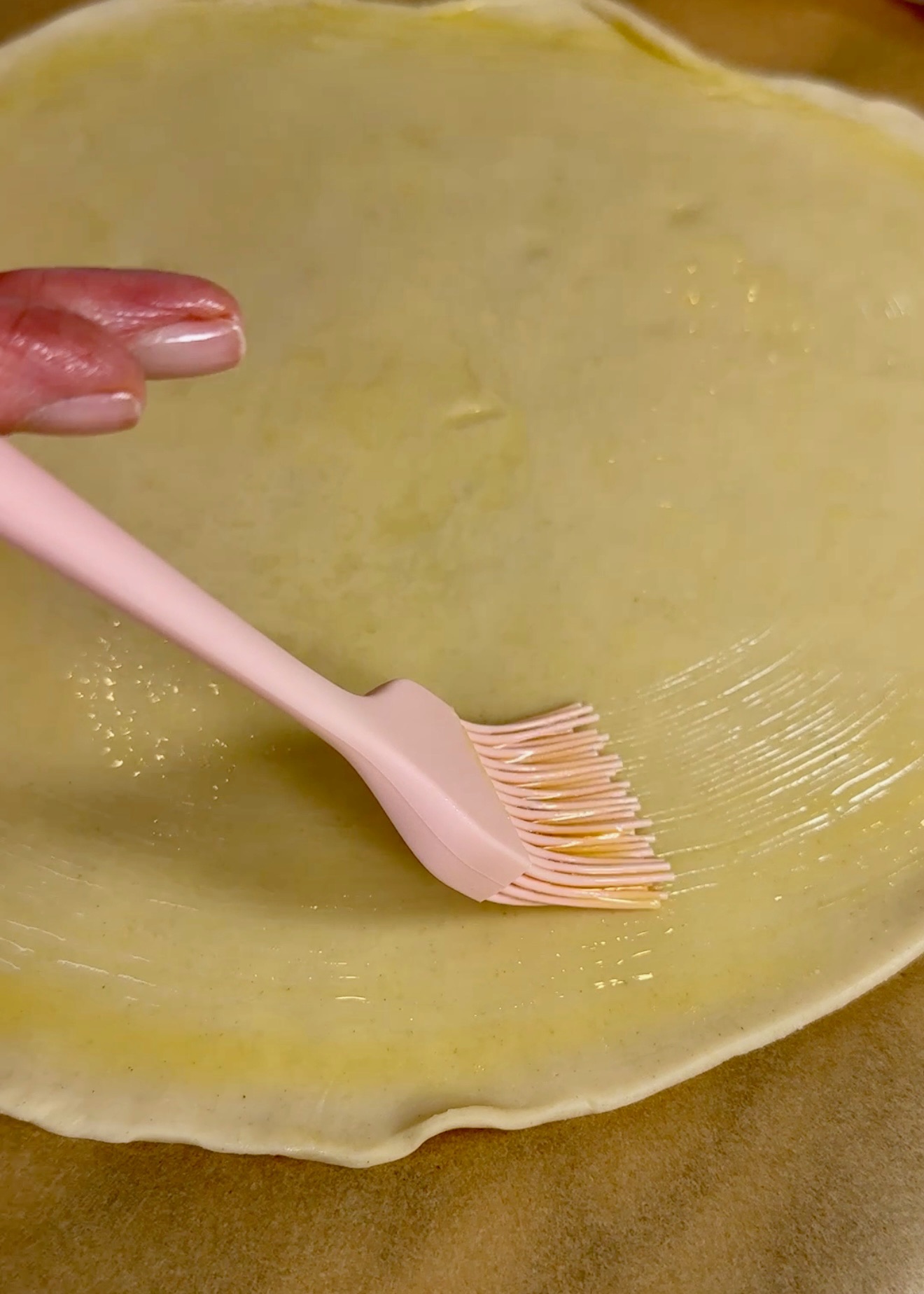 Place one pie crust into the bottom of an ungreased pie plate and spread your apple pie filling evenly on top (or filling of choice.) Then, take second crust and spread with melted butter.