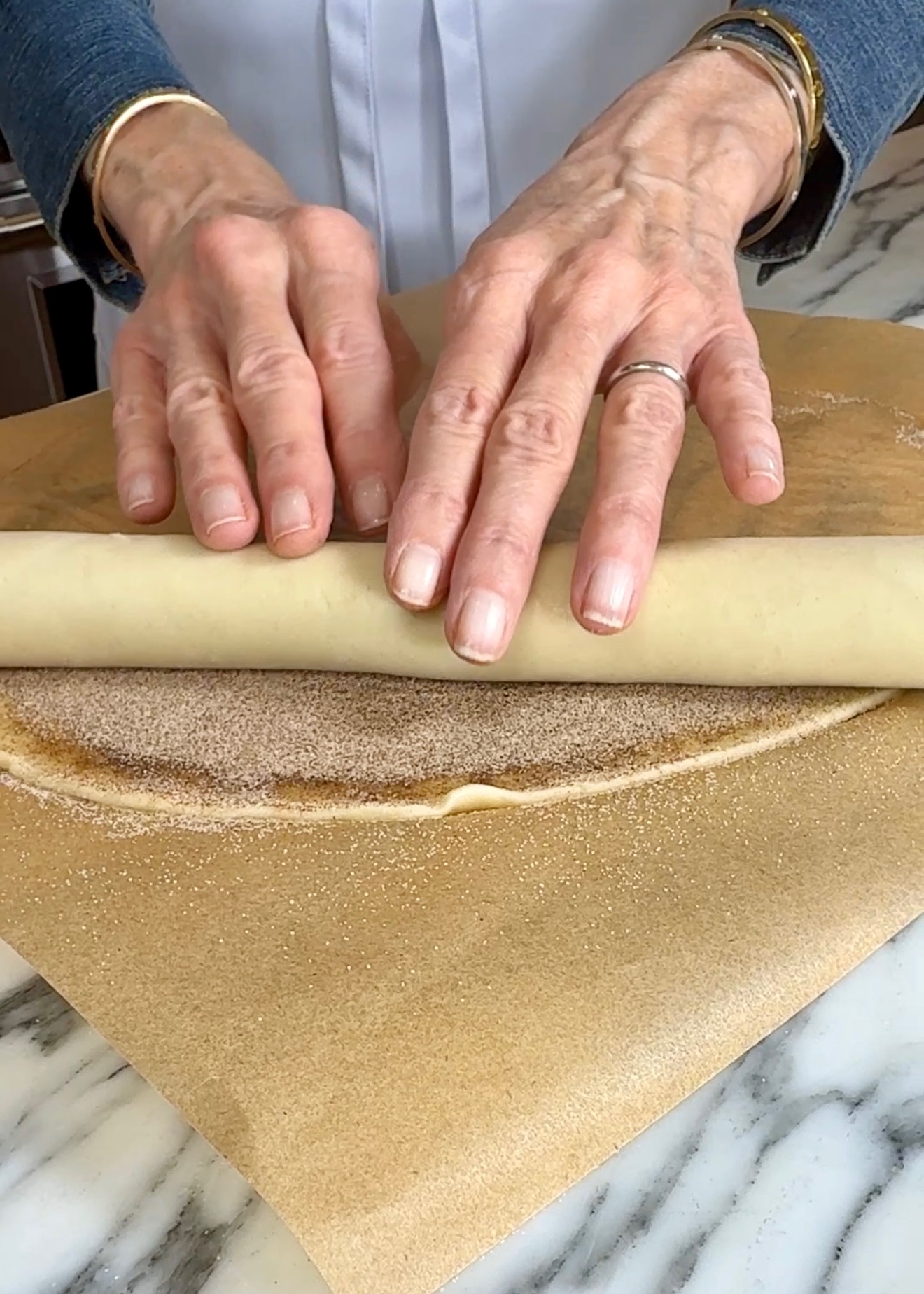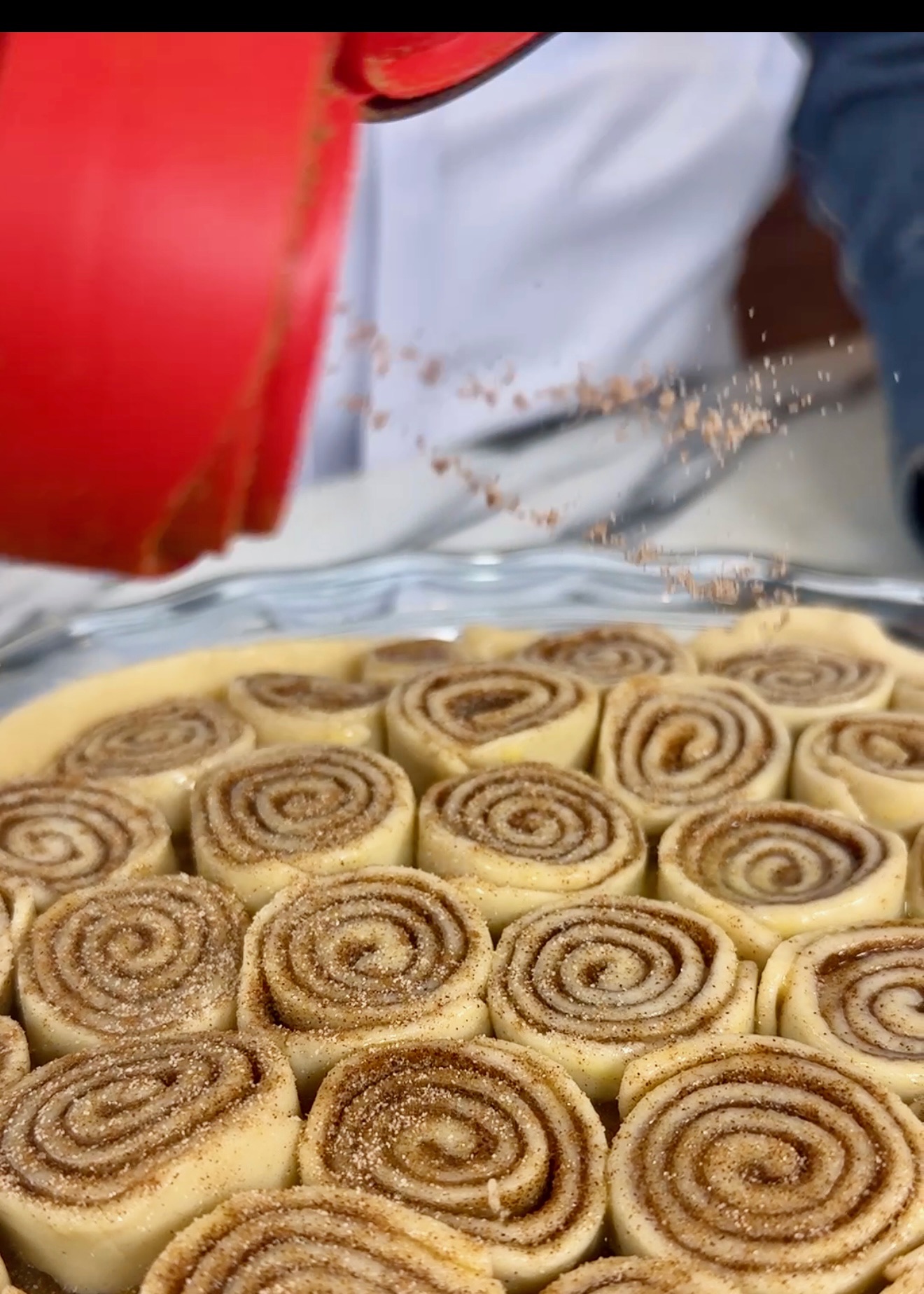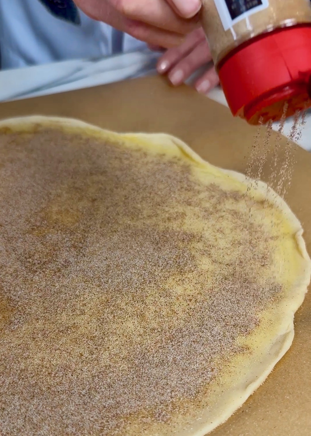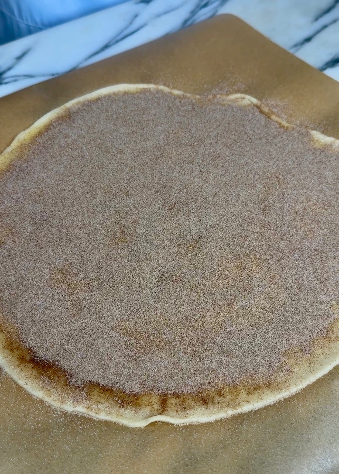 Next, sprinkle cinnamon and sugar over the butter until it looks like a thin layer of sand. Roll and cut into approx. 1/2” pieces (for larger pie plates, you made need extra, I used 1 1/2 pie crusts for this part.)