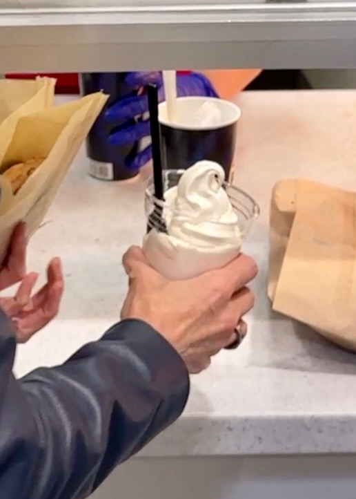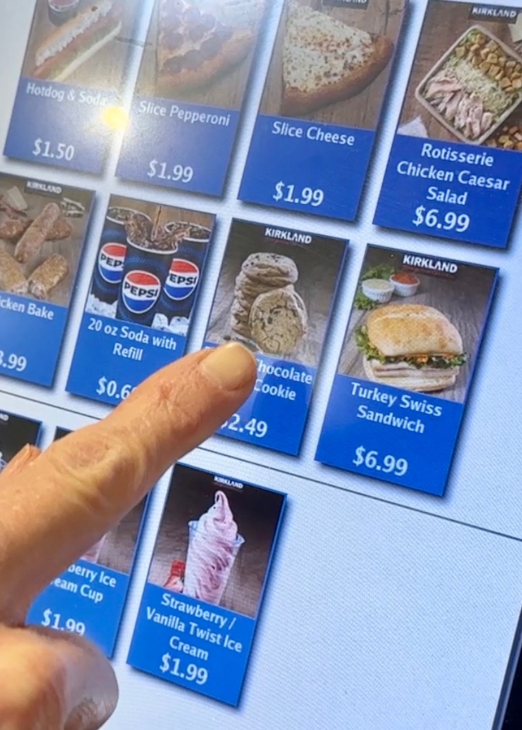 First stop is running over to the Costco food court. We are going to order one quarter of the Costco ice cream and not one, but TWO of their decadent chocolate chip cookies.