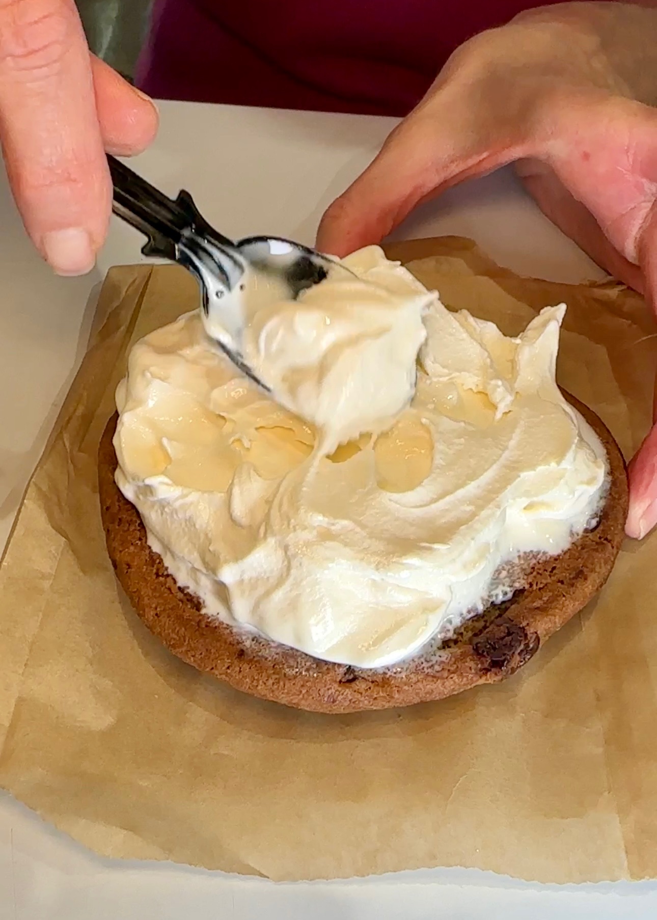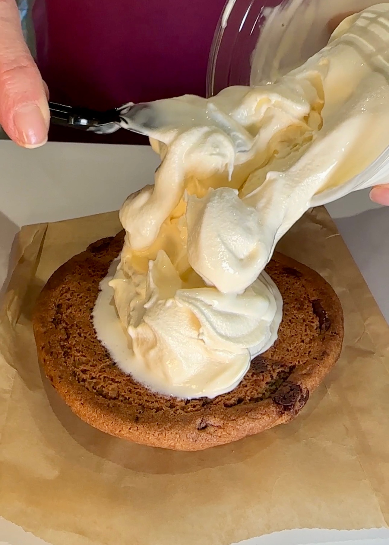 Now for the ice cream sandwich. I grabbed a spoon and spread the ice cream on the bottom cookie, then topped it off with the other. Bring someone along with you, because this guy is going to take a team effort.