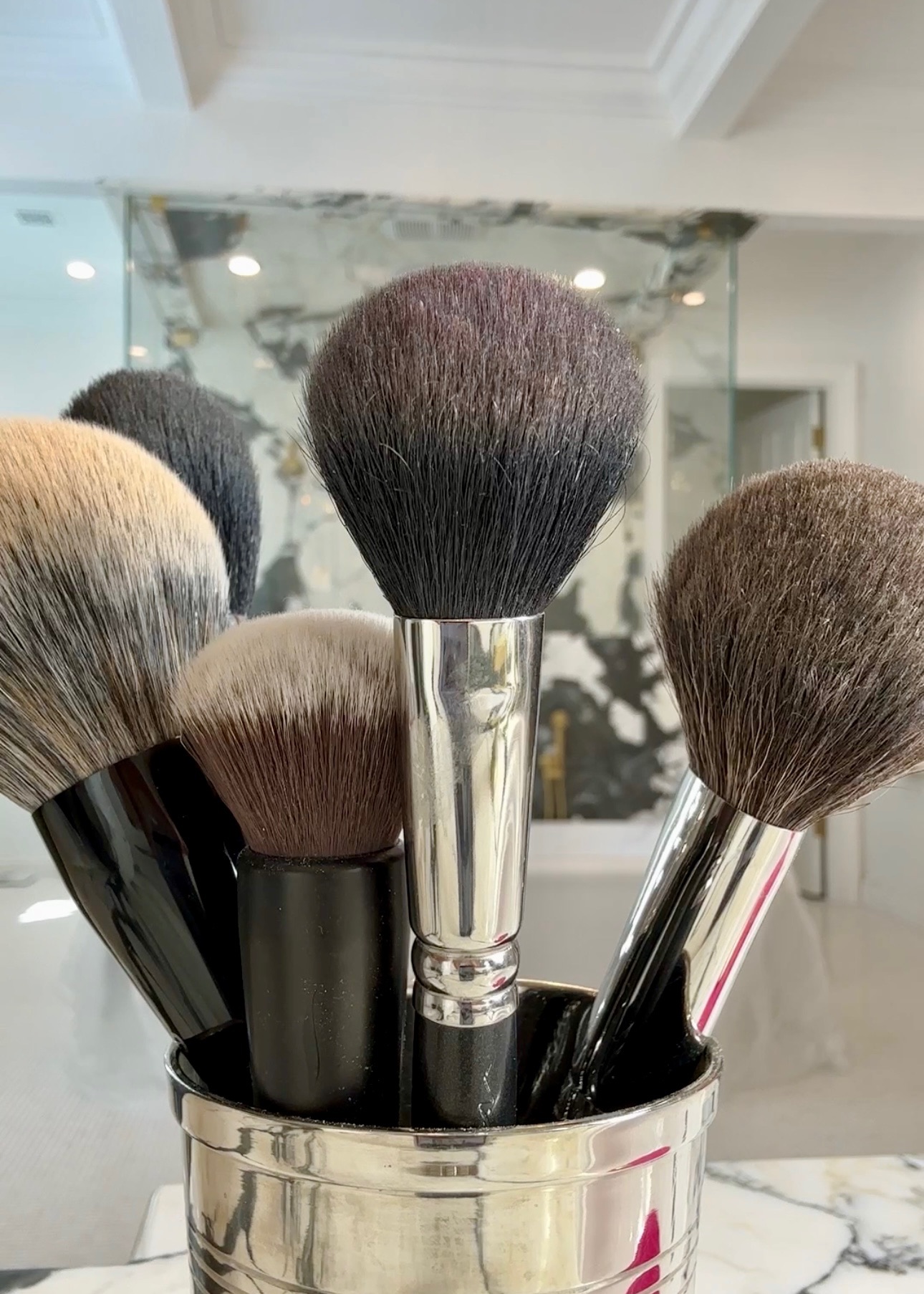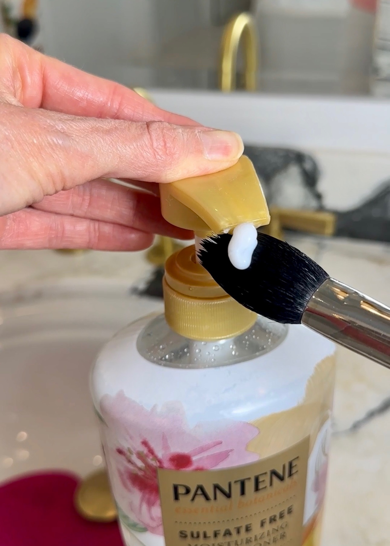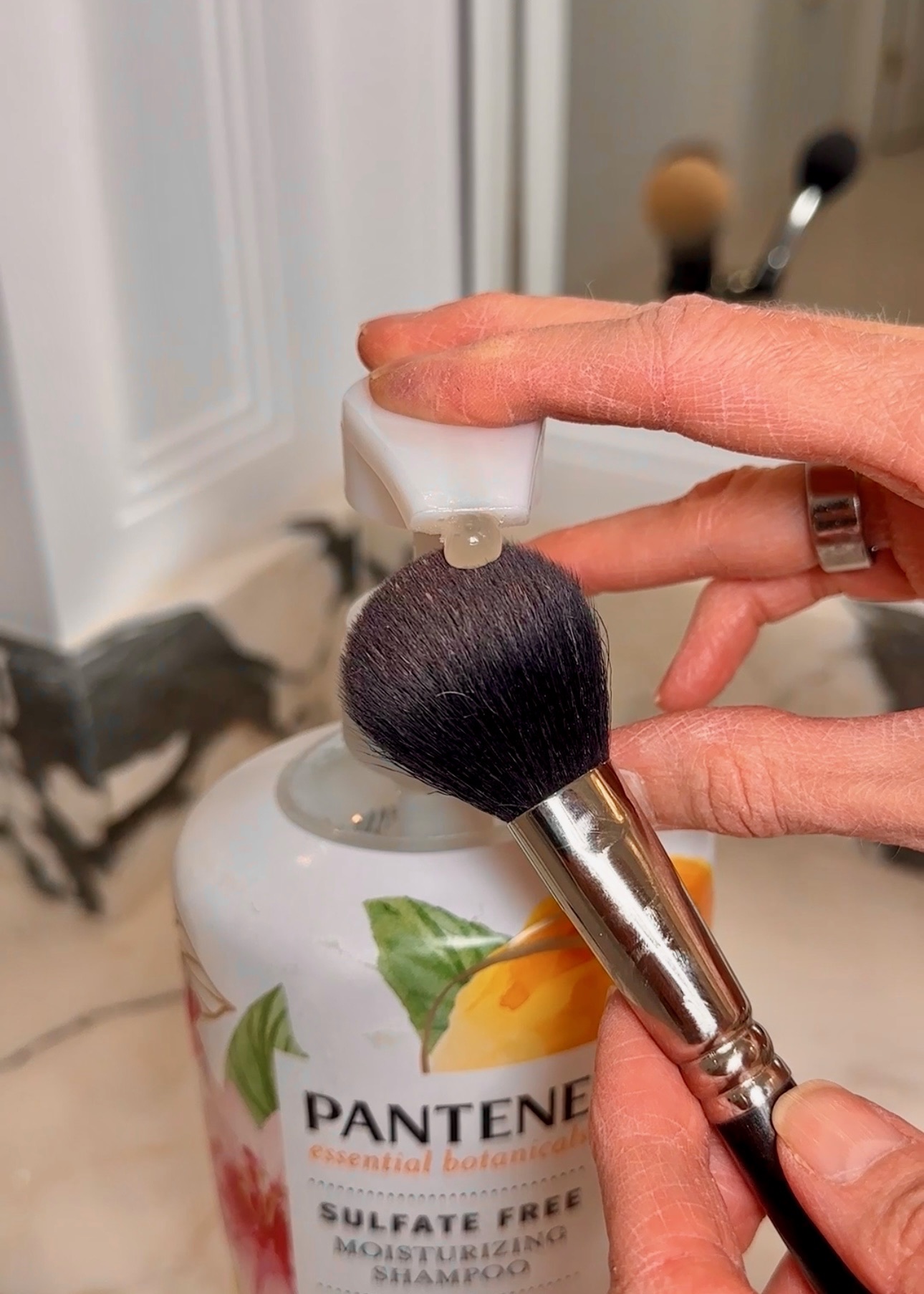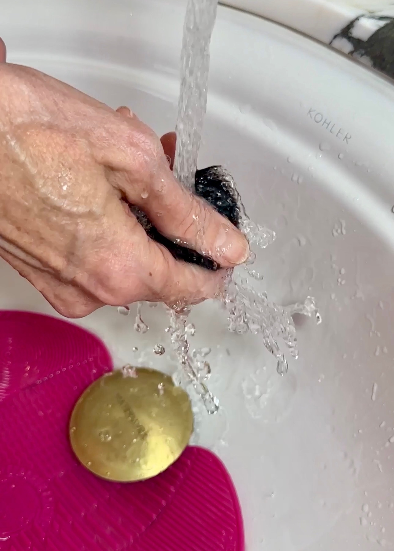 Moving on to those makeup brushes. We are going to shampoo and condition these guys, just like your washing your hair. It’s the same theory here. Using my handy makeup brush cleaning mat, lather the brush up, condition, and rinse with water.