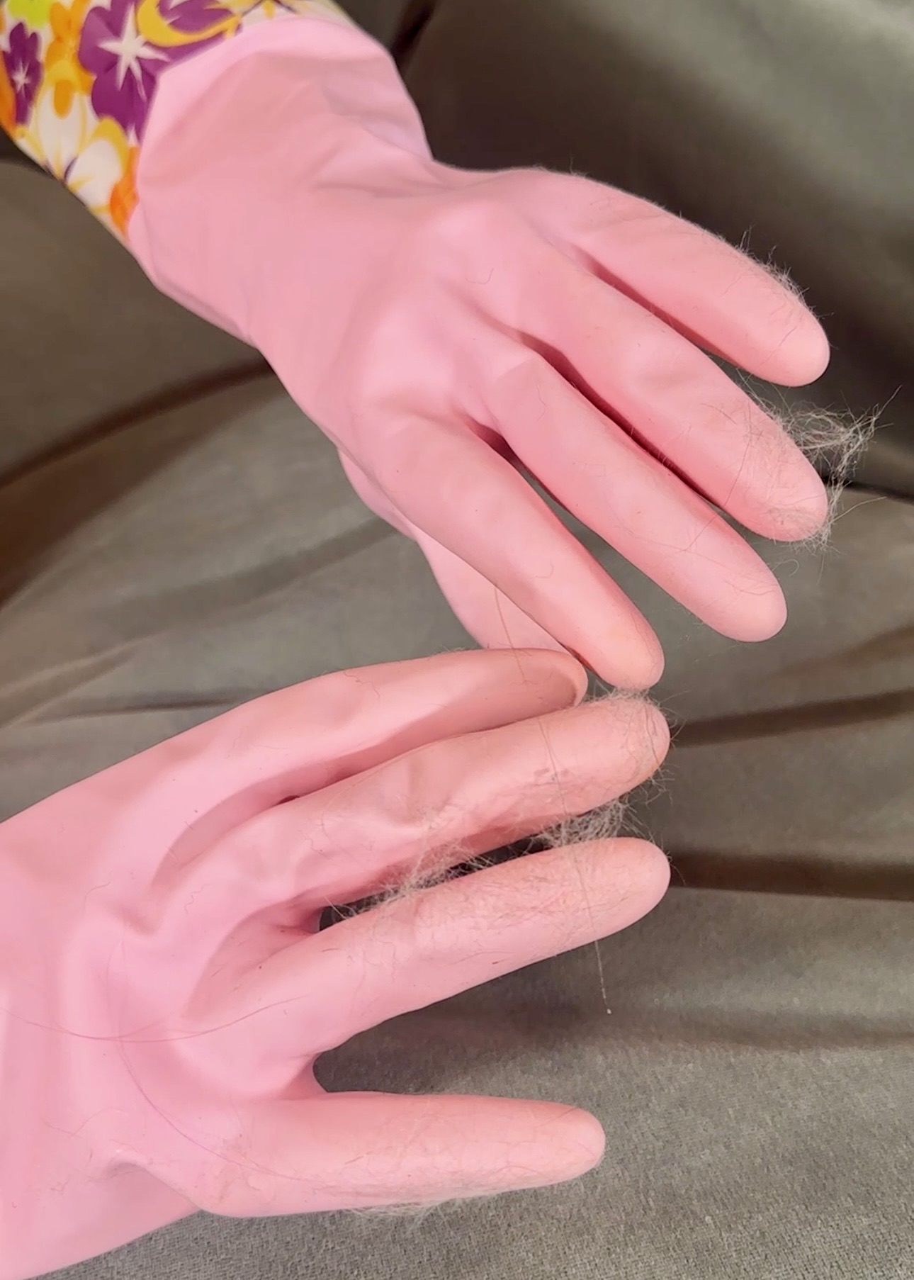 Keeping my house clean isn’t easy, but my secret weapons? My dish gloves. I simply wipe across my couch that I thought was clean. It grabbed all of Tippy’s hair- don’t worry girl, I got ya covered!