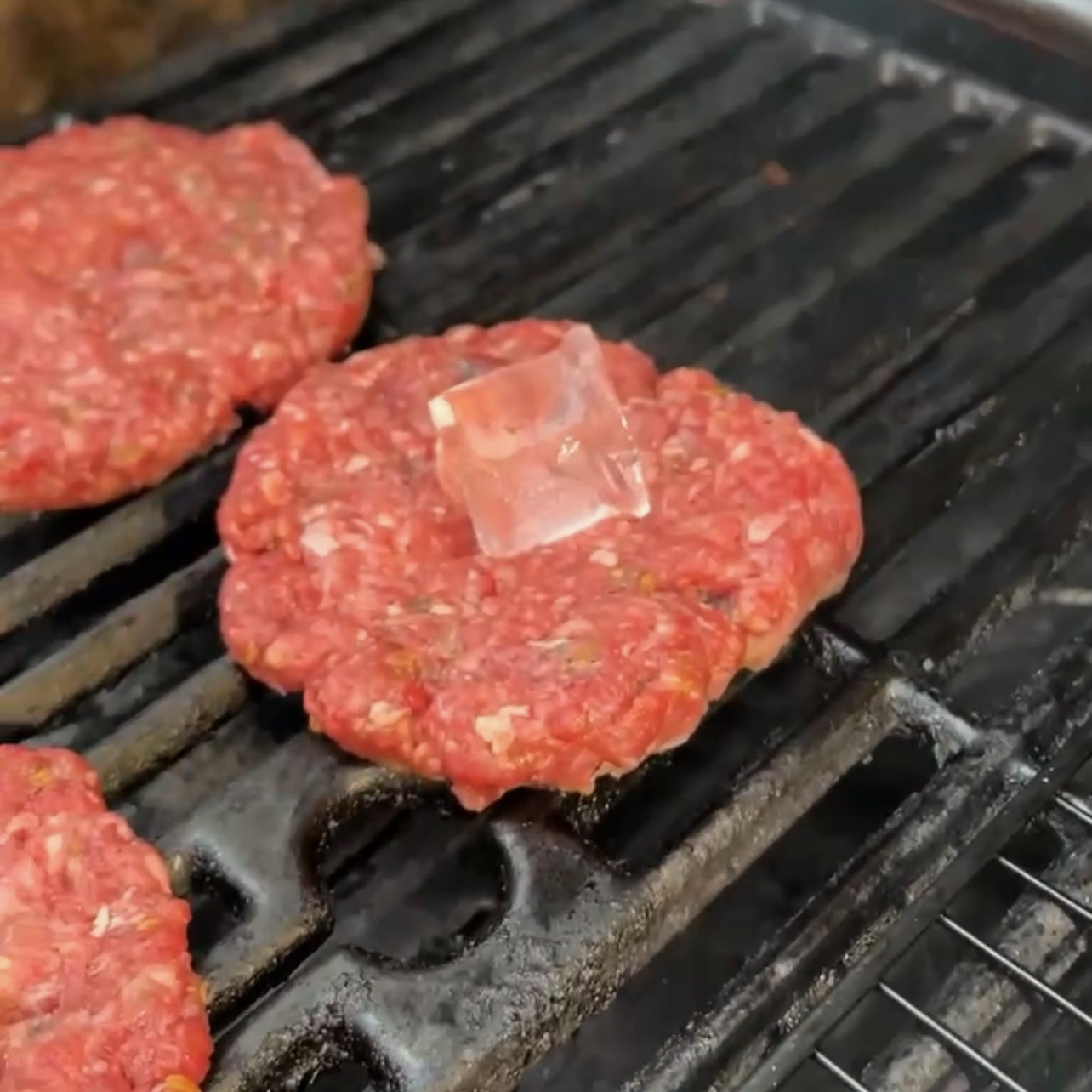 Note: ice cube only goes on once, on the raw side. Flip burger when ready, even if ice isn’t fully melted yet.