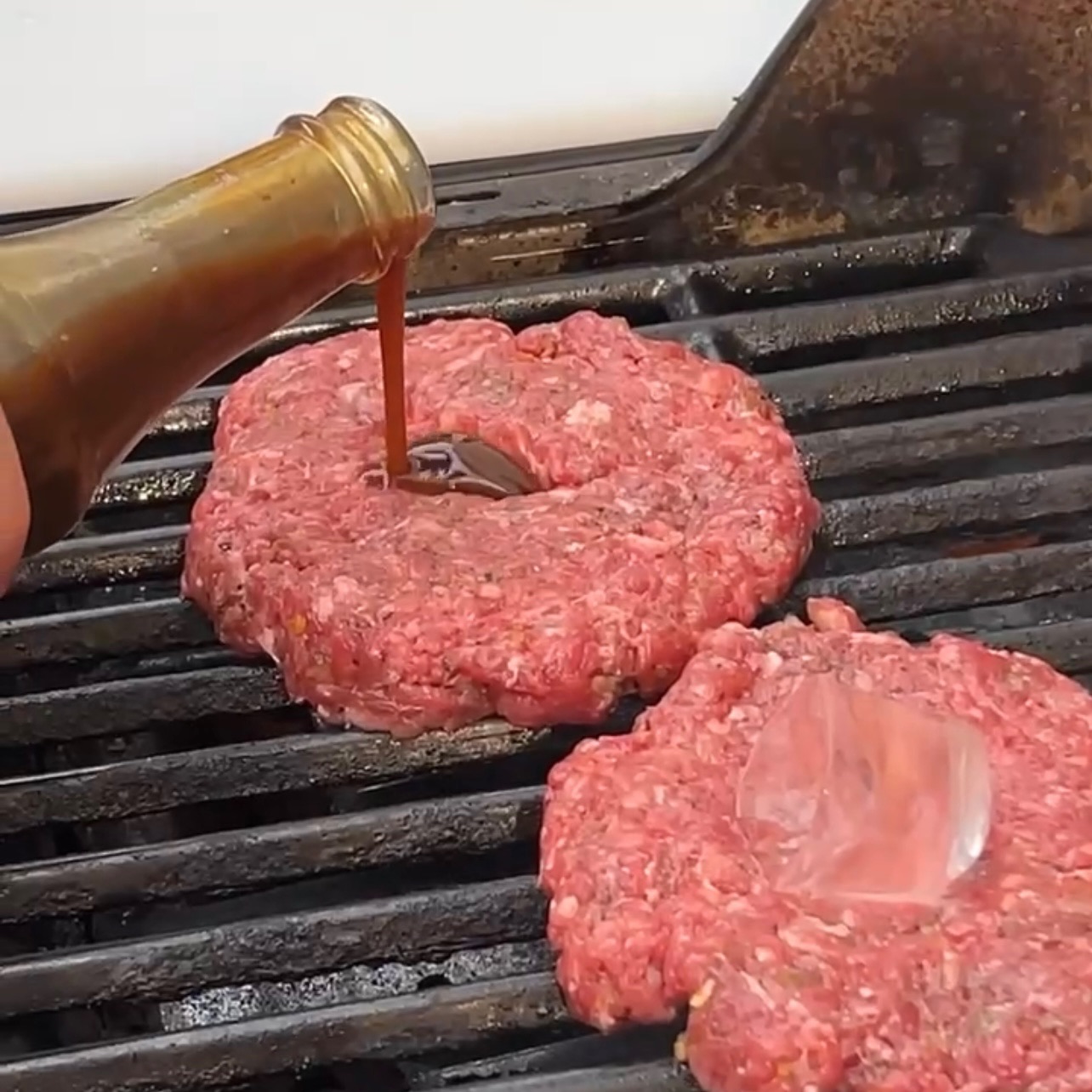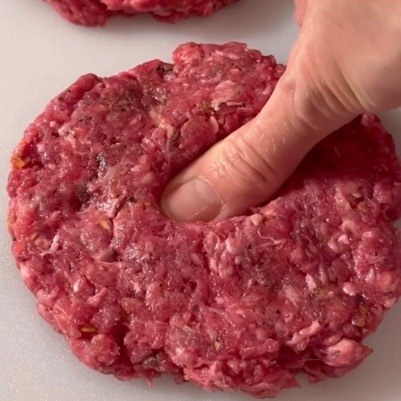 Start with the pound of meat and added seasoning, make into equal patties and do that important thumbprint. The piece of ice in the middle keeps the burgers moist while they’re grilling! Worcestershire sauce does the same thing.