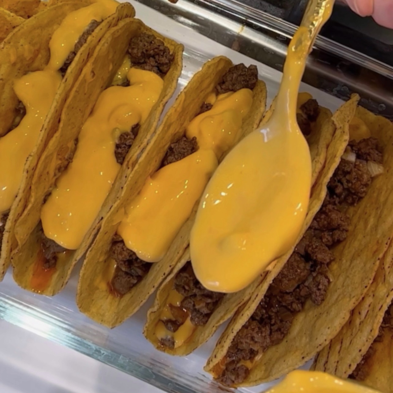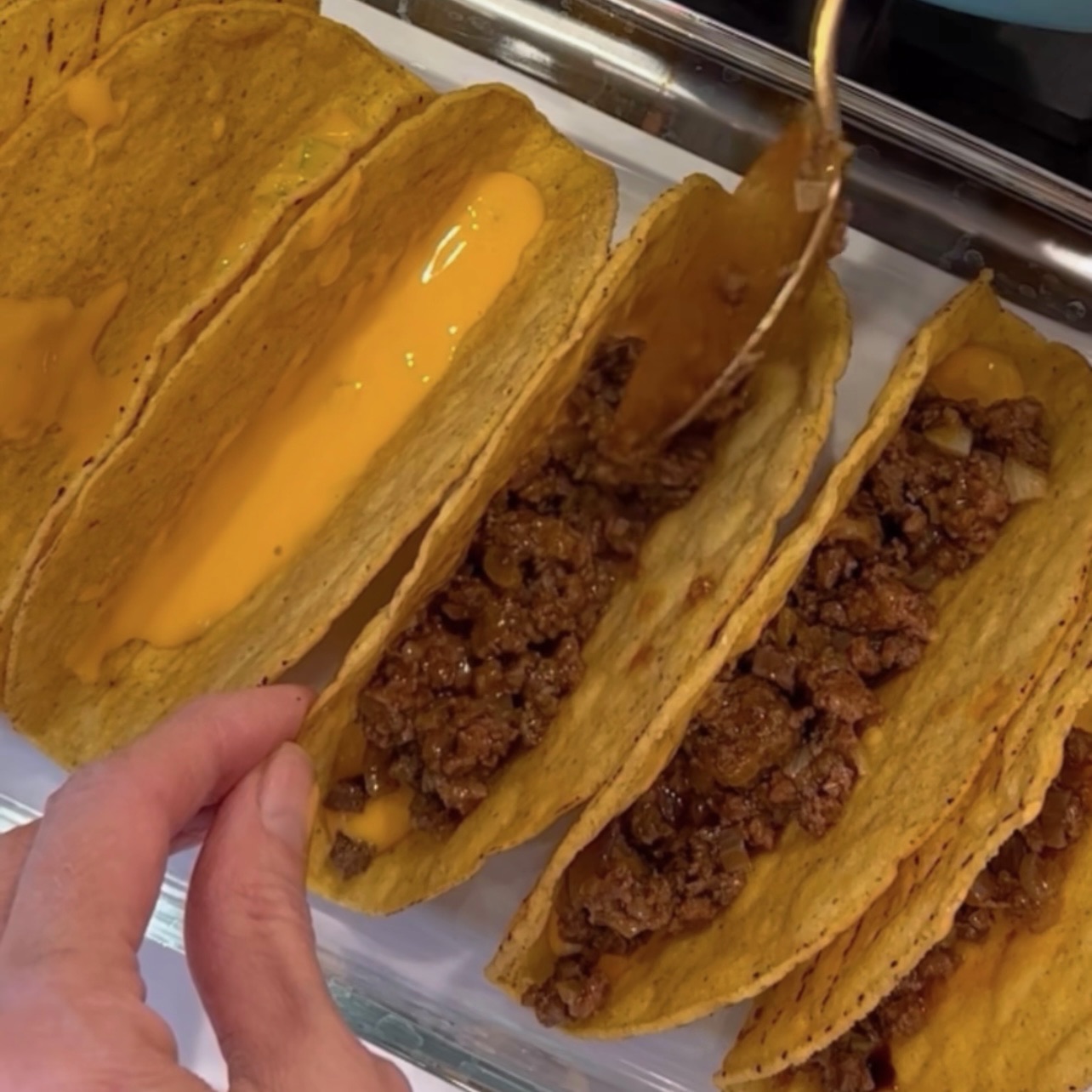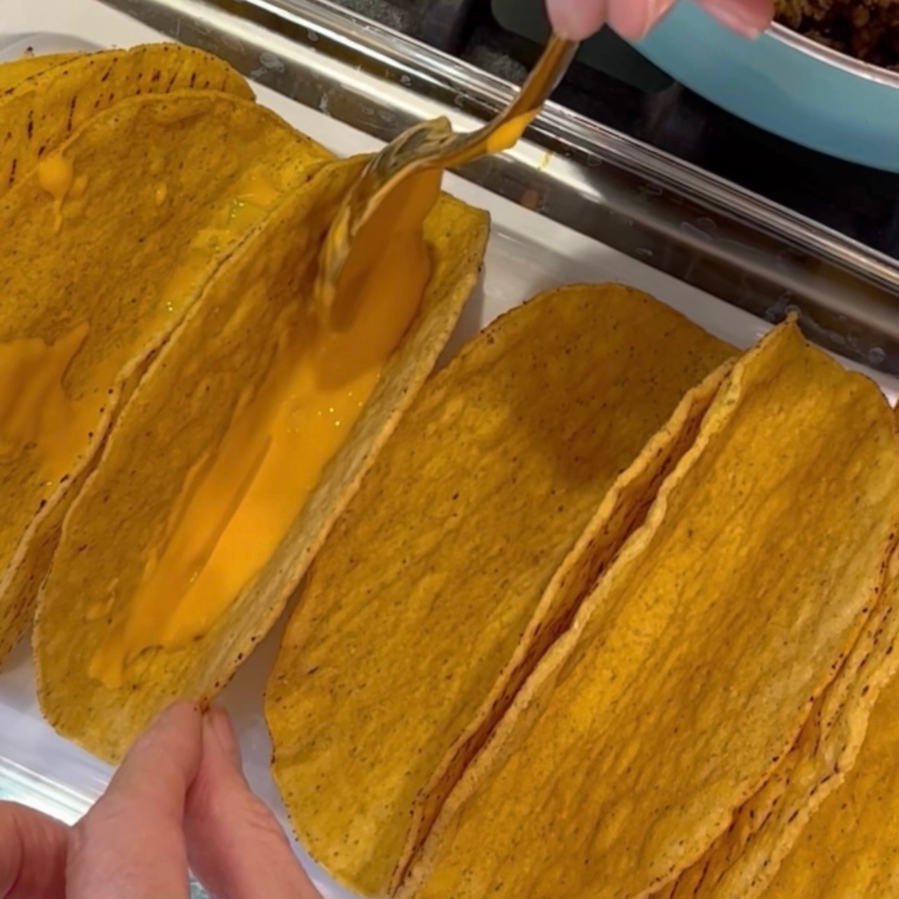Layer fillings in the following order: cheese (I use a nacho cheese, shredded or even plant based), prepared meat of choice or sautéed veggies, cheese. Bake for about 3-5 minutes. This will crisp the shells and melt the cheese at the same time! Try this taco hack tonight!