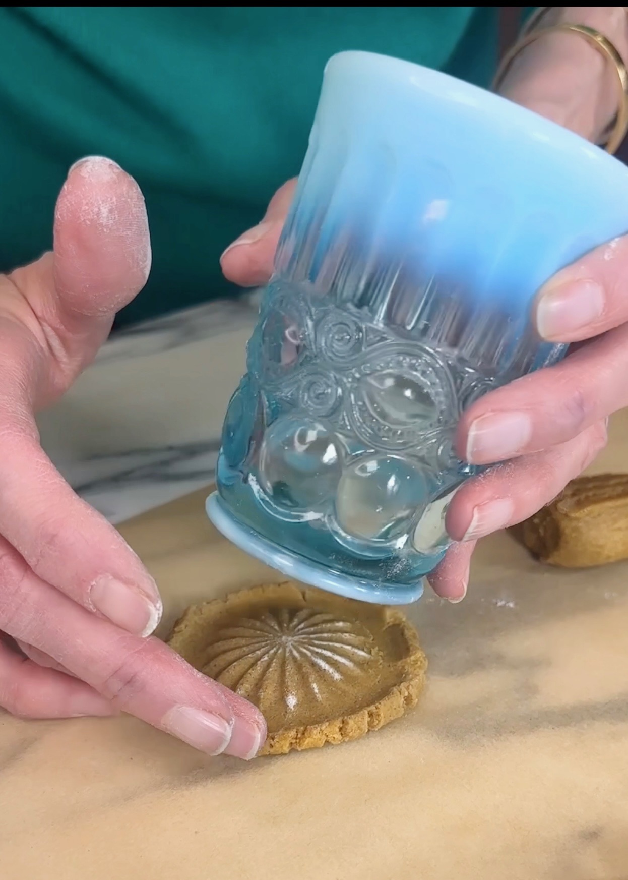 First up is my genius cookie hack- I’m so excited about this one! Did you know you can use flower vases or juice glasses at cookie stamp? Take a look at the bottom of your glasses or vases, and use the beautiful patterns to create a design on your cookies.