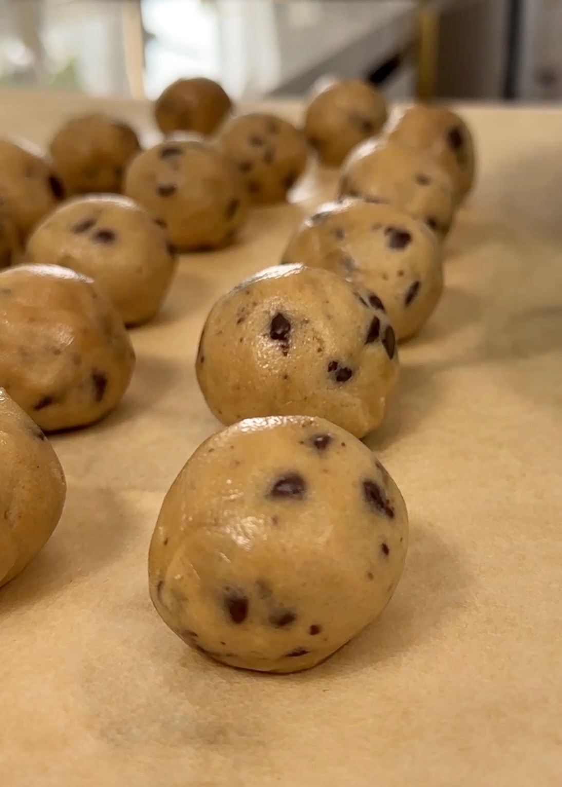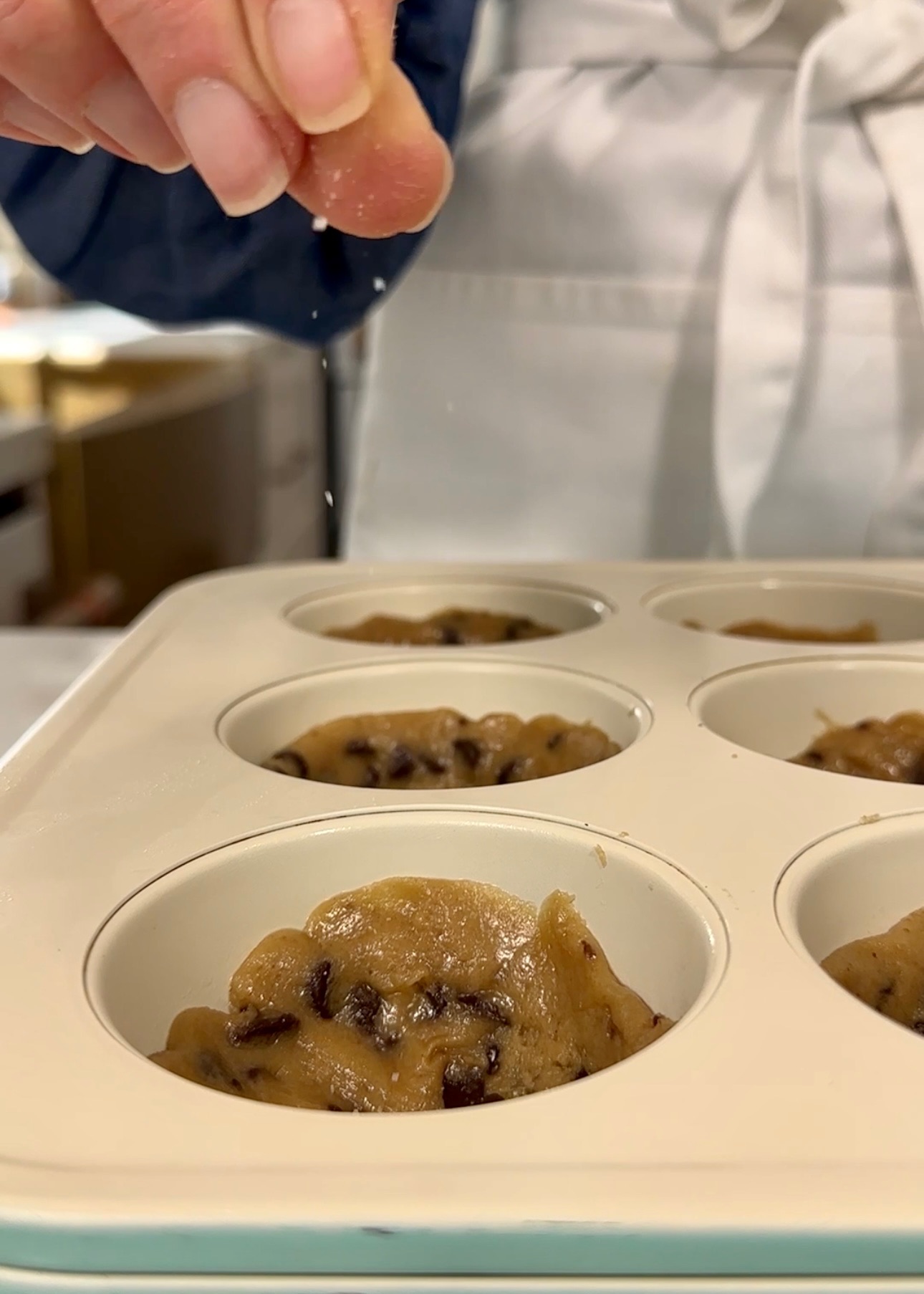 Next, press the cookie dough up against the side of the pan. My secret is to add a pinch of salt- it’s a game-changer! Preheat and bake your cookies based on the directions of the dough.