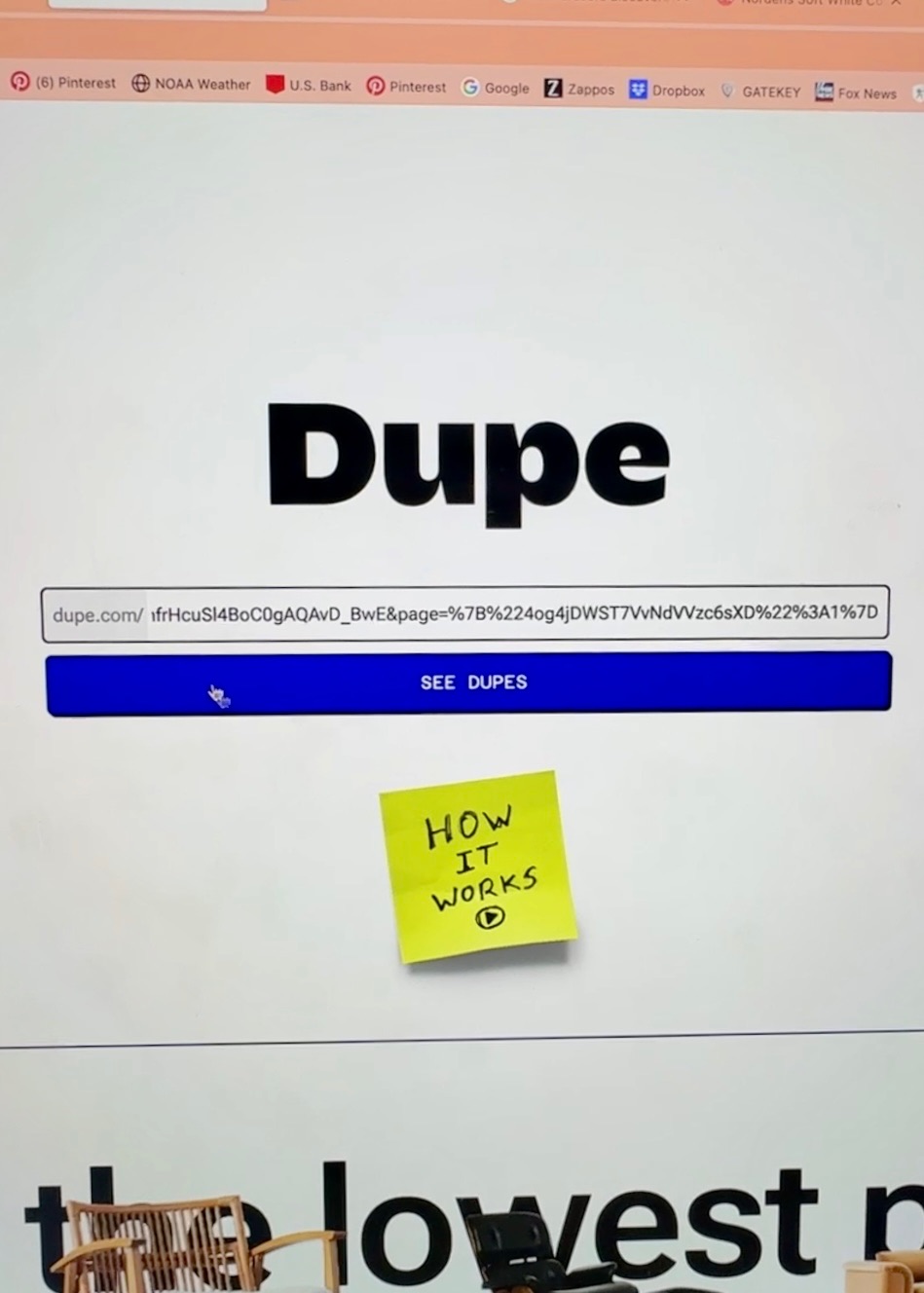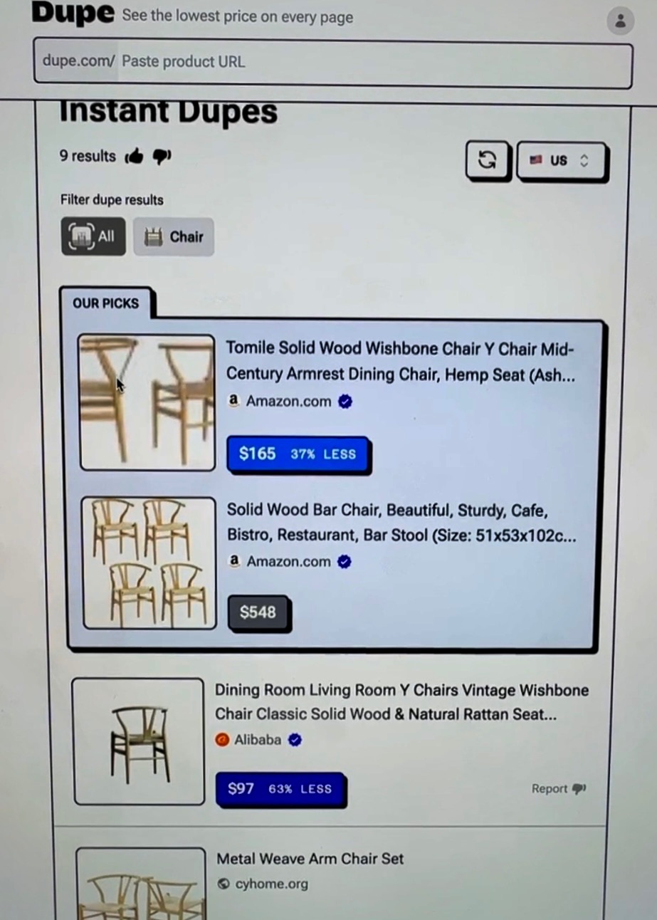 Let me show you how it works. I found this chair that I LOVED but it costs $265! WHAT?! So… I copied the link to the chair and put it on dupe.com. This site generated a bunch of dupes! The savings were crazy. It found an identical chair that was 60% cheaper.