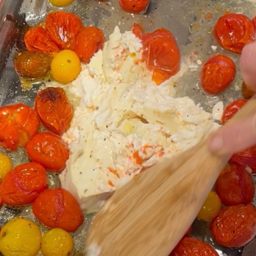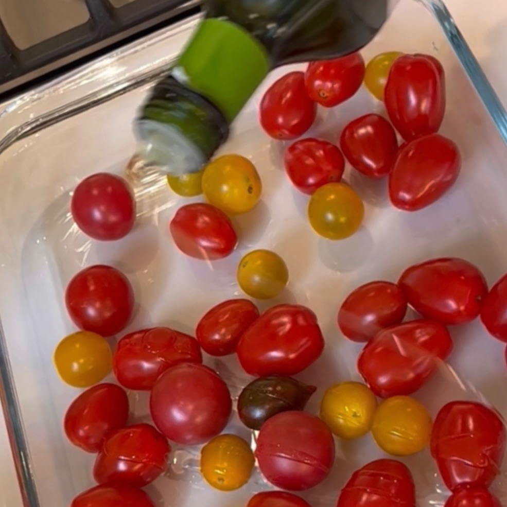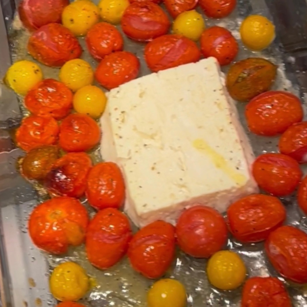 Preheat oven to 400F. Put tomatoes in baking dish, drizzle with oil (approx. a 1/4 cup, just do what you feel) season and toss. Place cheese in middle, turning to coat in oil. Bake for 40 minutes.