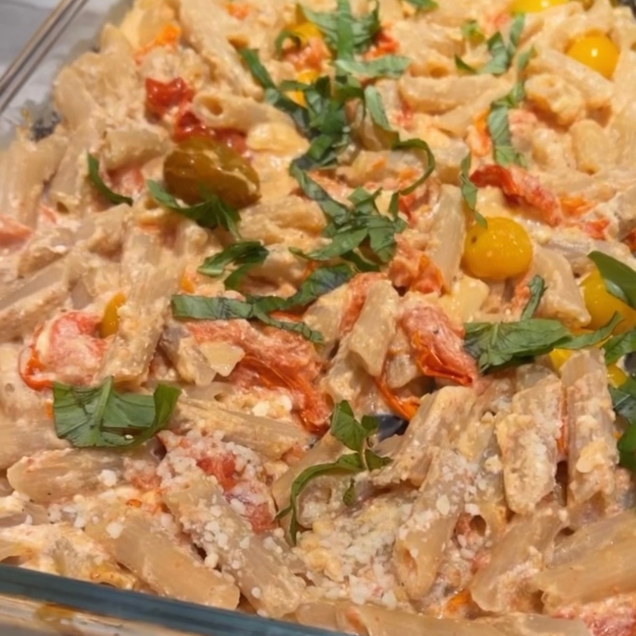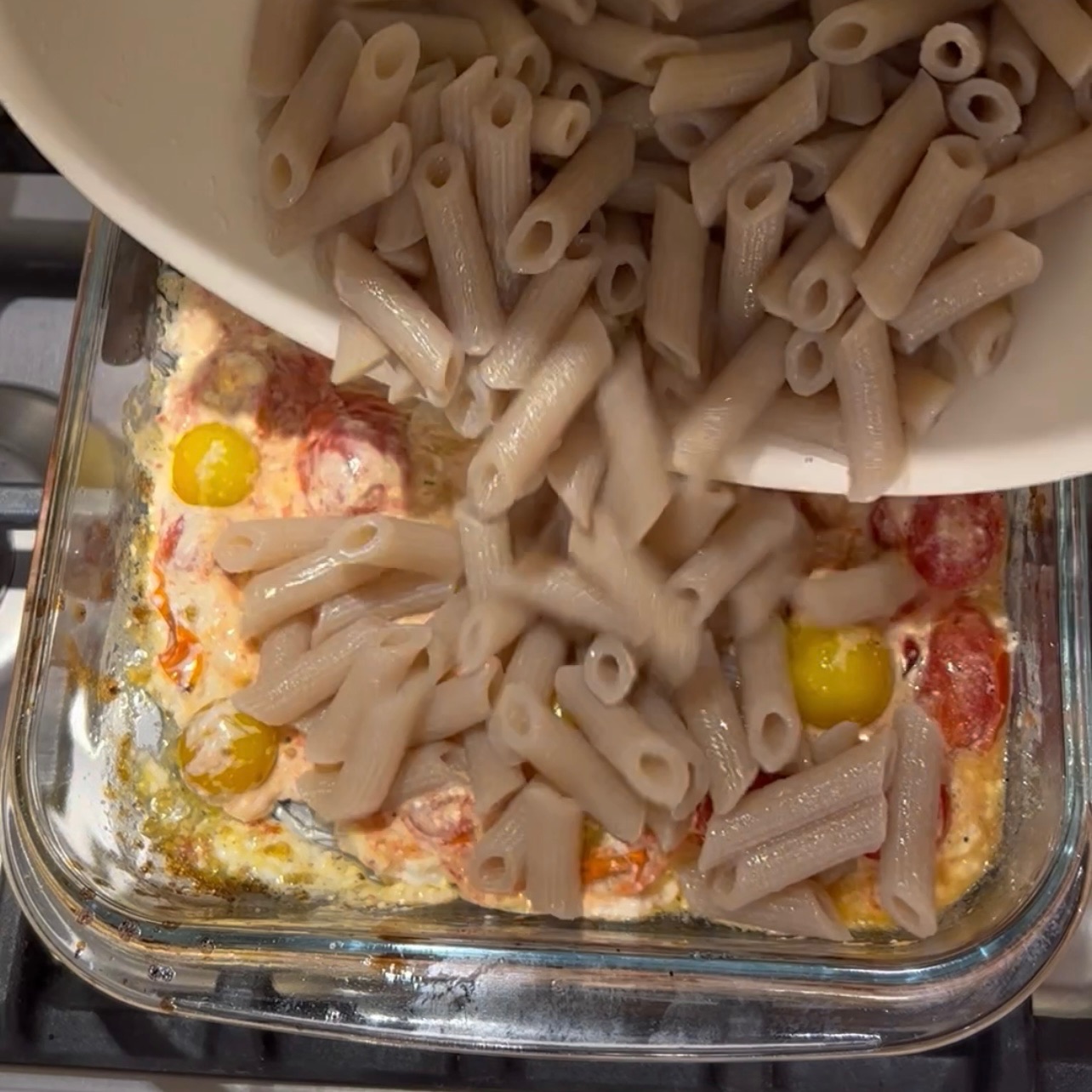Pull from oven, stir to combine cheese and tomatoes, fold in pasta and top with Parmesan cheese & basil if desired.