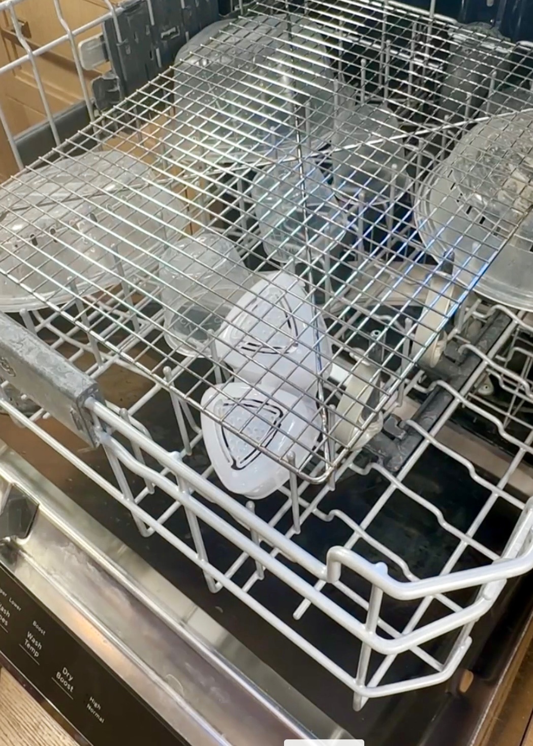 Take your baking rack and place it on top of your dishes. This guy will weigh your dishes down so they don’t flip around and fill with water.