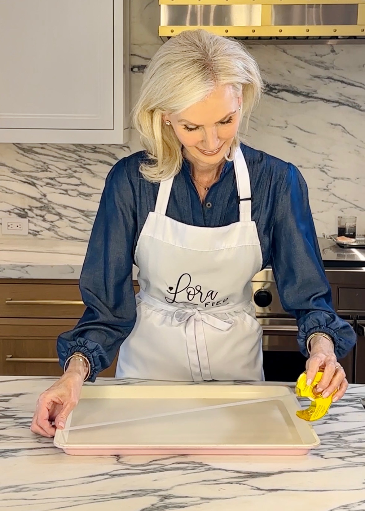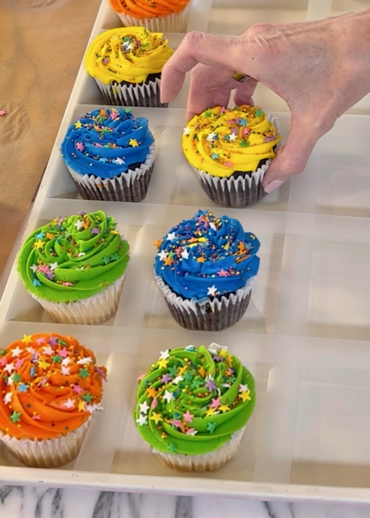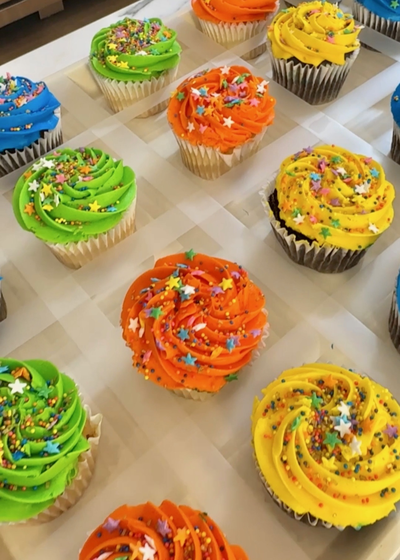 We are going to make a grid on the cookie sheet with your scotch tape. By the way, the tape won’t hurt your cookie sheet. Making a grid will create a square for each cupcake to sit inside of. The best part? This hack saves you from the hassle of buying and storing those store-bought cupcake holders.
