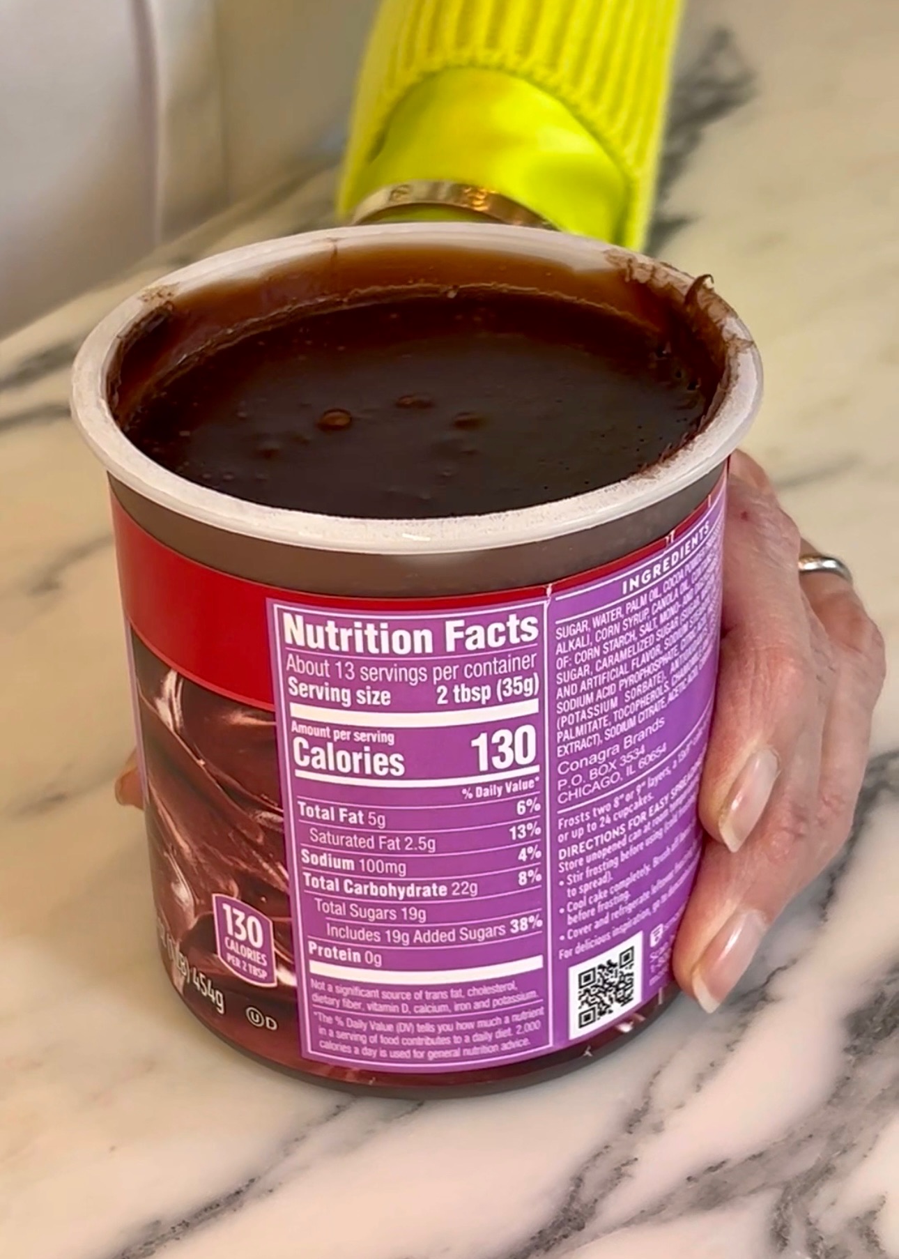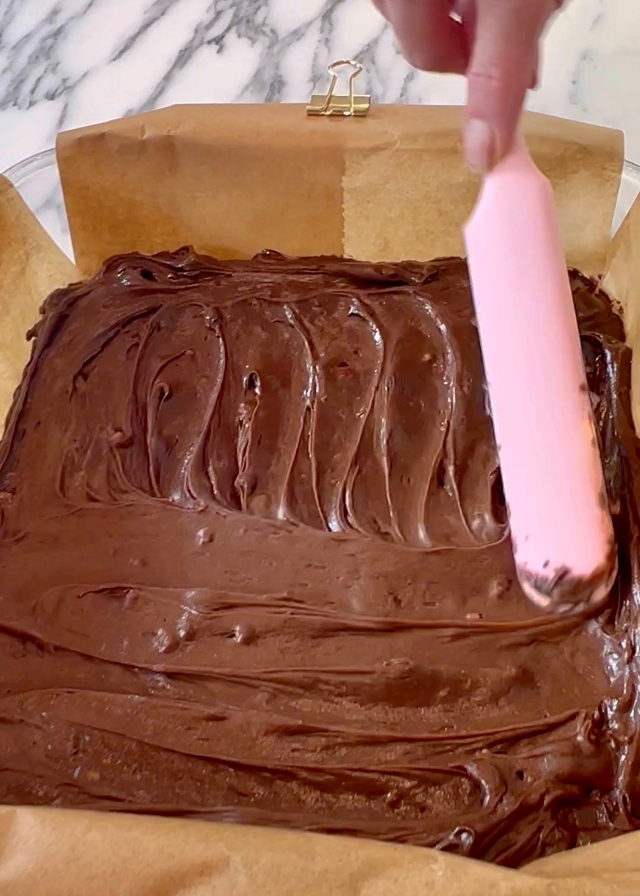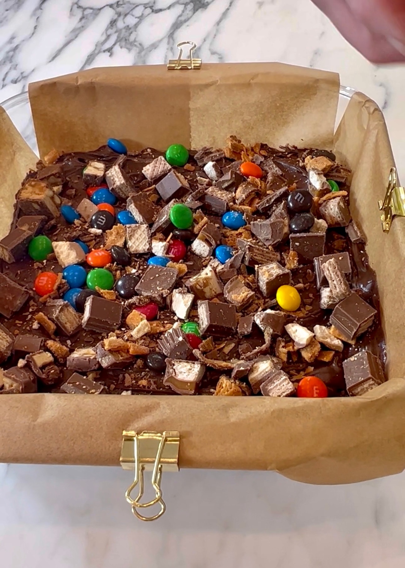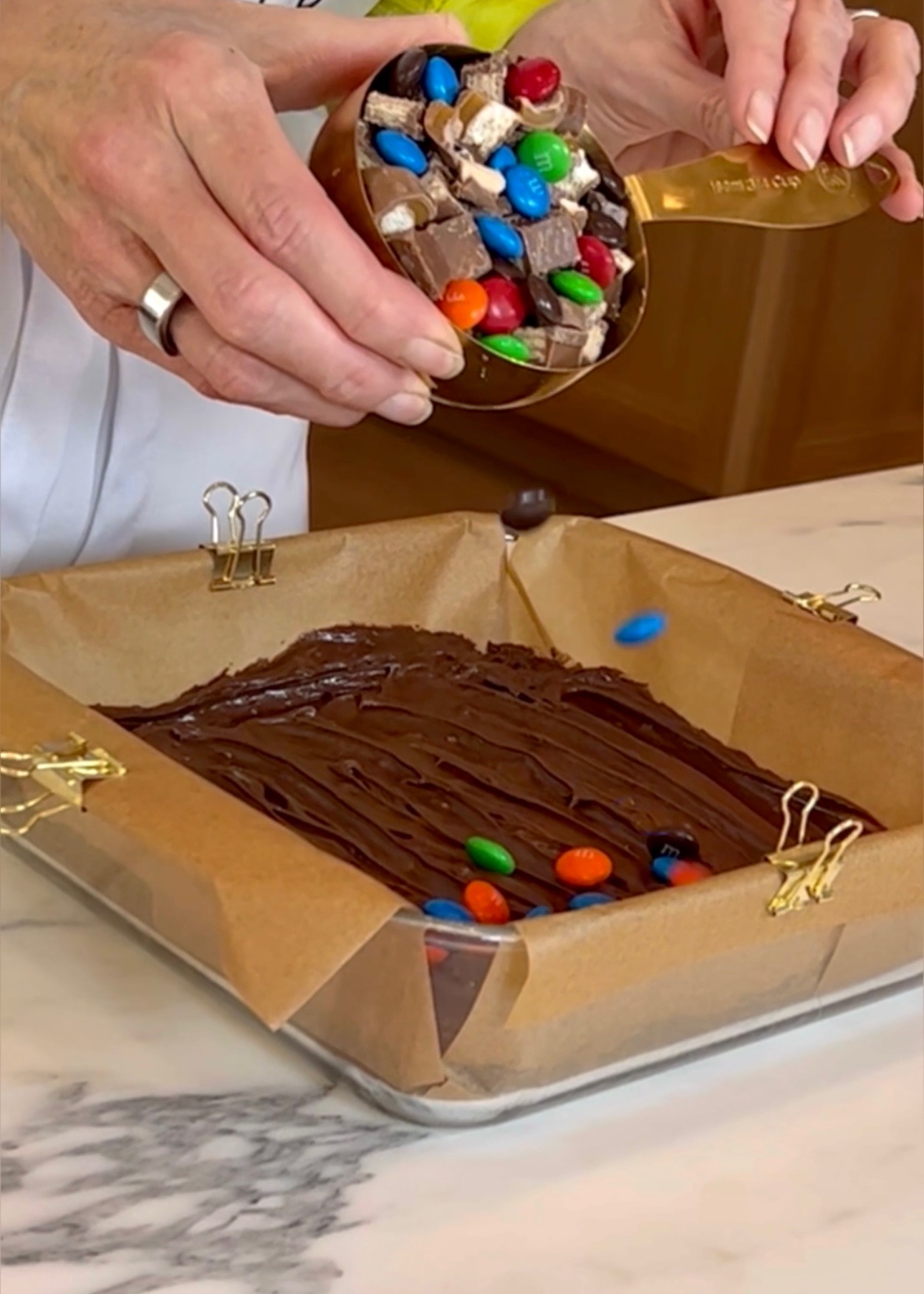 Stir in chocolate frosting until everything is melted and combined. Pour in a parchment lined pan, top with your favorite candy and put in the refrigerator for at least 30 minutes.