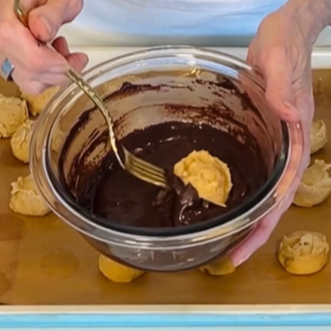 Mix together peanut butter and cream cheese until smooth. Scoop onto lined tray and freeze for 20 minutes. Then, melt chocolate in microwave, stirring every 30 seconds.