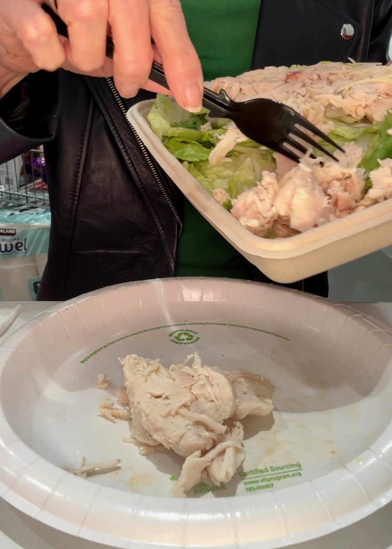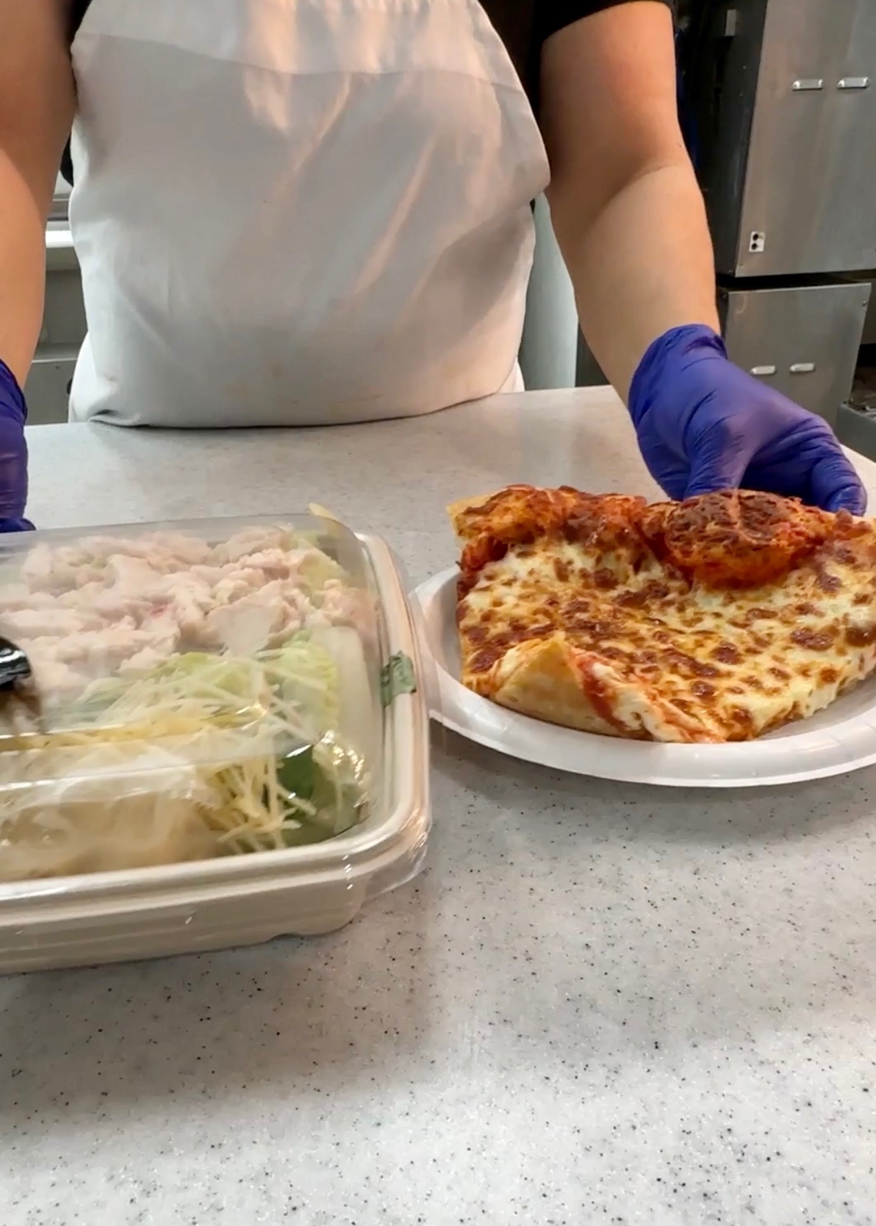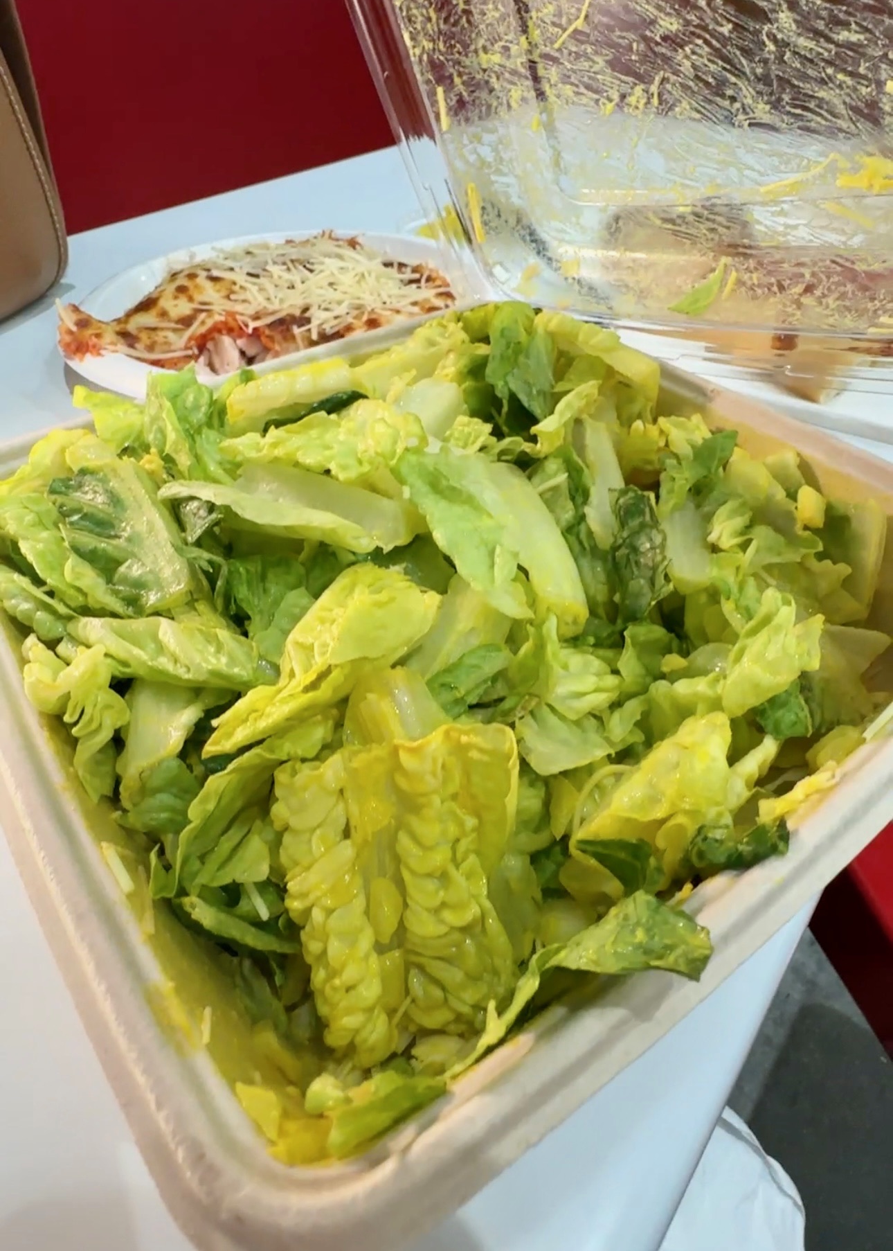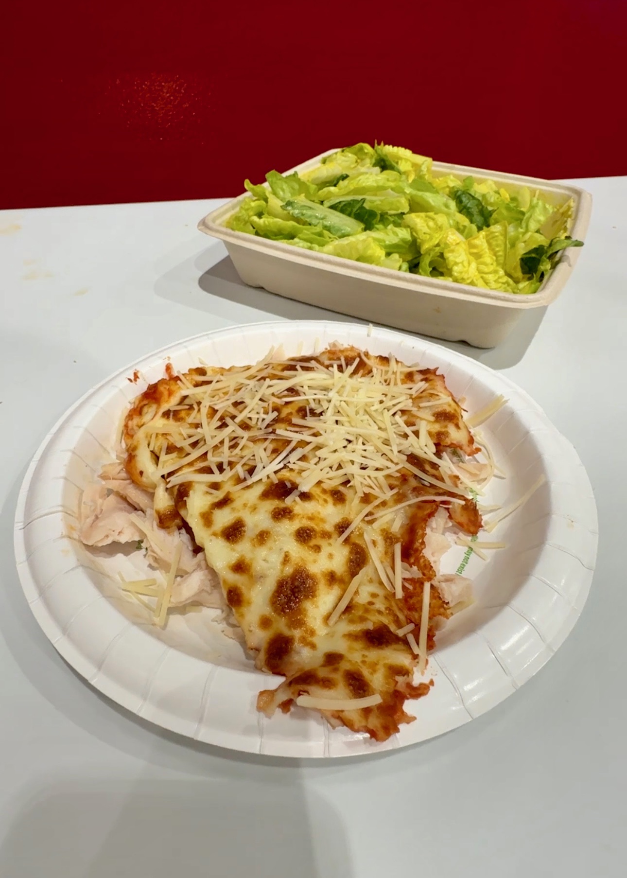 I picked up 1 chicken Caesar salad and 1 slice of their cheese pizza. For the chicken parm base, we are going to use the chicken from the salad. Separate it and place it on a separate plate. And get this, the chicken adds 0 carbs!