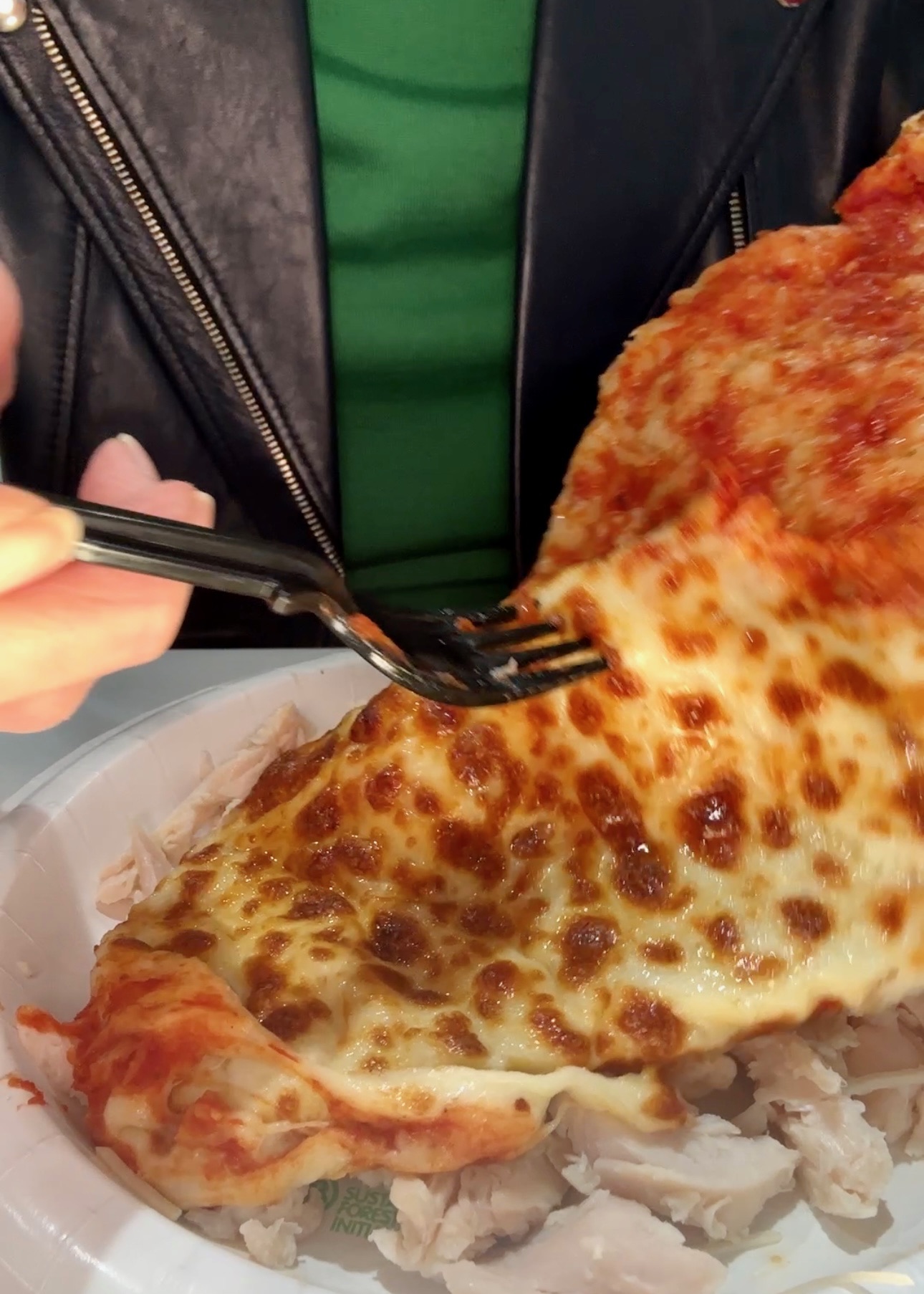 Here’s where things get a little crazy. Scrape the cheese and sauce off of the pizza and top the chicken with it. I also topped mine with the shredded cheese from the salad! This entire plate comes out to 8g of carbs, and it’s absolutely delicious.