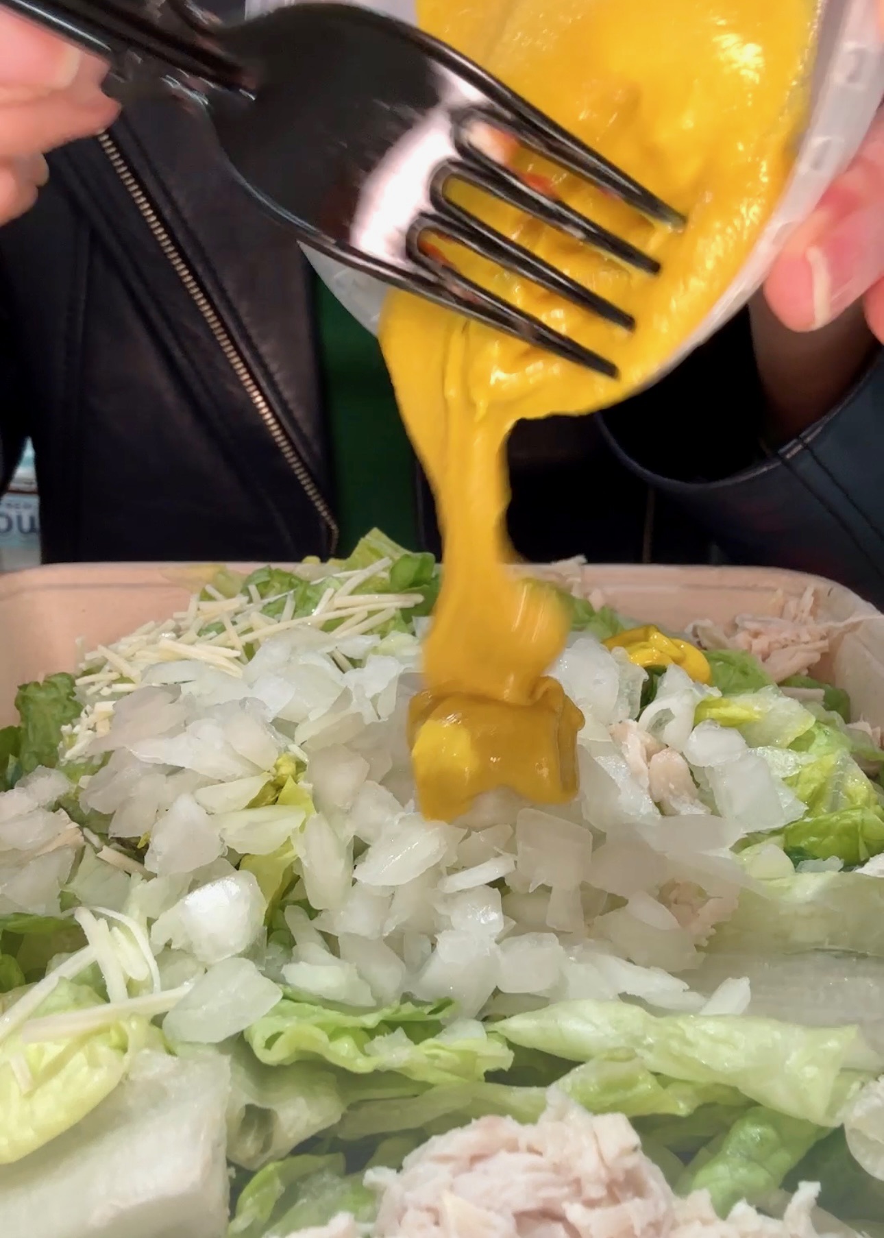 Now i’s time to hack the salad. First, we are gonna toss the croutons and dressing. Instead we are going to order the free side of onions. They come out at 2-4g carbs and make a great topping. Another free add on is the mustard and adds 0g carbs. It makes a delicious dressing, trust me!