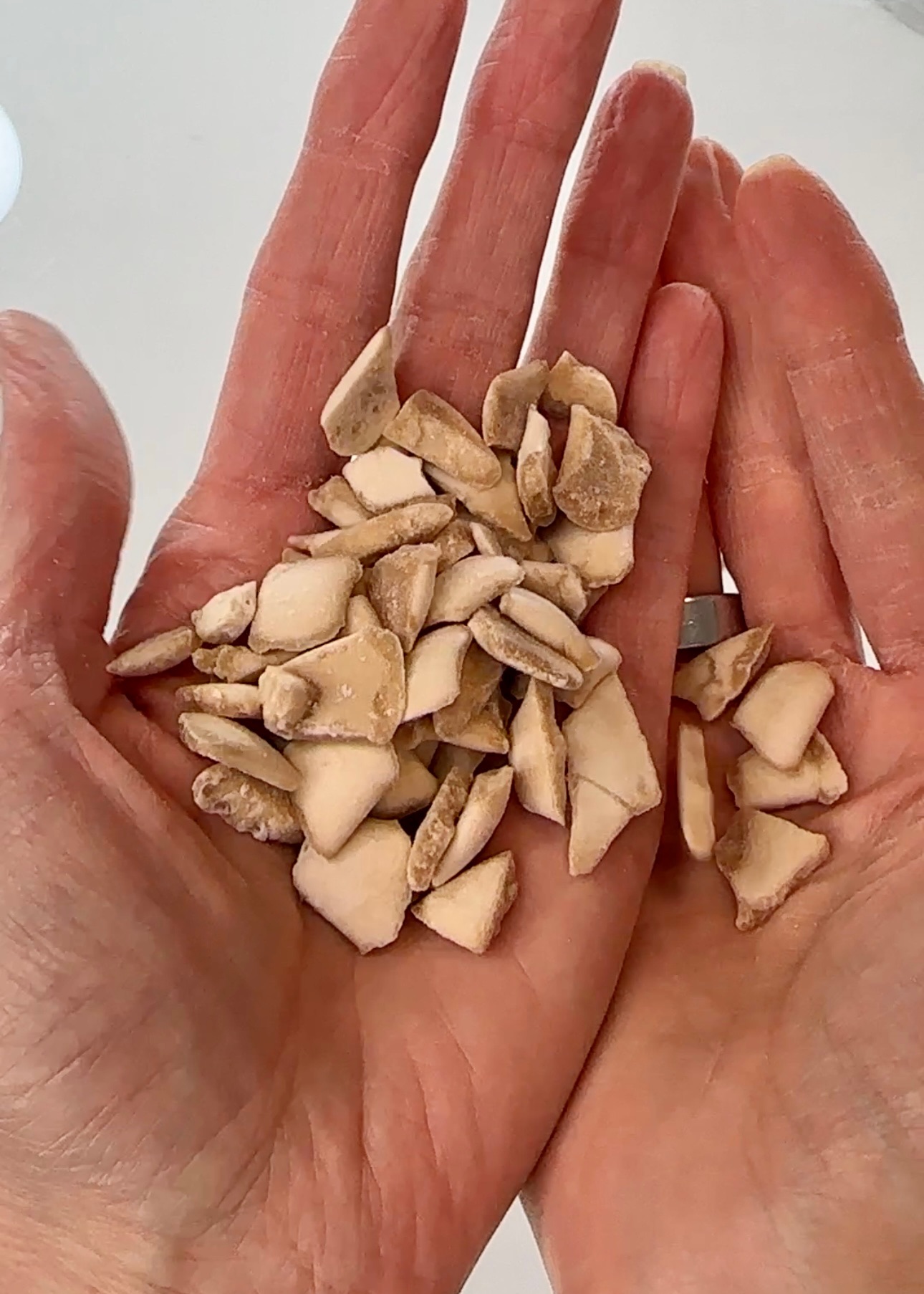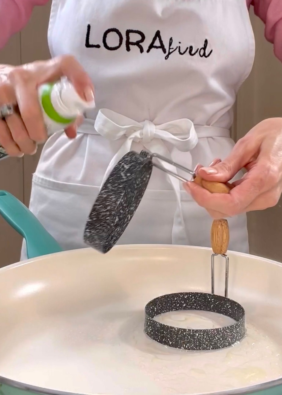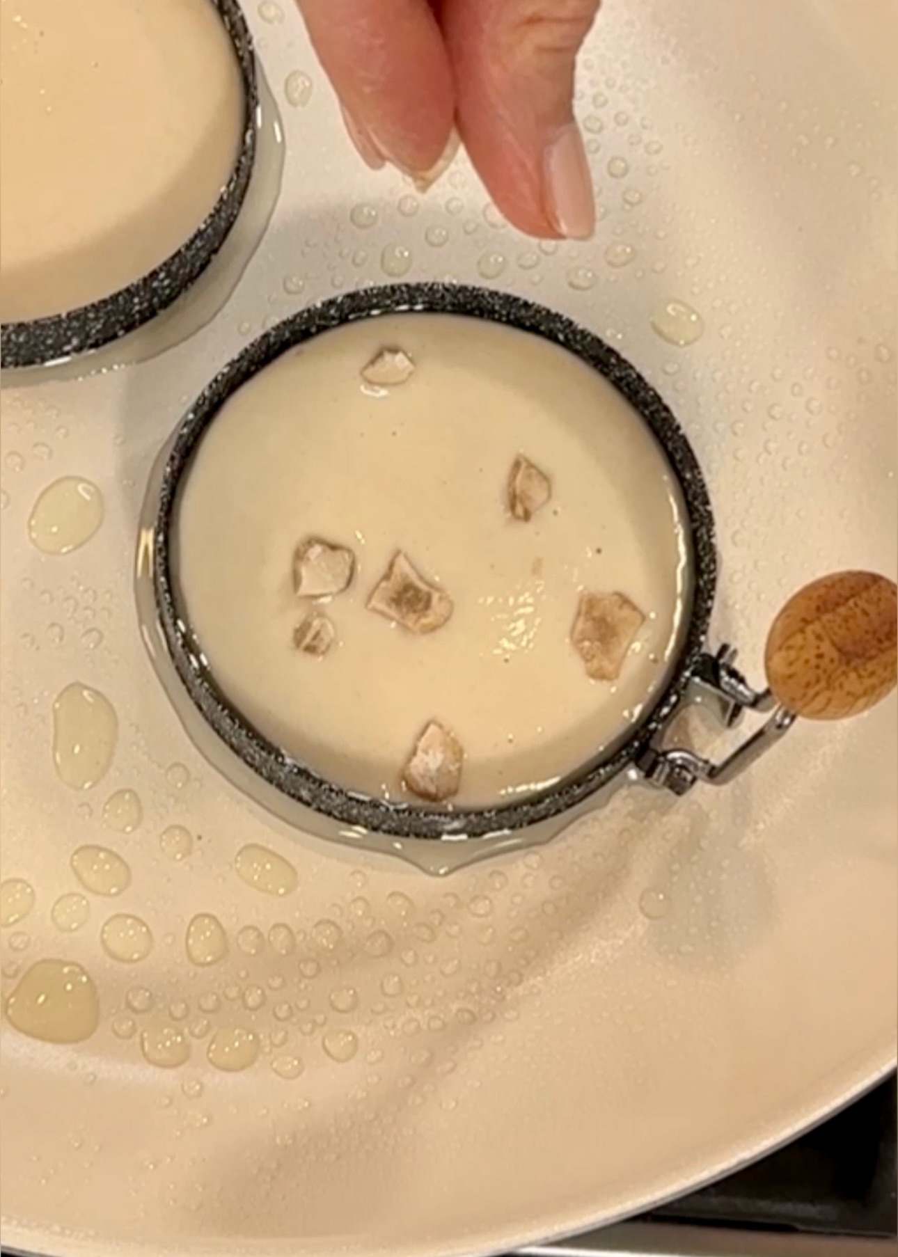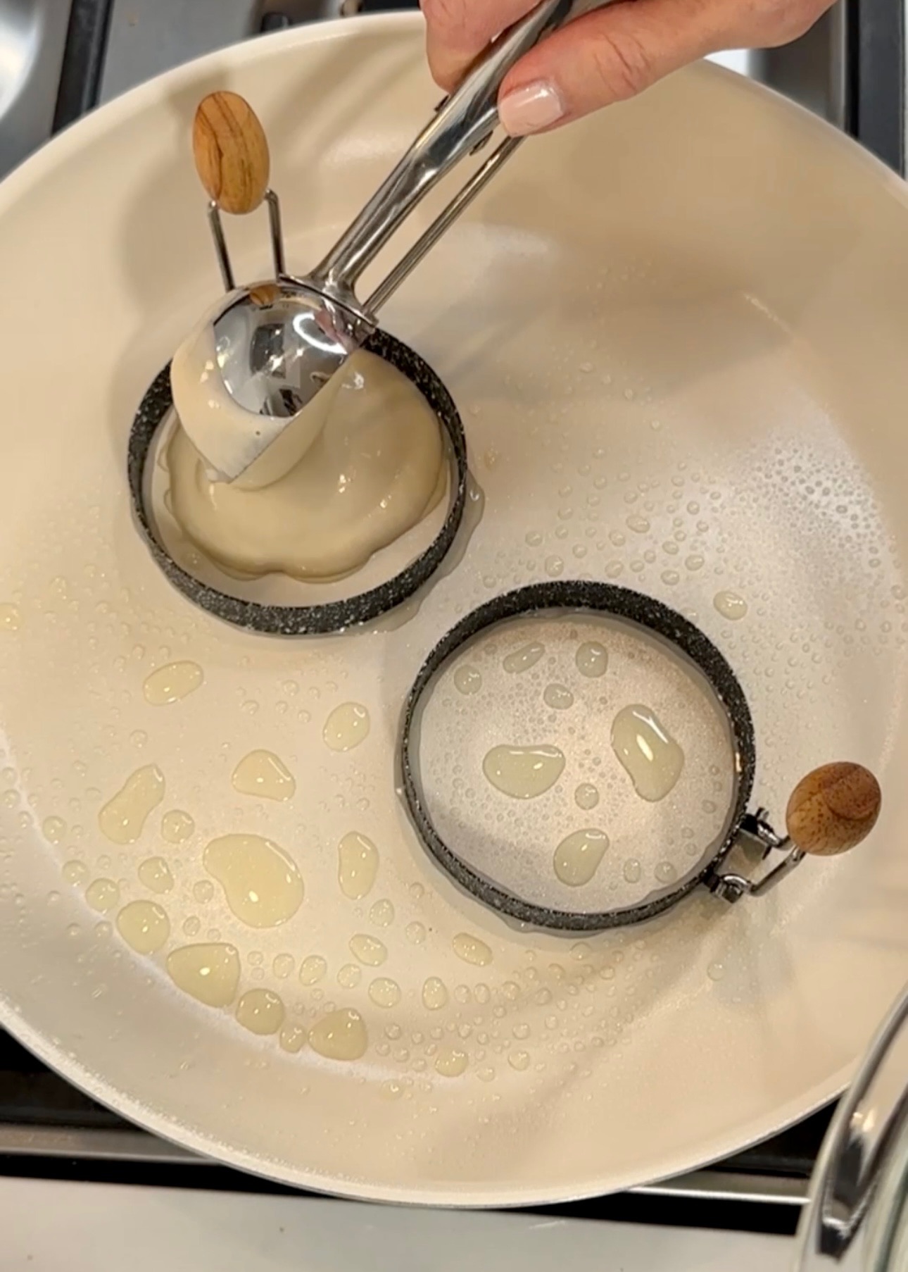 Begin by heating your pan over medium heat. After spraying your pancake ring molds and pan with oil, scoop pancake mix into each ring and add the secret ingredient- maple bits. Cook until bubbles form, then flip.