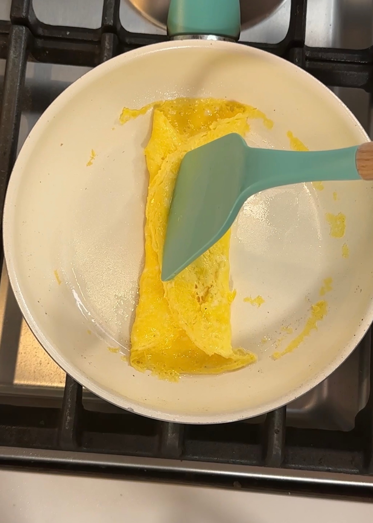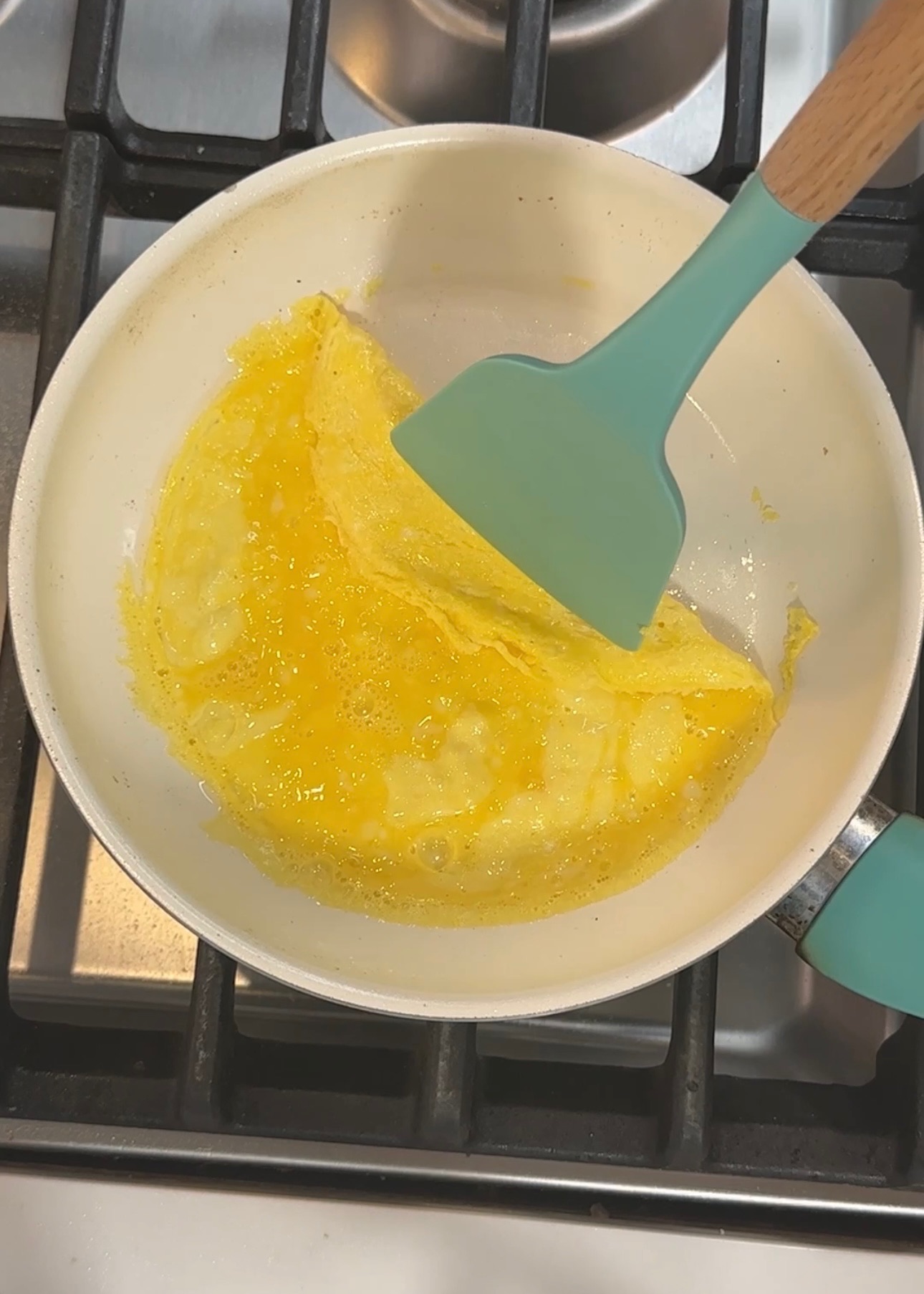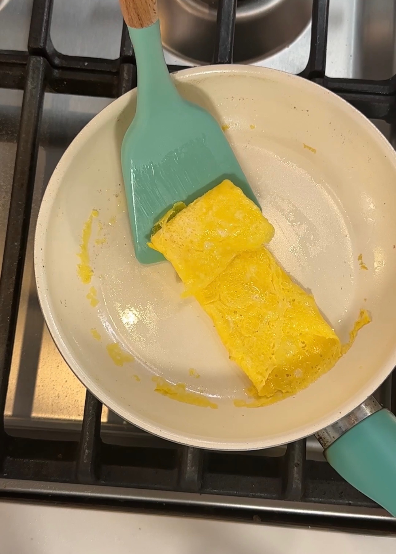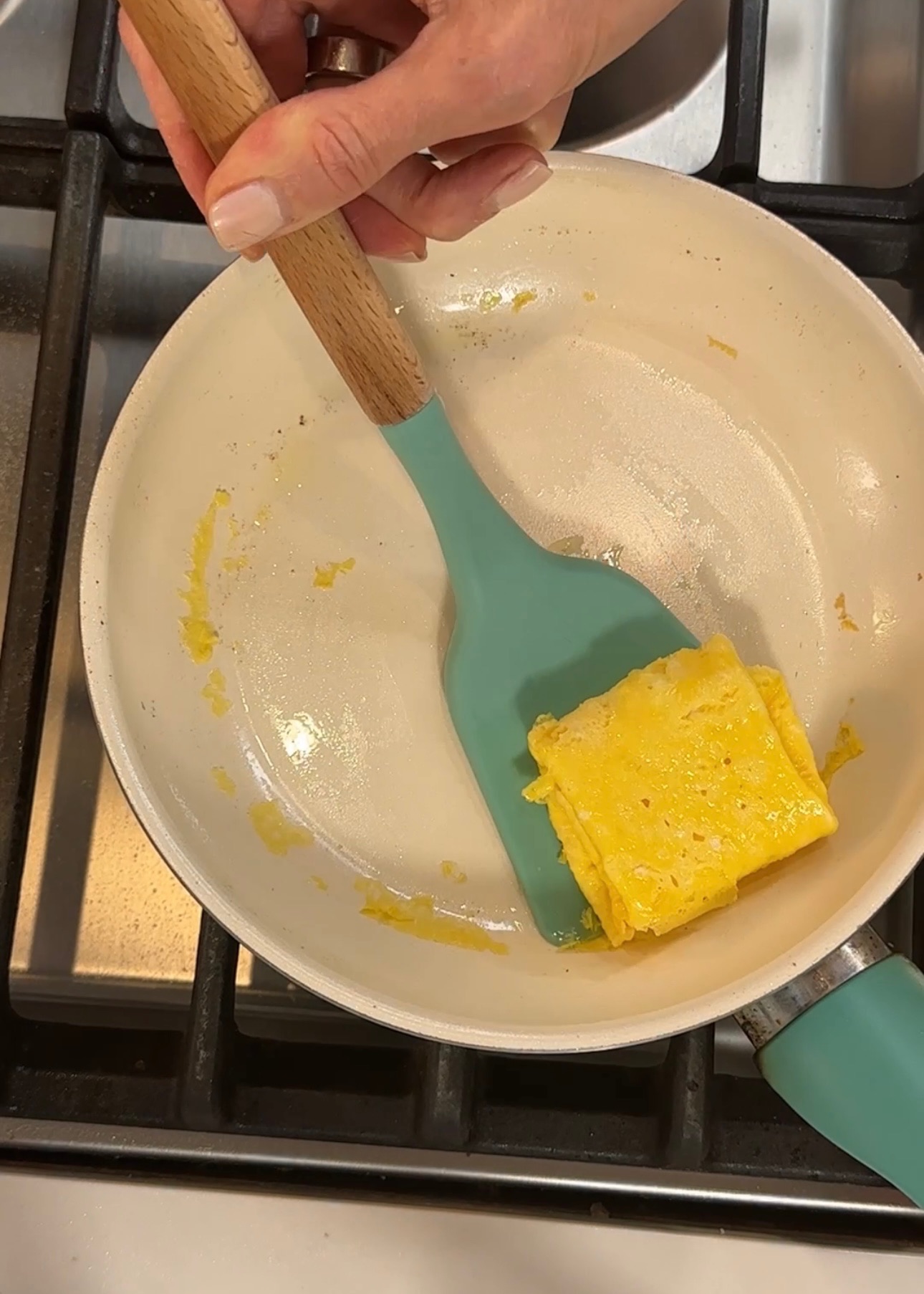 In a separate pan, cook scrambled egg, folding 4 times. NOTE: You do not flip the egg before folding, the heat will cook it as you fold.