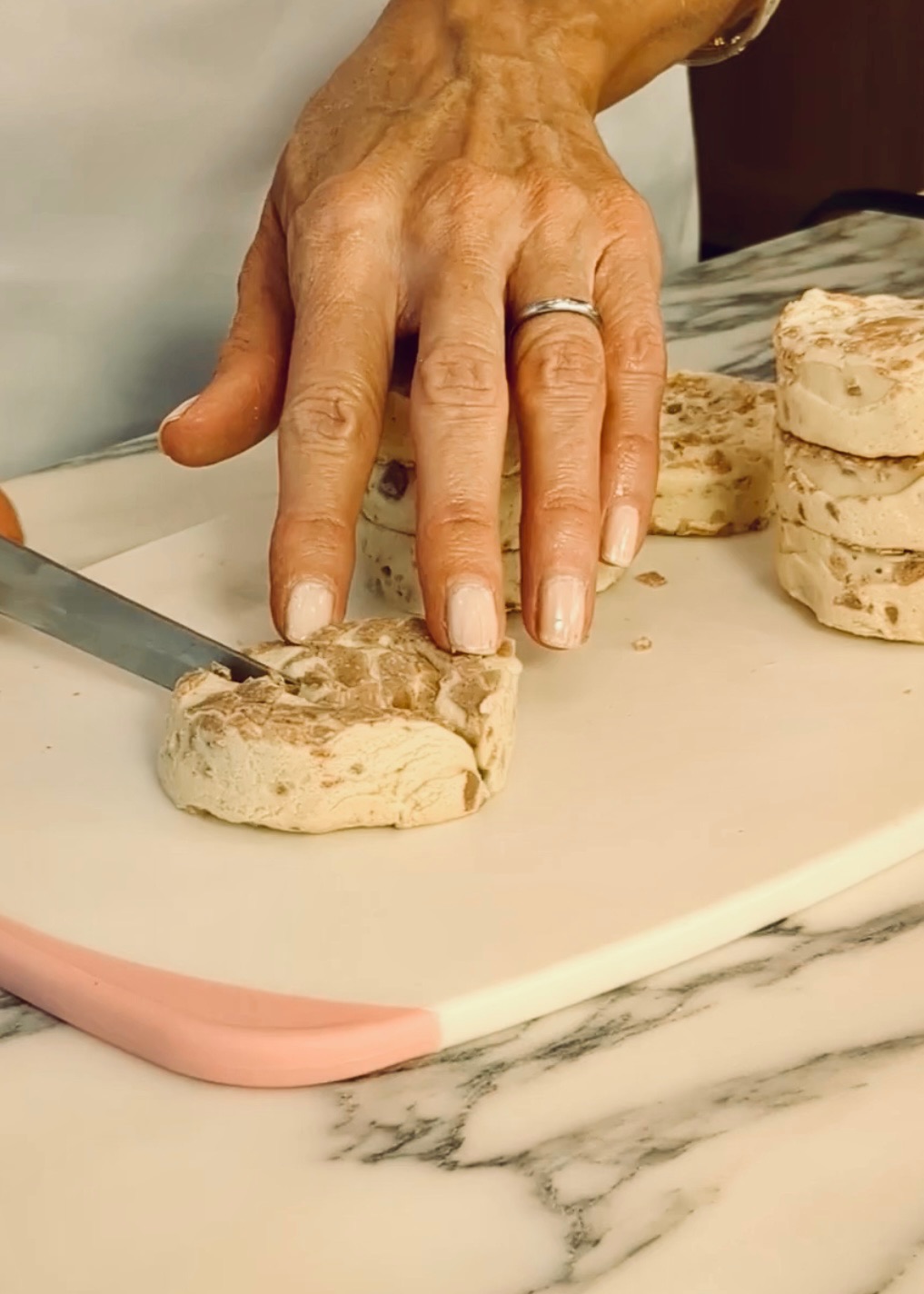 Cut cinnamon rolls in half, roll into thin strips and connect ends, making a circle.