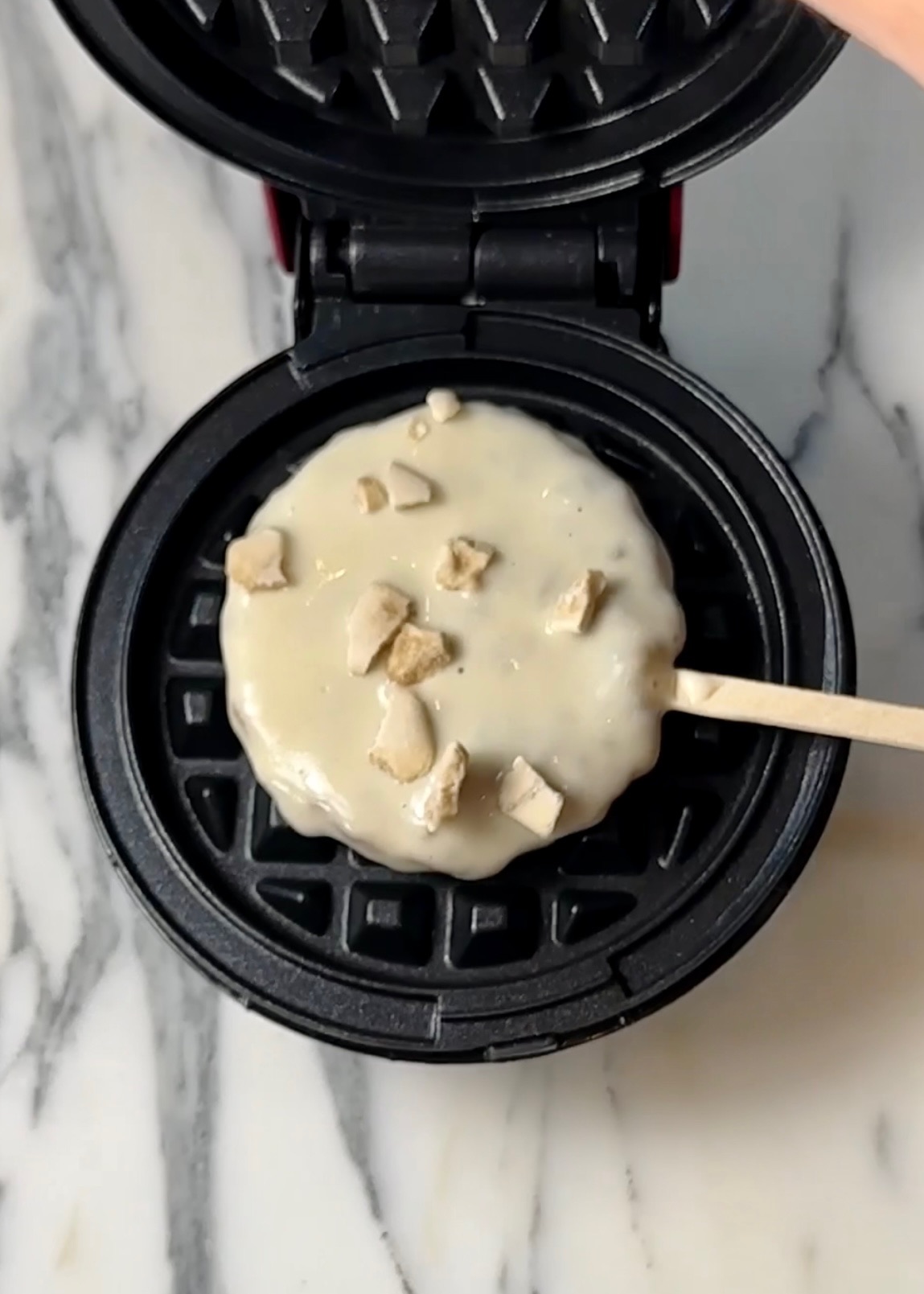 Start by grabbing your waffle maker (preferably mini) and waffle mix of choice. Here’s the link to my mini waffle maker!