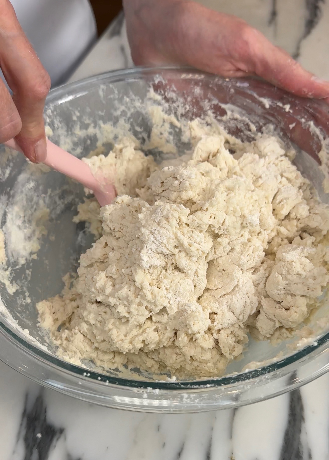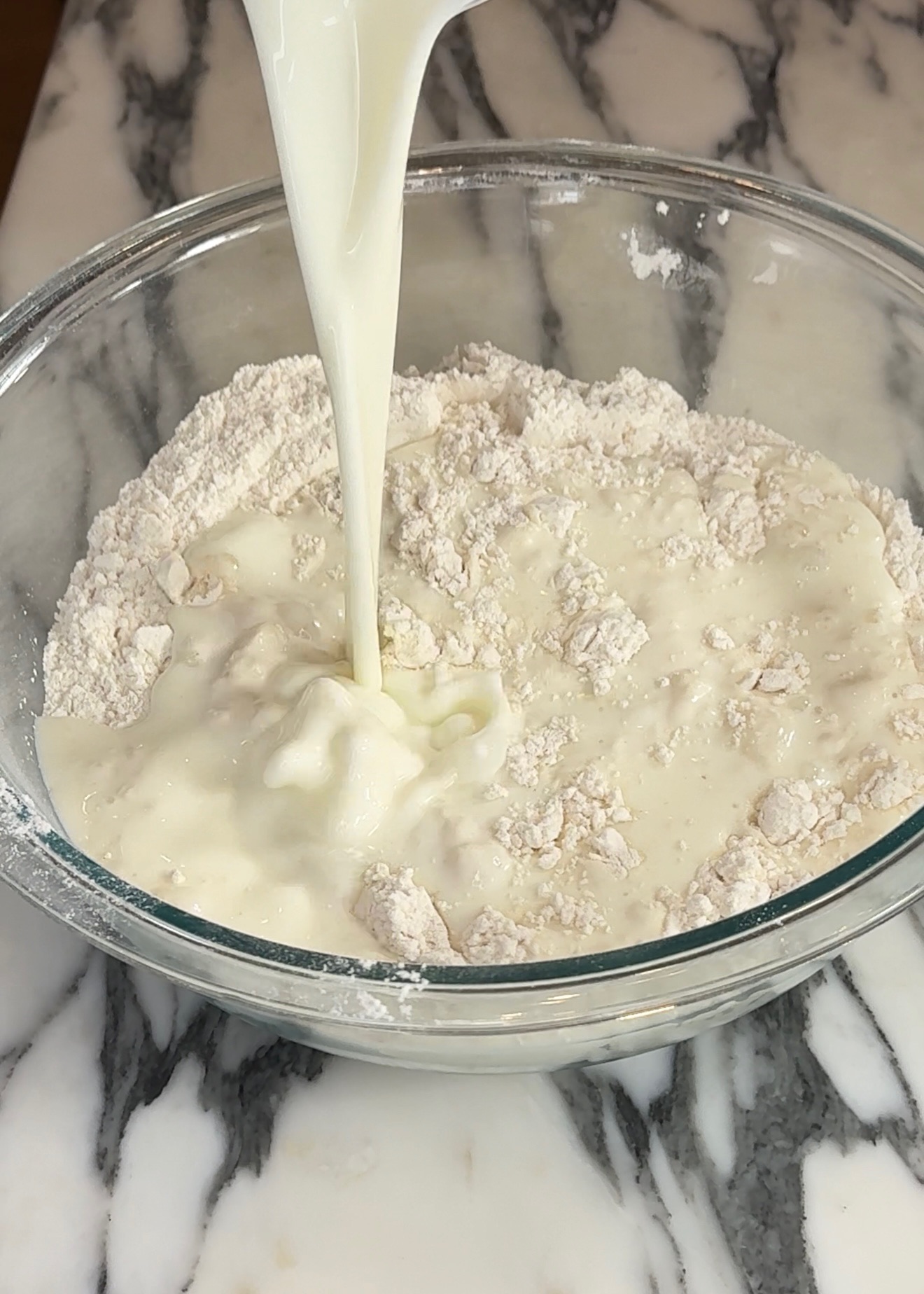 Now, it’s time to make ’em! Zero cooking skills are needed- no yeast, no kneading, no rising, no nothing! Start by preheating your oven to 450F. First, we mix! Mix all ingredients, except for the butter, adding milk last. Stir until combined, making sure to not over mix the batter!