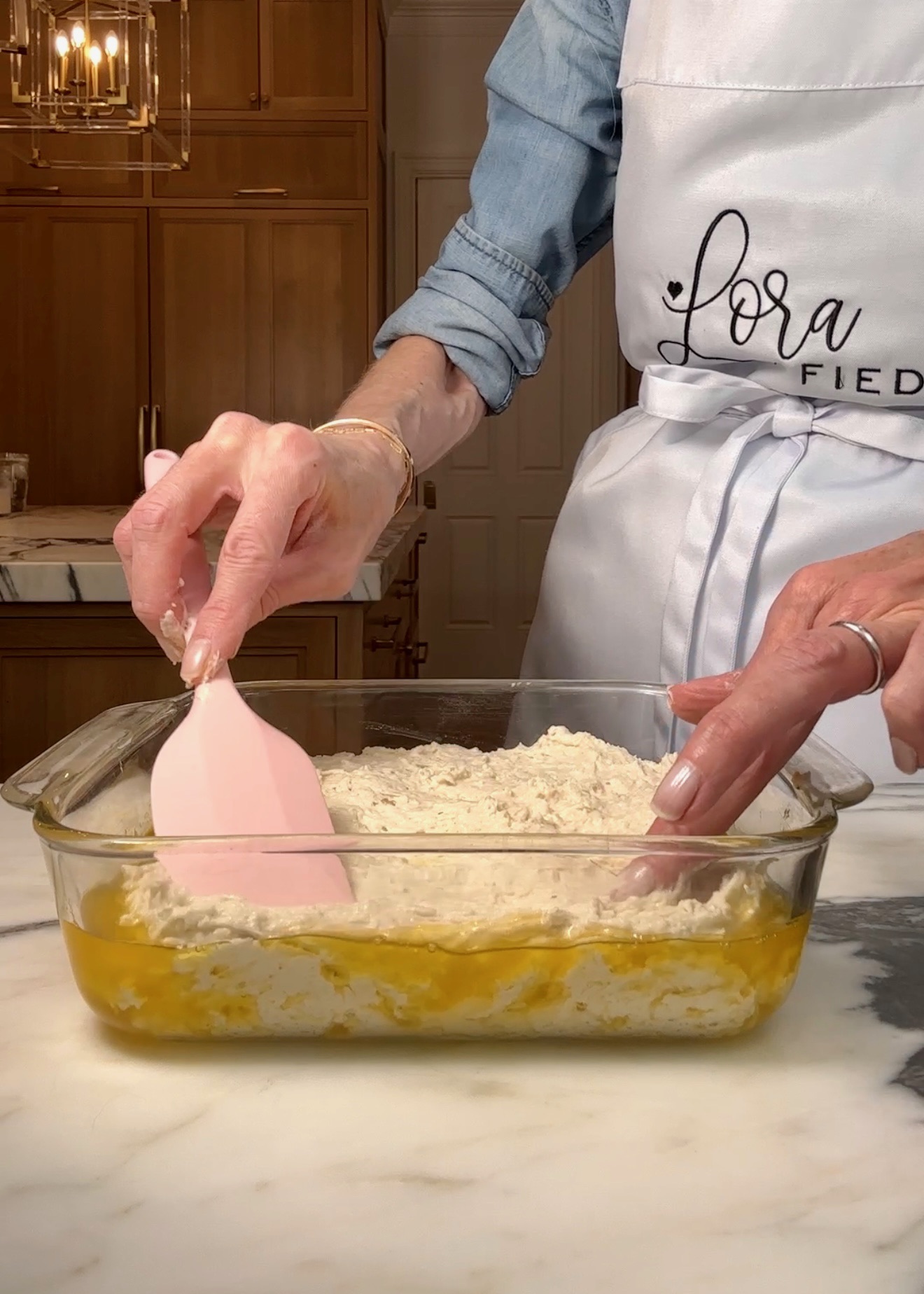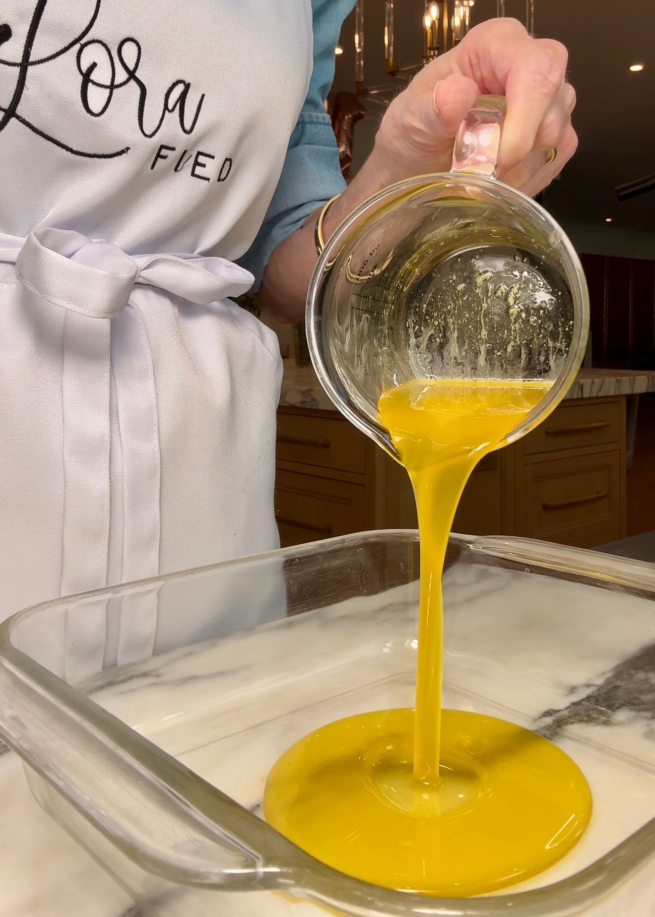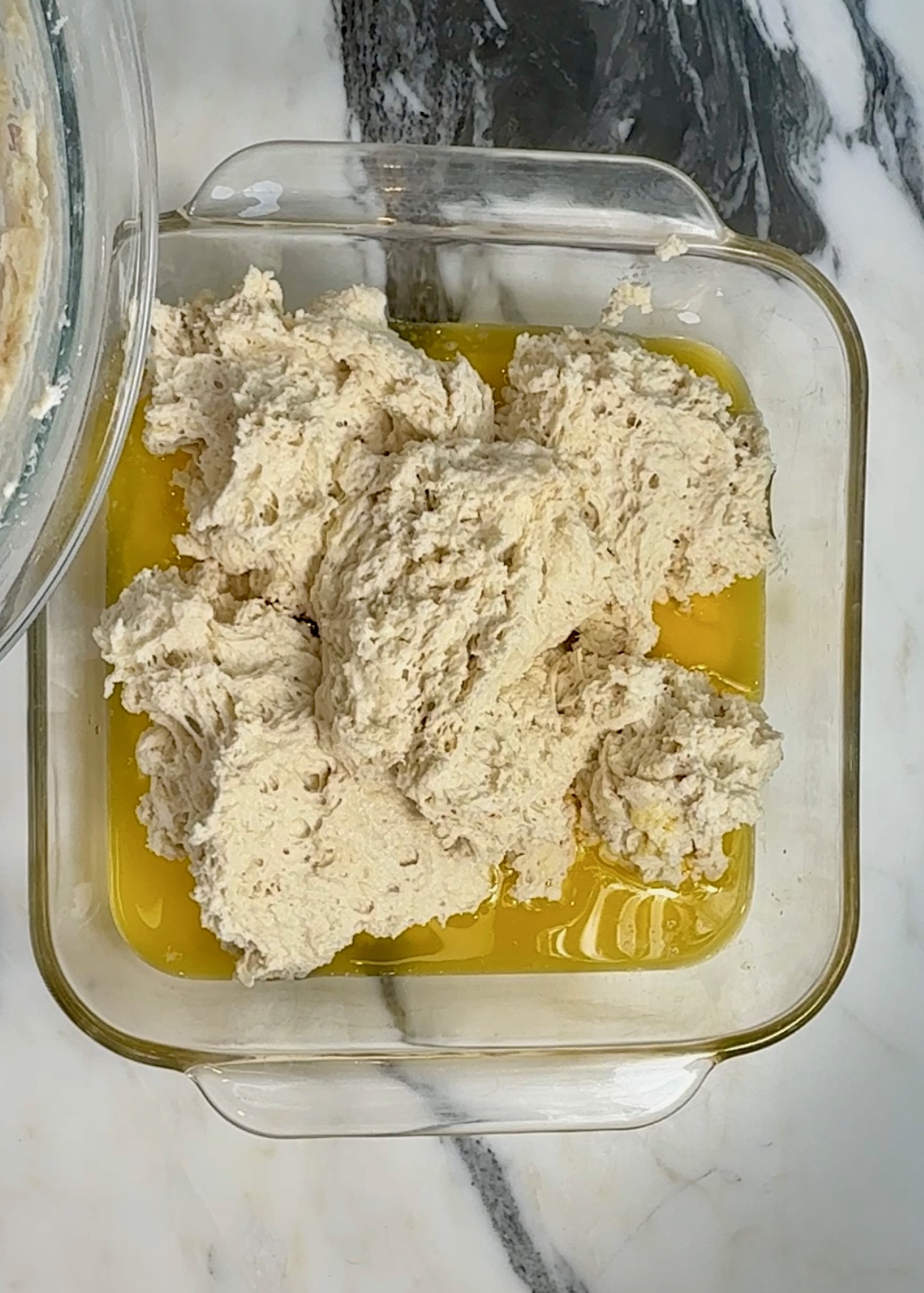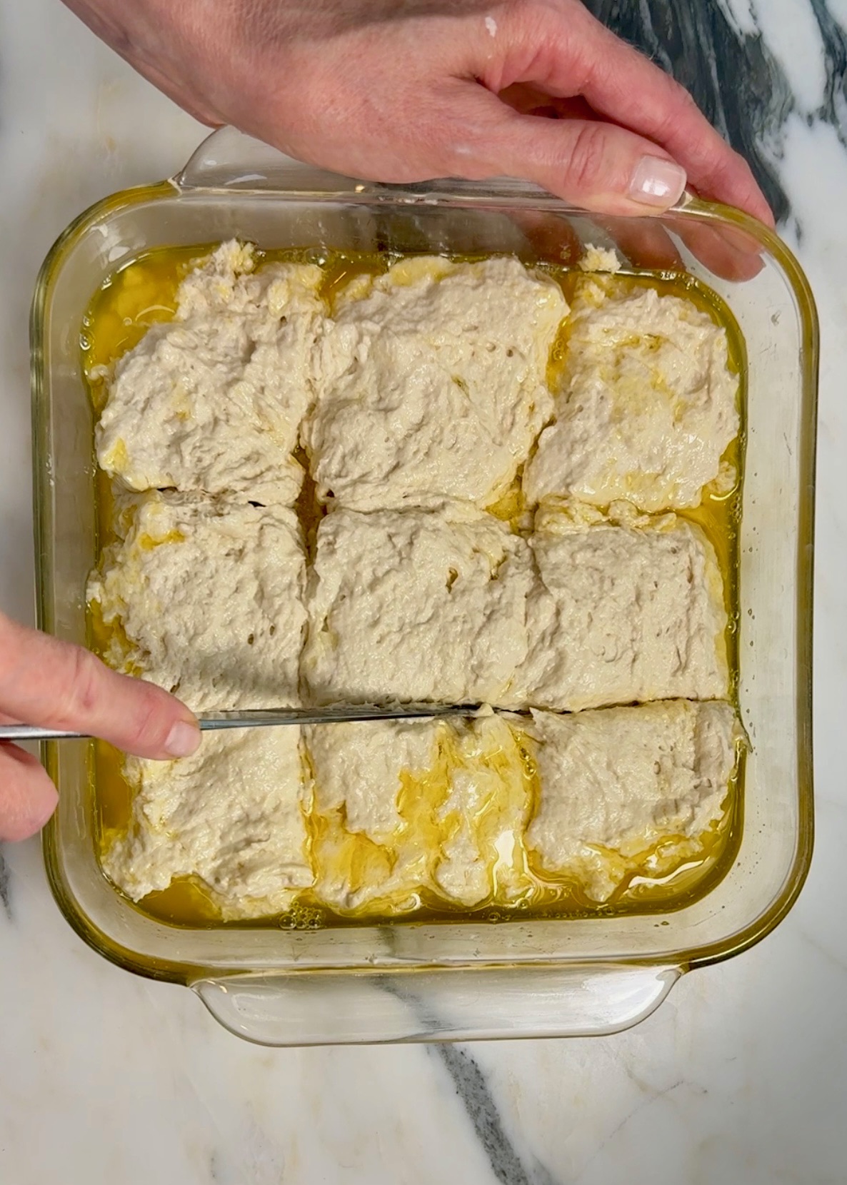 Next up comes the fun part! Melt your butter and pour into an 8” x 8” pan. Using a large spoon, drop the lumpy batter on top of the melted butter and spread. Cut into a 9 square grid pattern letting butter seep in between the cuts.