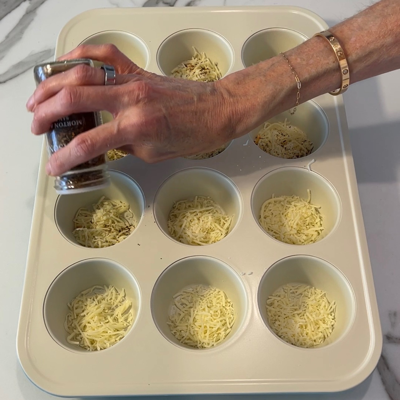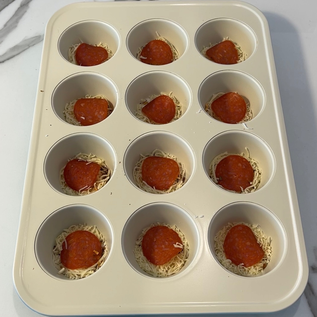 In cupcake pan, place 1-2 T. Shredded cheese in each cup. Italian a seasoning to taste, I sprinkle it like I would to salt & pepper something. Place 1 pepperoni on top of each cup.