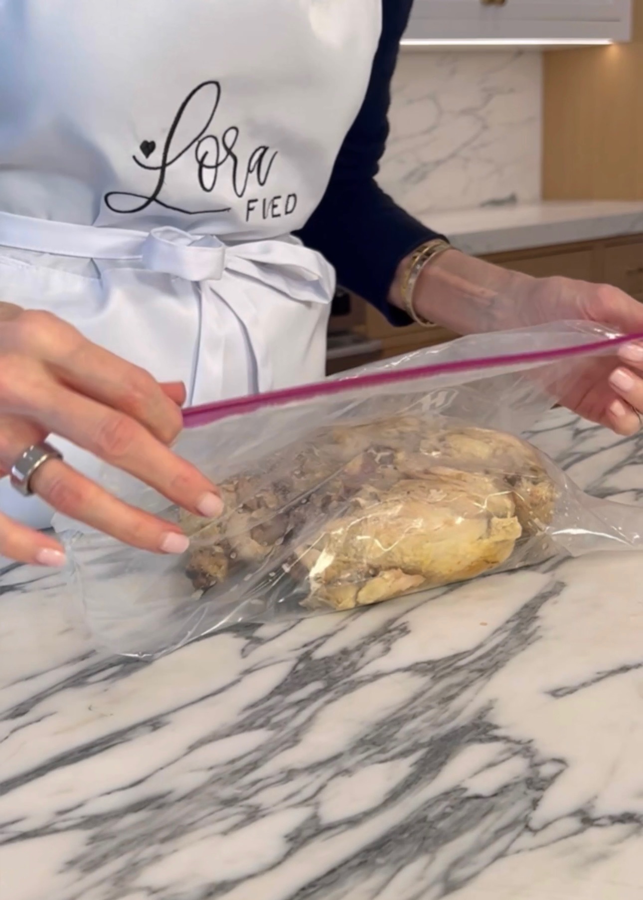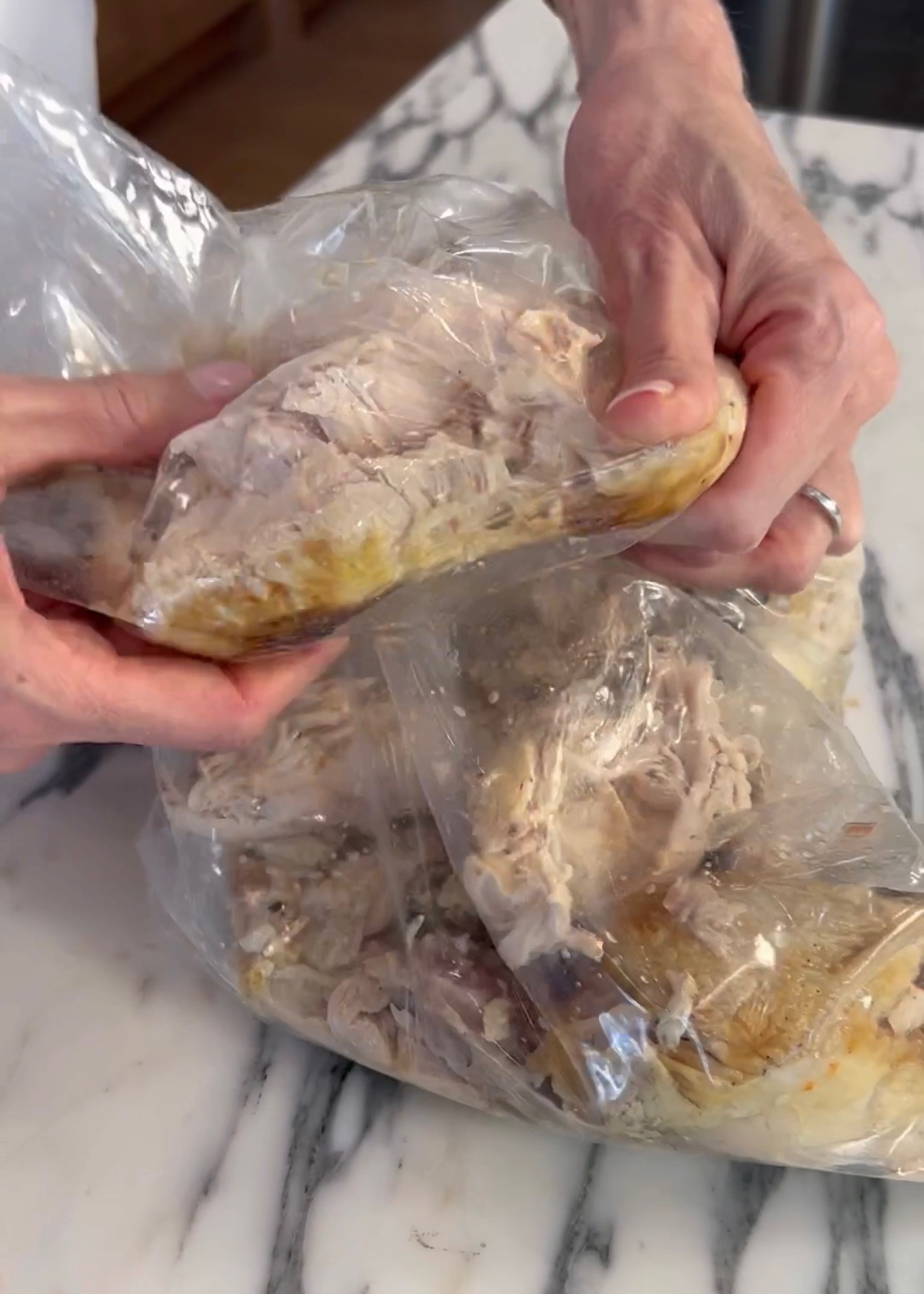 All you need is an extra-large baggie. Stick your warm chicken inside, zip up the bag, and just start squishing. Â That’s right! That chicken will slide right off, with none going to waste.