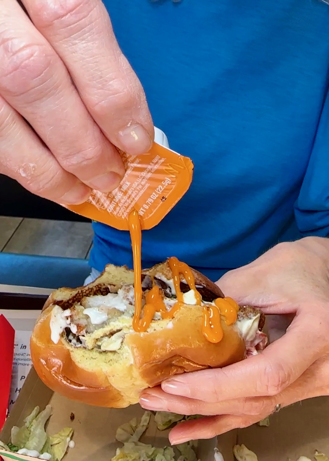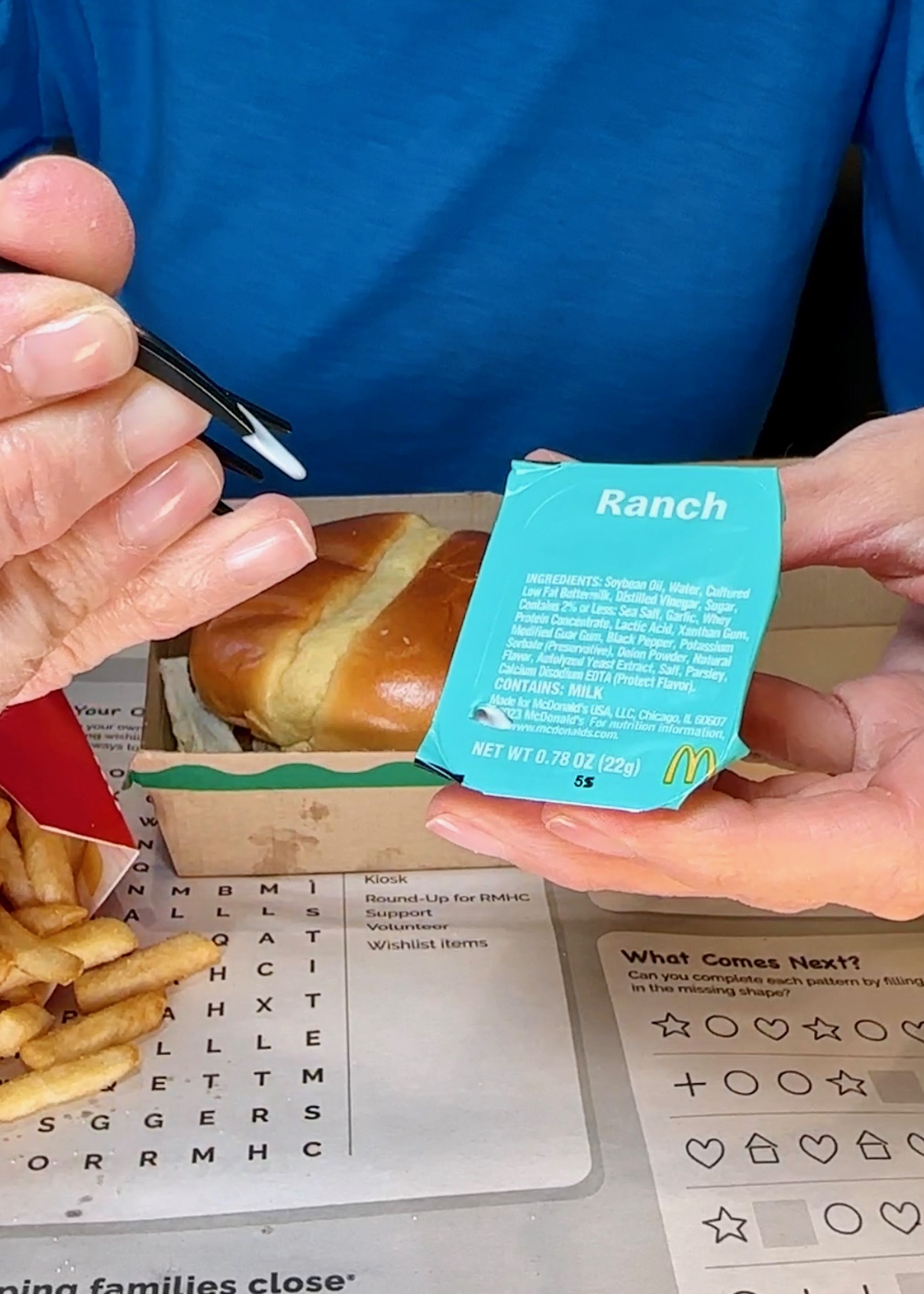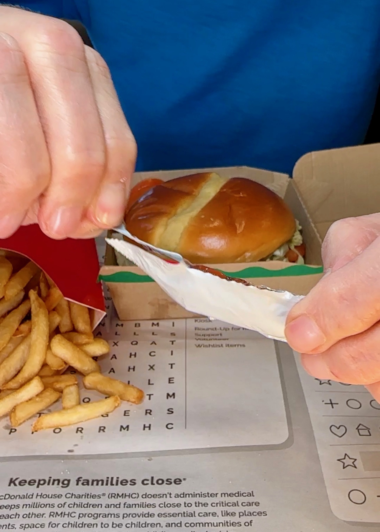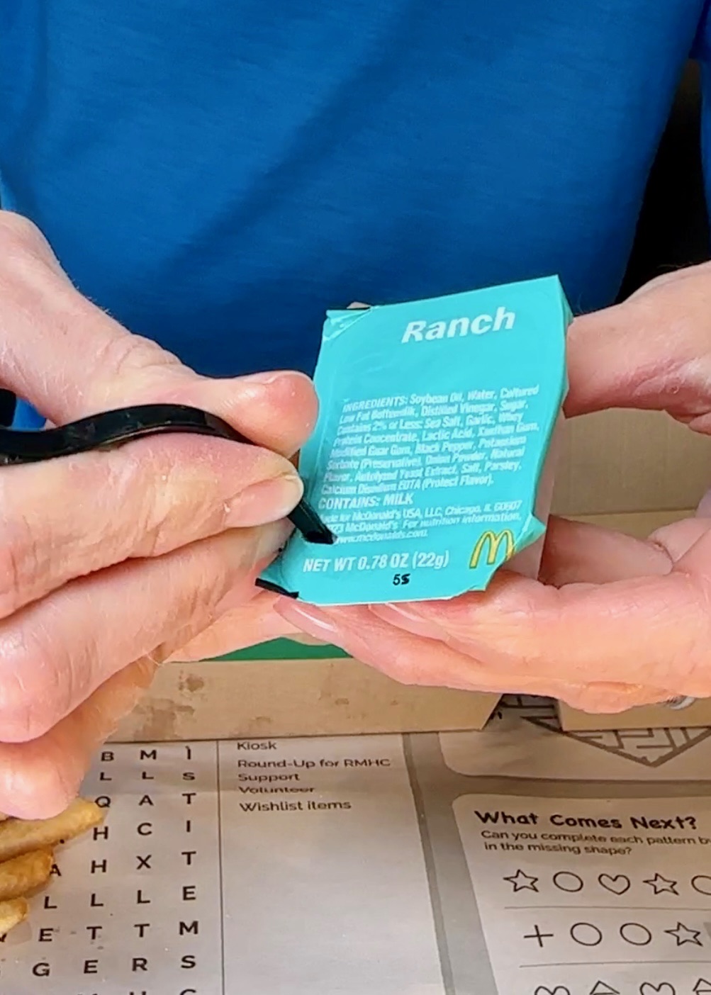 First up is my hack for getting the perfect sauce ratio when you are dealing with a sauce packet. Often times, opening up the packet ends in one big glob of sauce on your food item. No worries because I have the perfect solution! Poke a hole in the corner of your sauce packet (I just used a plastic fork), helping you get the PERFECT drizzle!