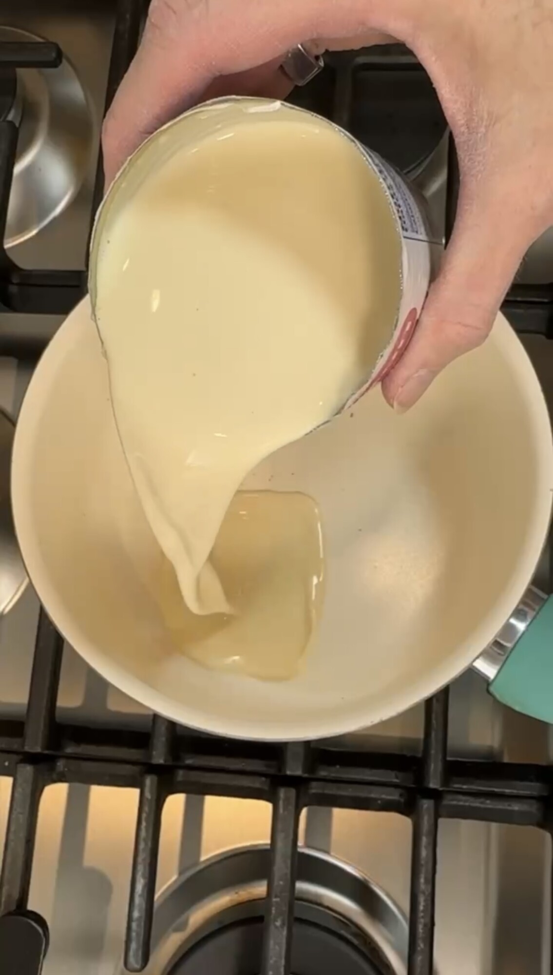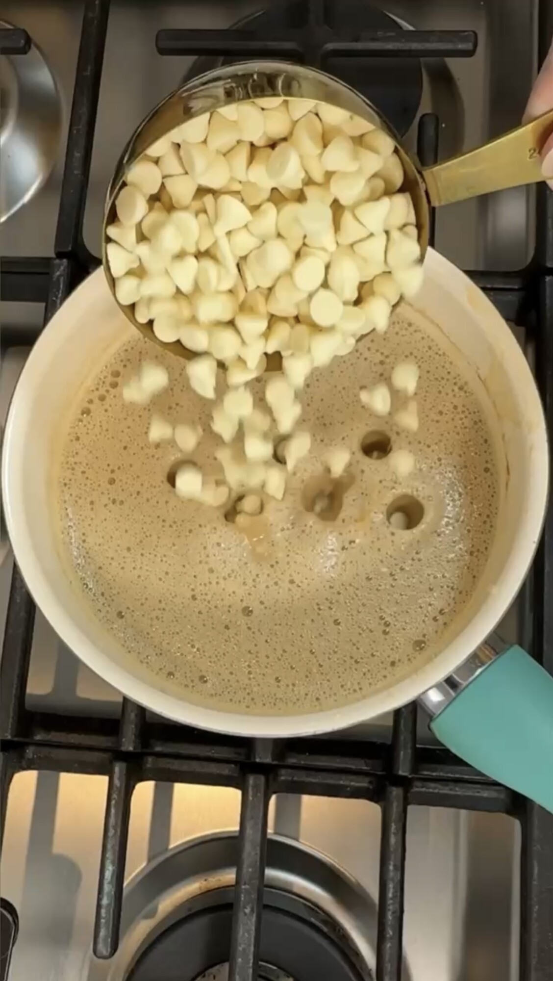 Combine everything in a sauce pan, except the white chocolate chips, whisk until heated and sugar has dissolved. Turn off the heat, add chips, stir until melted. Immediately pour into jar, over heating can cause too much thickening. Store in fridge.