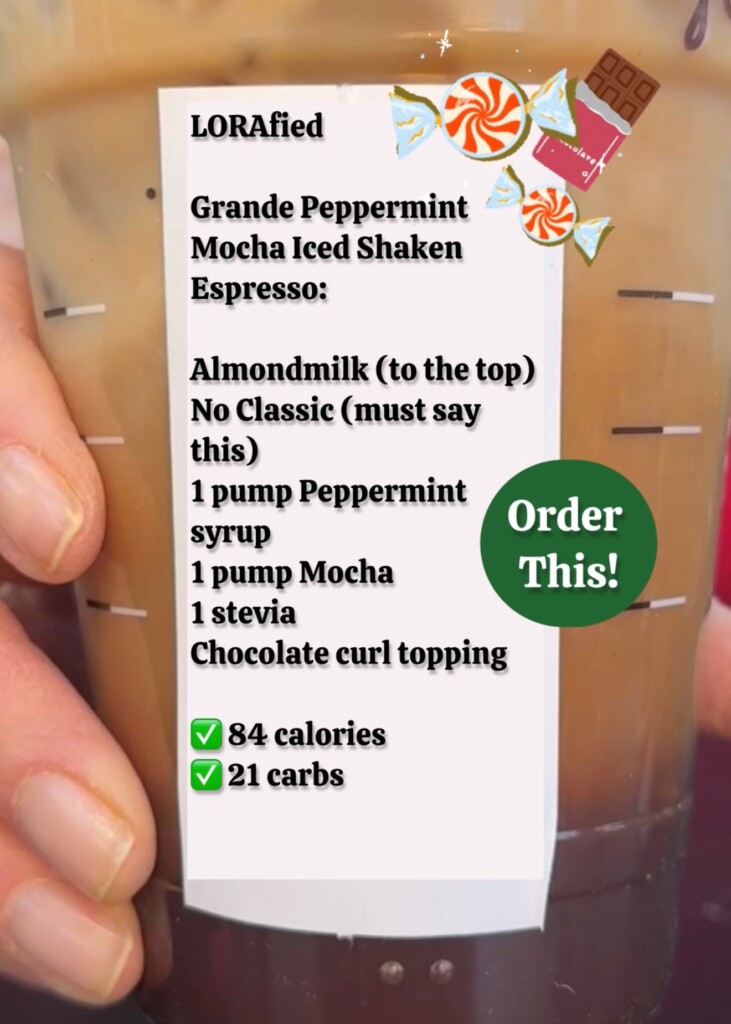 Skip the sugar crash! The classic Starbucks Peppermint Mocha rings in at around 400 calories and 58g of carbs—basically the same as a slice of cake. This lightened-up LORAfied version gives you all the cozy chocolate–peppermint flavor for just 84 calories and 21 carbs. Ask for an Iced Shaken Espresso with almond milk (to the top), no classic syrup, 1 pump peppermint, 1 pump mocha, 1 stevia, and chocolate curl topping. Tastes indulgent, without the sugar overload.