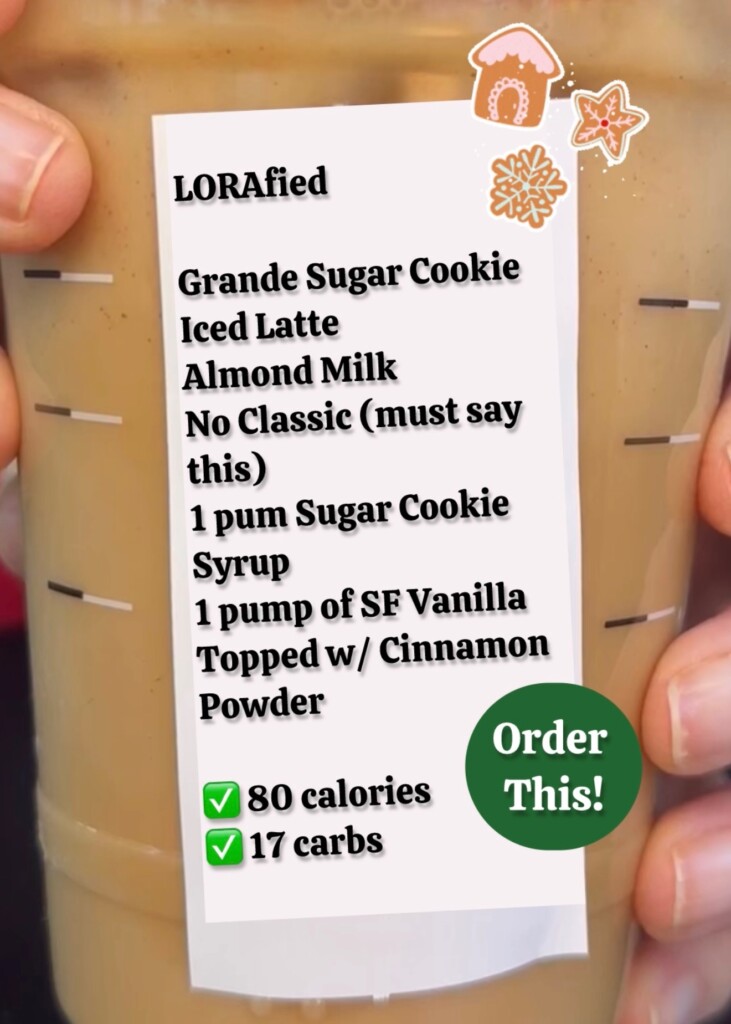 The original Starbucks Sugar Cookie Latte might taste festive, but it packs around 370 calories and 45g of carbs—basically dessert in a cup. This LORAfied version keeps all that cozy, nostalgic flavor for just 80 calories and 17 carbs! Order it with almond milk, no classic syrup, 1 pump sugar cookie syrup, 1 pump sugar-free vanilla, and a sprinkle of cinnamon powder on top. It’s sweet, creamy, and holiday-ready—without the sugar overload.
