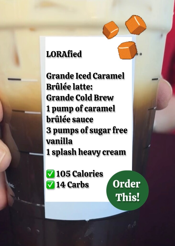 The classic Starbucks Caramel Brûlée Latte can top 420 calories and nearly 50 grams of carbs, but this LORAfiedswap brings all that creamy, caramelized flavor for just 105 calories and 14 carbs. Order a Grande Cold Brew with 1 pump Caramel Brûlée sauce, 3 pumps sugar-free vanilla, and a splash of heavy cream for that rich, buttery taste without the sugar crash. It’s sweet, smooth, and totally holiday-ready.
