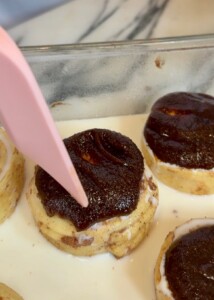 Preheat your oven to 350°F. Unroll and reshape the cinnamon rolls, then pop them into a greased baking dish. Pour your coffee creamer right over the top! You want a little “creamer lake” around them ☕️