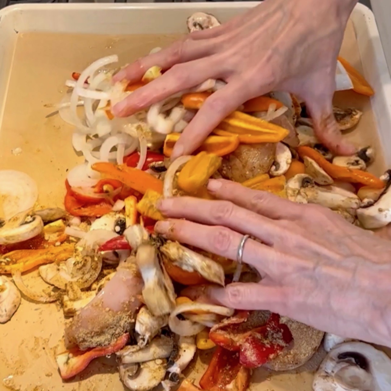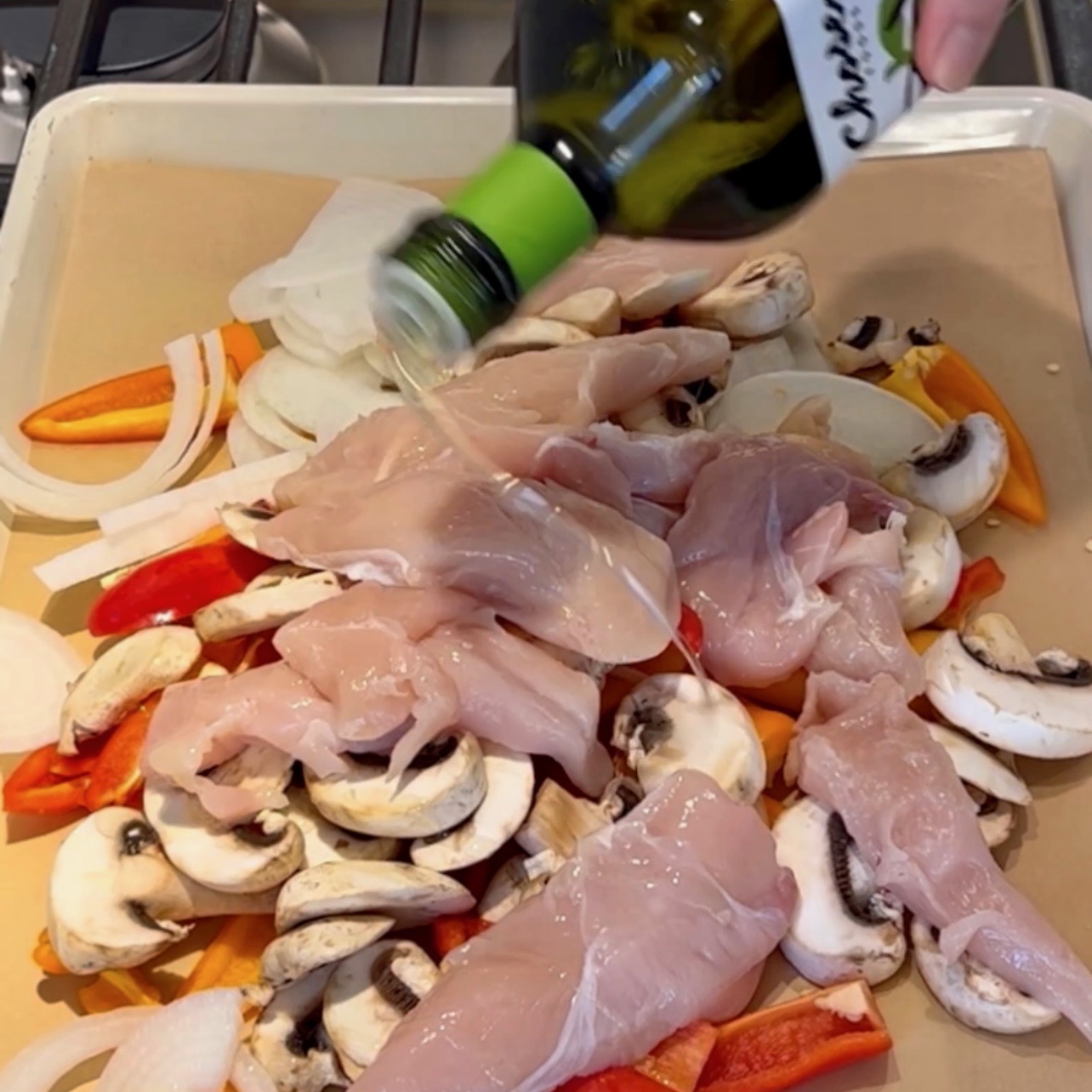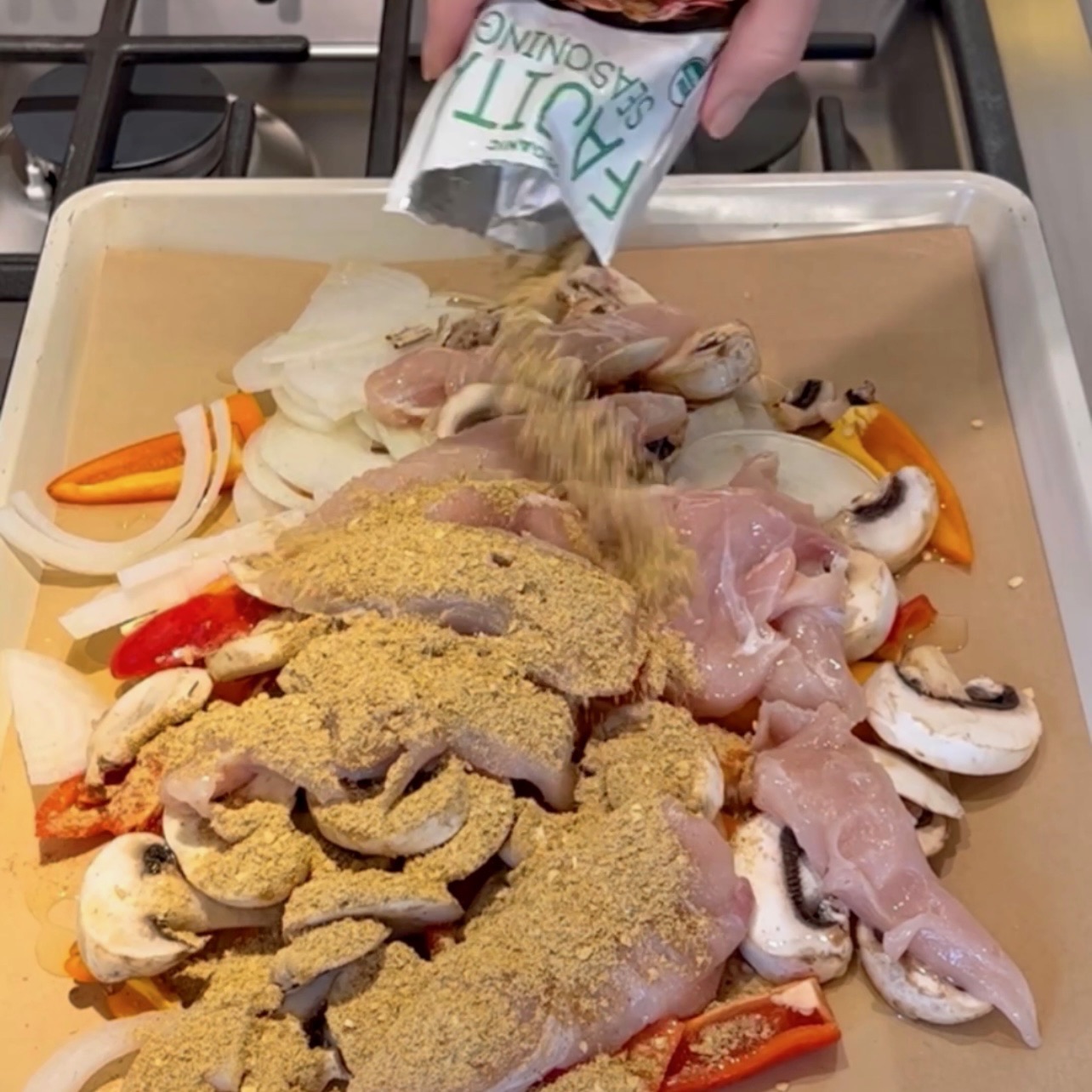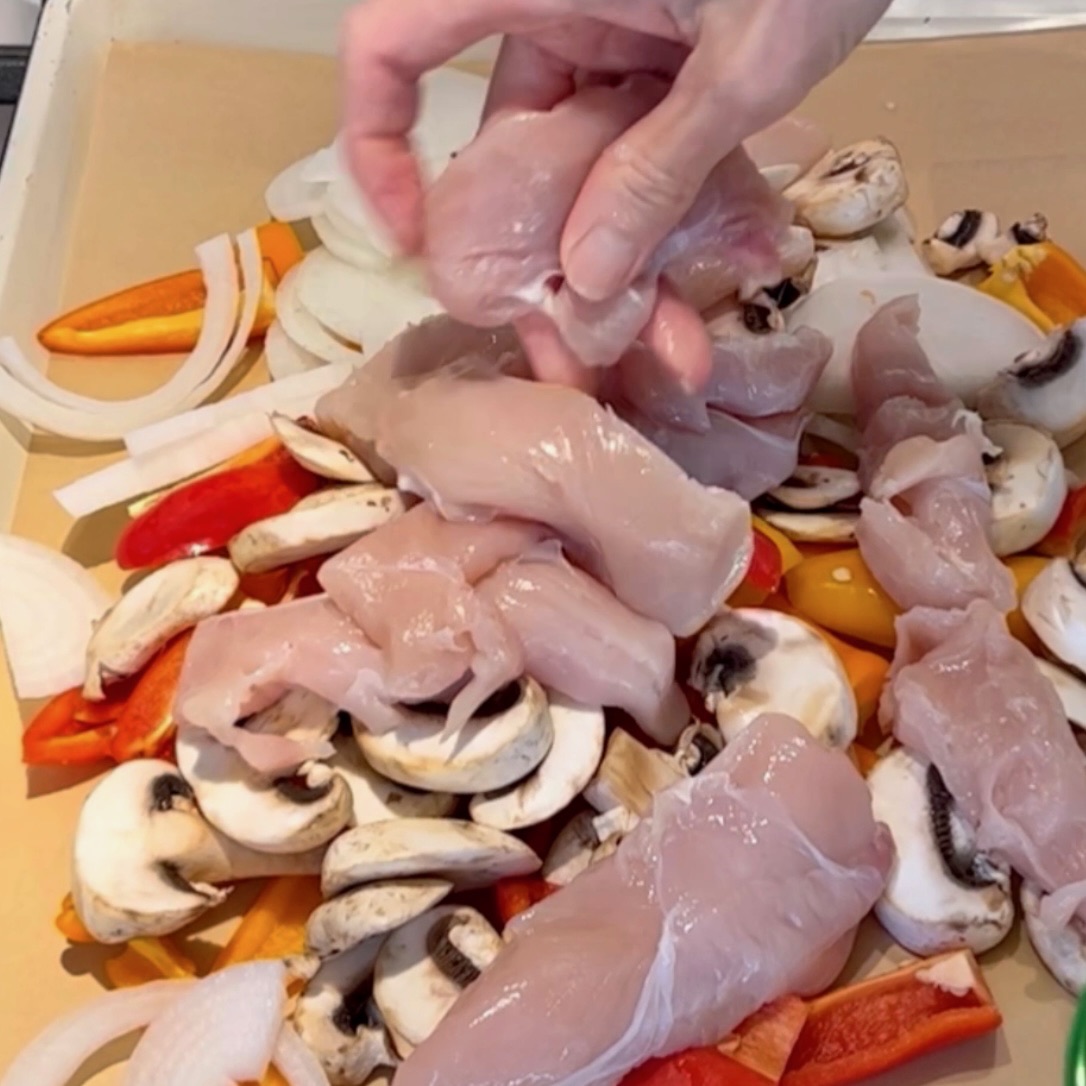 Slice onion and sweet peppers, place on bottom of pan along with mushrooms. Top with packet of chicken tenders and sprinkle fajita mix on top. Drizzle heavily with avocado oil and toss with your hands, making sure everything is well coated. Bake at 375F for 20-025 minutes depending on your oven.