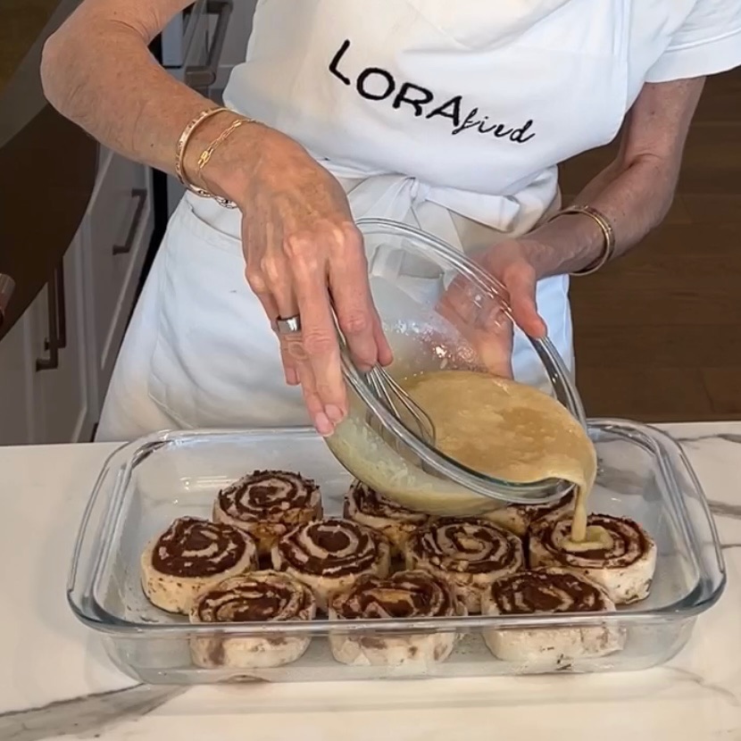 Spread the cinnamon rolls in the pan, leaving a little room between each, then, mix brown sugar and cream together and pour evenly over the top. Bake for about 30 minutes, you don’t want to over bake, so make to sure keep an eye on them and check around 25 minutes.