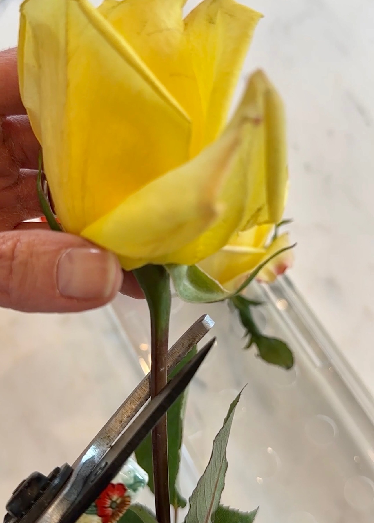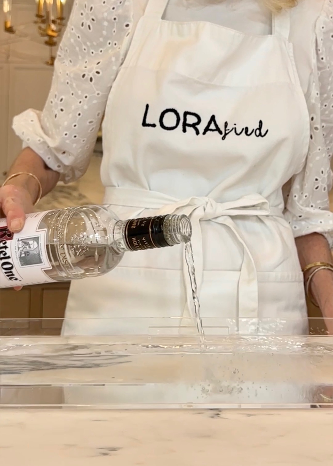 First, grab your vase and fill with water. A quick tip is to pour a little vodka in your water if you are out of flower food.