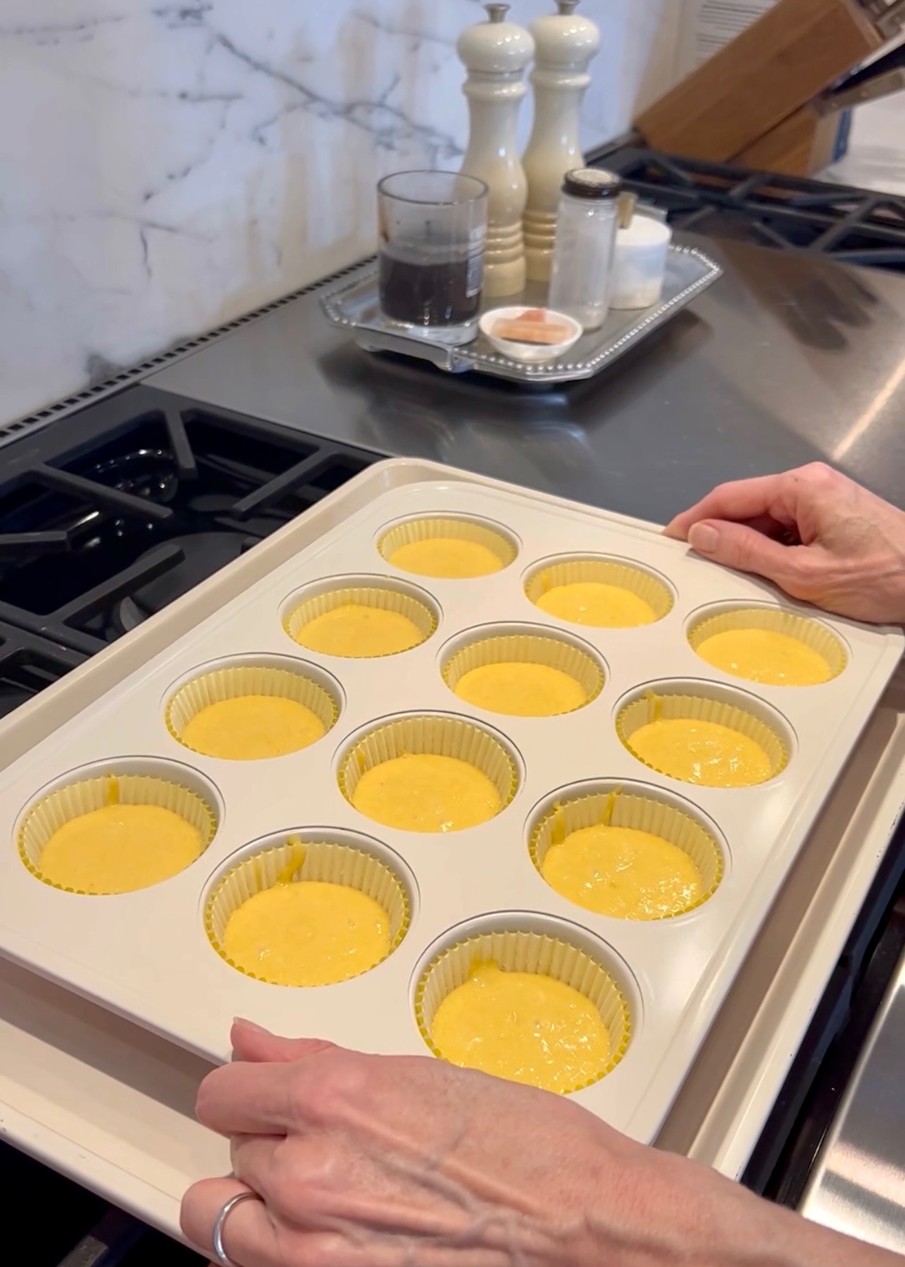 Start by preheating your oven to 350F. After scooping the filling into your muffin tin, try this hack: Place your muffin ban on a baking sheet in the oven to keep from burning. Bake for 18 mins (Baking time will vary based on your oven)