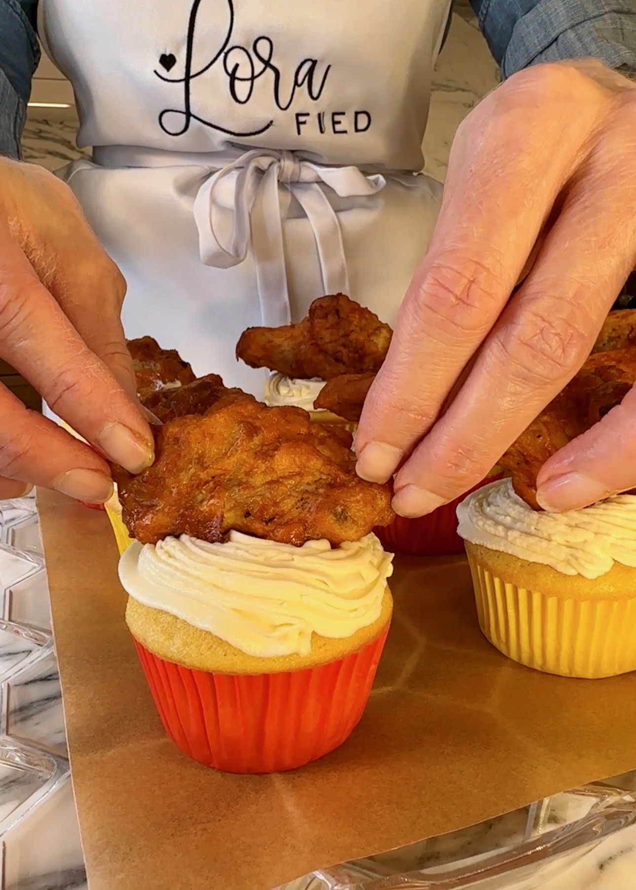 This last step is what makes this the greatest game day snack hack EVER! Any wings work here so go with your favorite flavor. I used frozen, but you can make your own or pick up premade. Simply top your cornbread cupcakes with those wings! I added honey on top for an extra touch.